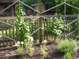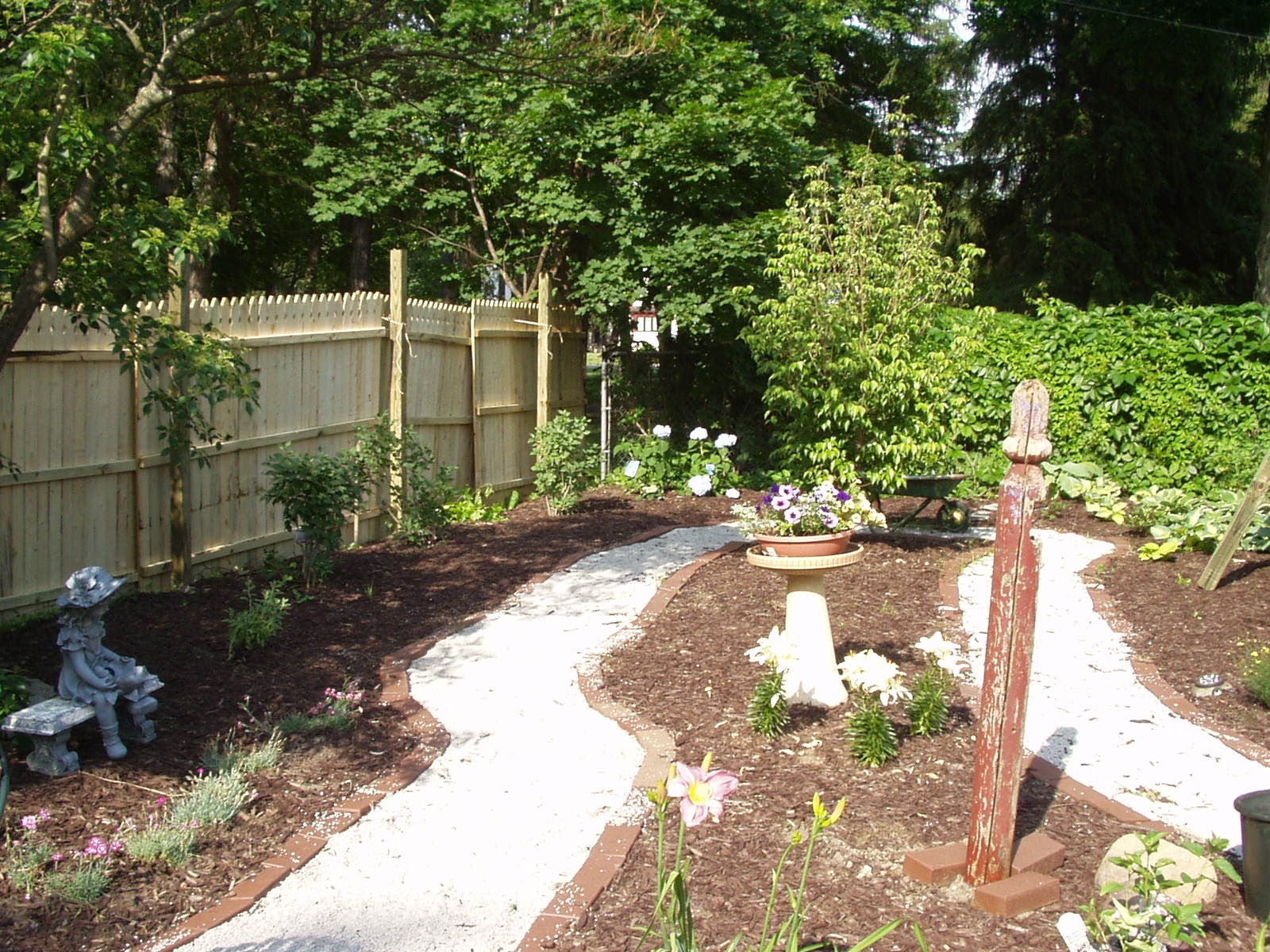 We’ve had almost a week of rain and everything is lush. The kousa dogwood went in last week. I think it is suffering from shock. All of the leaves seem a bit limp and the ones farther up on the tree are either brown around the edges, or curled and dried. There are exactly three blossoms on it. I’m hoping that all the rain we’ve gotten will help it make the transition easily. Below is a picture of the tree. You’ll notice that the new fence is in the process of going up. The handyman should finish it tomorrow. At the moment it is tied to the fence posts so that my back yard isn’t open to the park. It’s an illusion of security and privacy.