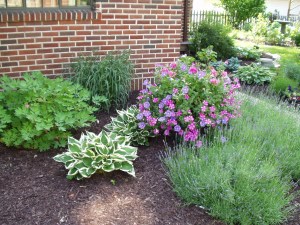 And this little bed by the back door is doing very well, although I suspect the patriot hostas need to be moved. I really need to put more hostas under the magnolia tree in the front yard, so I might just remove these and plunk them there. They will make a nice contrast with the francis williams hostas that are there now. I need to plant a few more hidcote lavenders in this little nook. The spider lily is a left over from the previous owner. I was going to kill it, and I may still, but for the moment it lives and contributes to the blues in this bed. I moved the basket from the front step to the bird bath back here and replaced it with a basket that went better with the marigolds in front of the boxwoods. Lush as this basket was, it simply didn’t go with the other colors in the front. It took me a couple weeks to figure out why I didn’t like the blue and pink petunias and geraniums in that spot. Then it hit me that it was the color that wasn’t right.