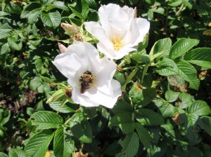 This bee seems to be in rose heaven as he nuzzles the pollen from this wild spice hansa.