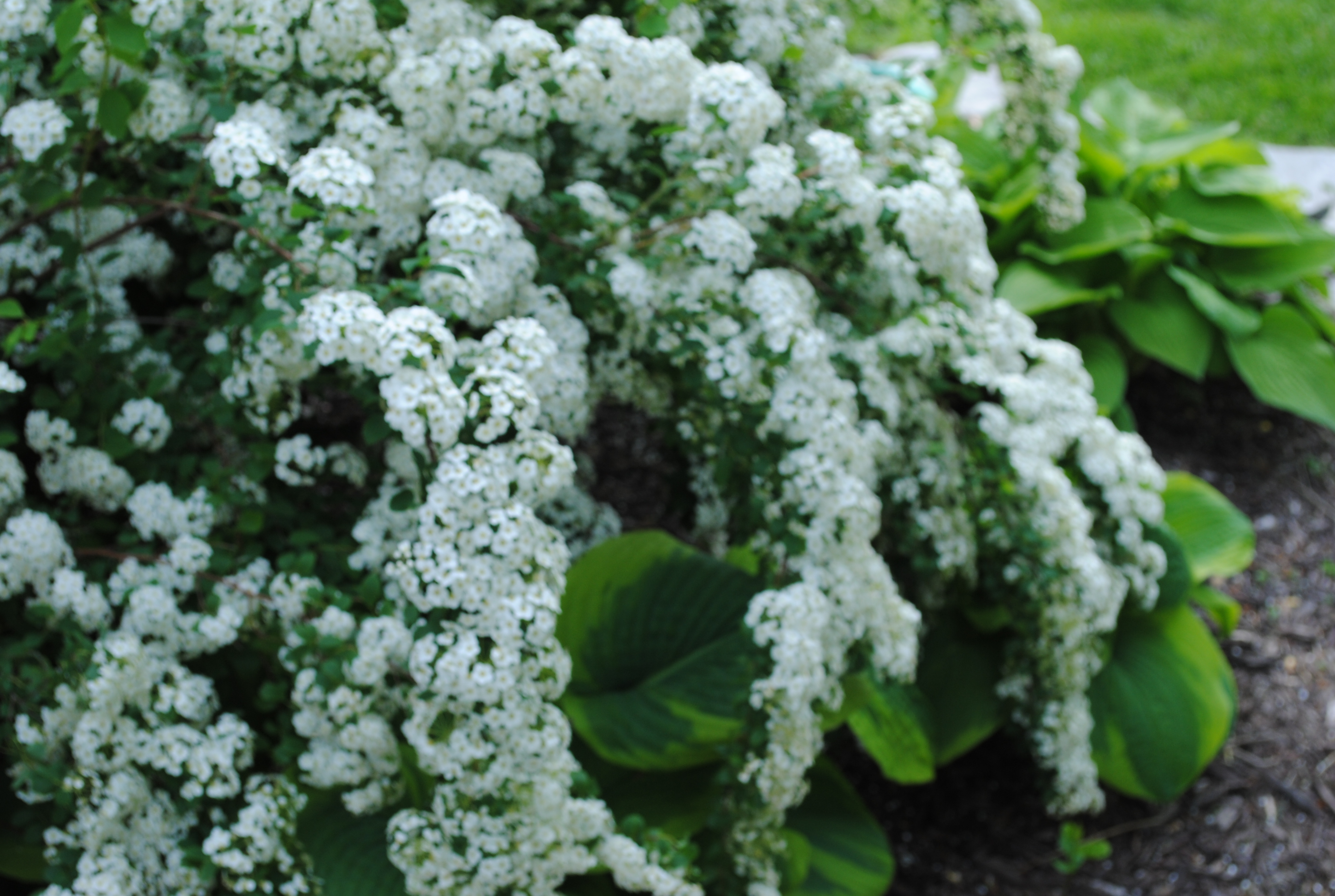 The old spirea is still going strong, and the Francis Williams hostas are holding their own despite the fact that they are surrounded by trailing arches of white.