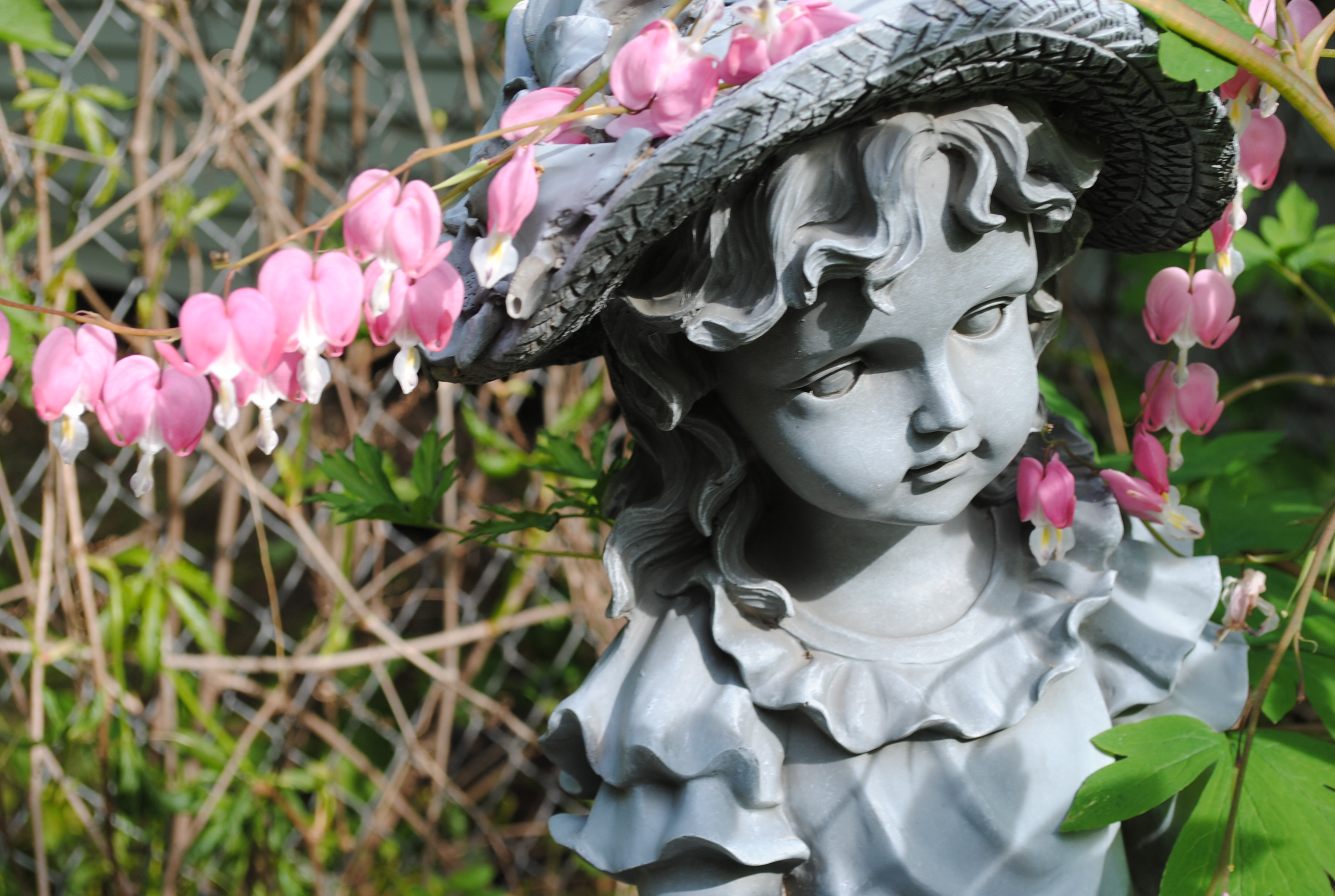 The Bleeding Heart (dicentra) are starting to fade, but one tendril of blooms trailed over the hat of this little statue that was a gift when I retired from public school teaching. I bought the plant at Meijer Gardens two years ago.