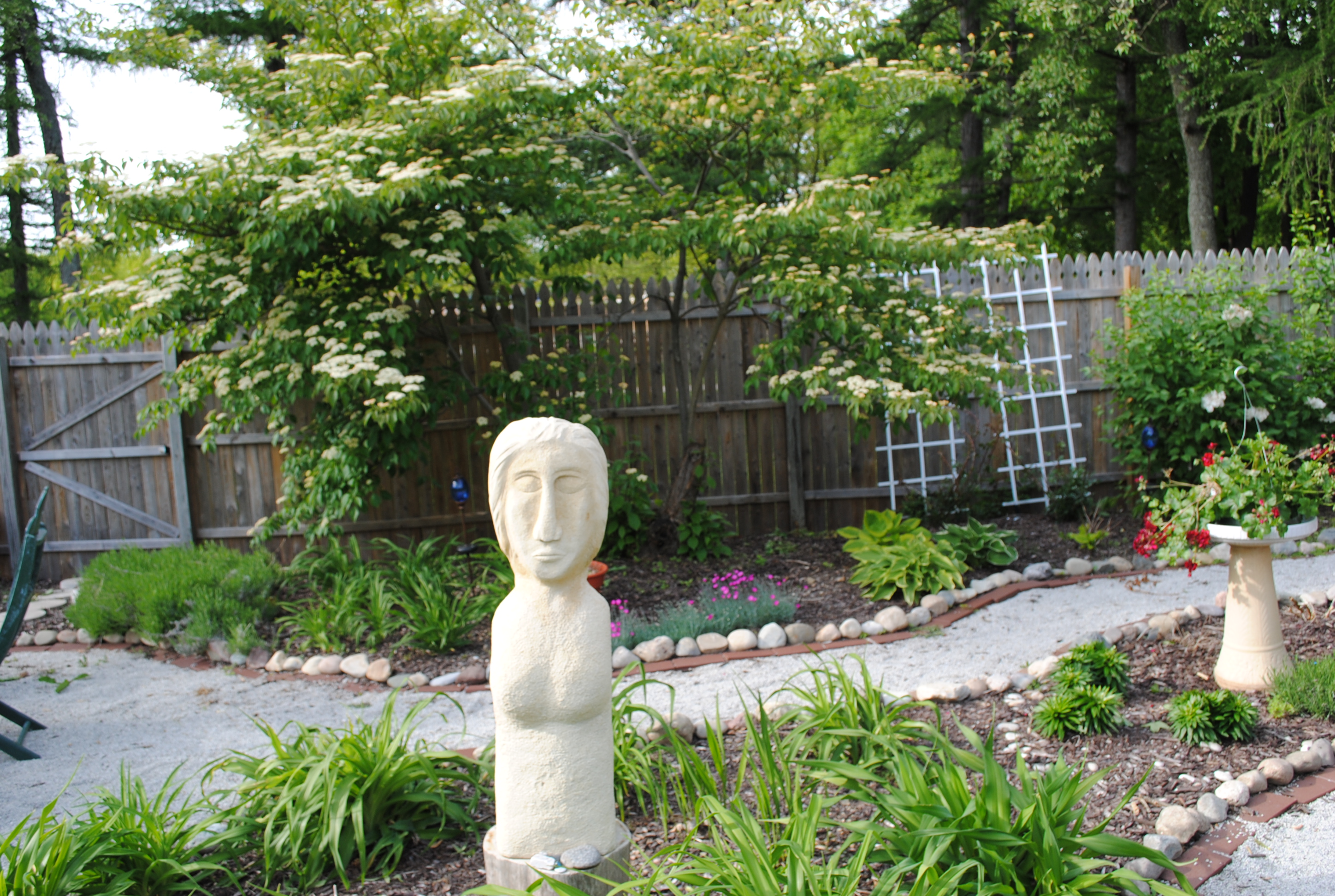 Near the lilacs is the big old dogwood. It’s blooms look like those of a red twig. It may be as old as the house, which means it got its start in the 1920’s. The old girl makes a perfect backdrop for the Garden Lady statue. In the distance behind the Lady are the Cheddar Pinks that have been planted and transplanted several times.