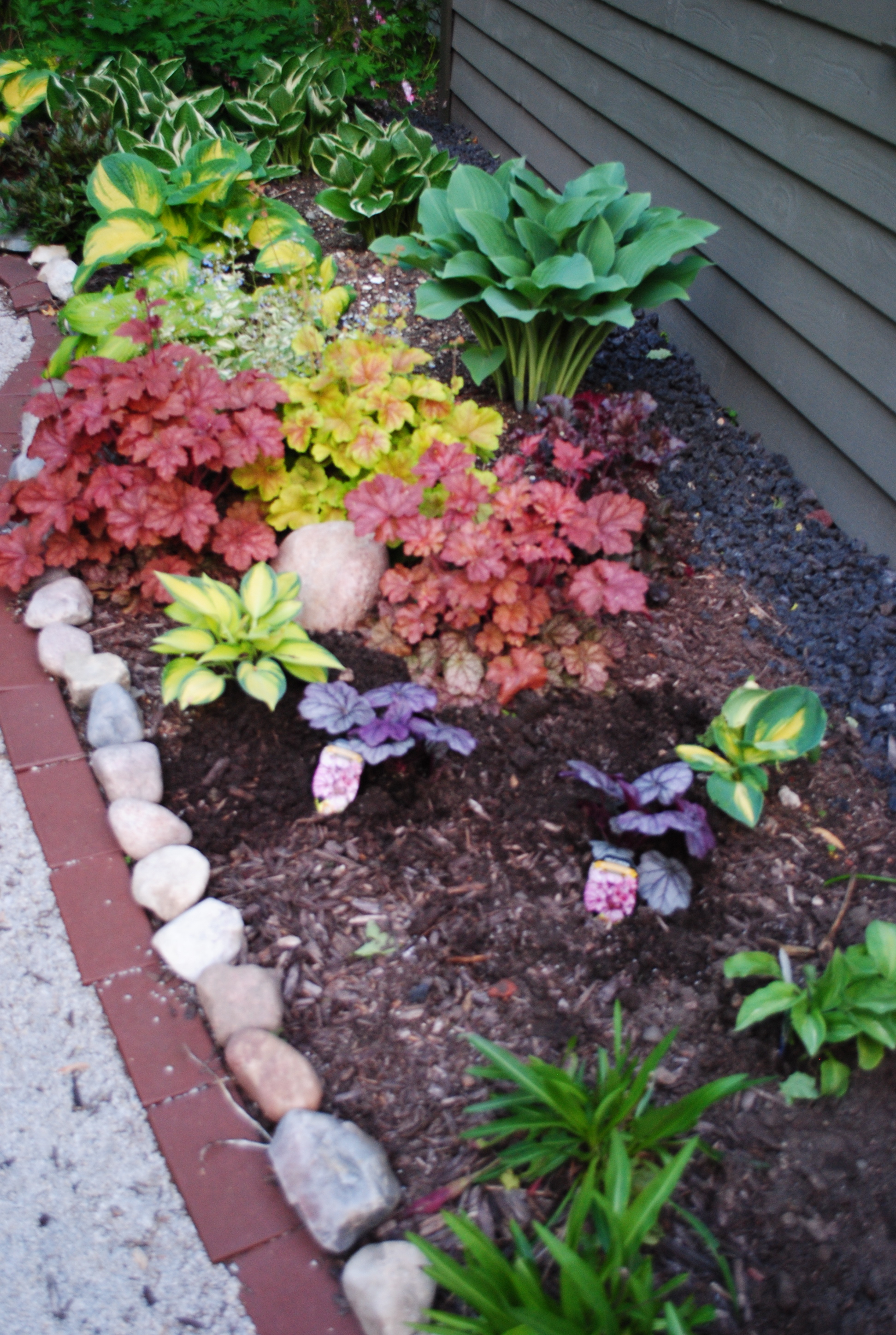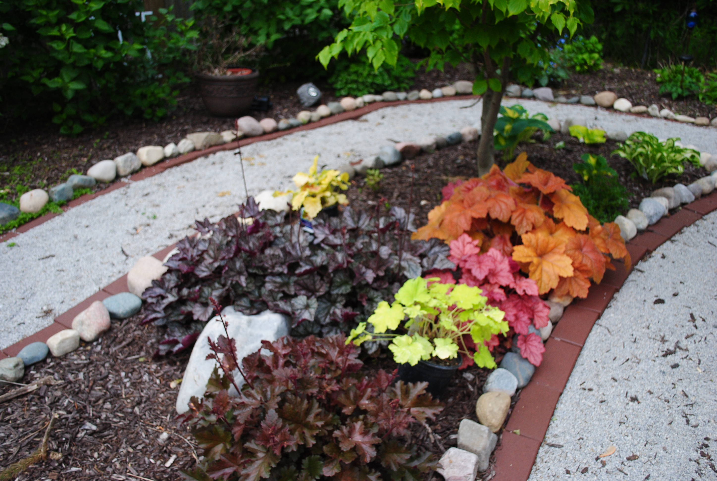 But the bed of heuchera in the secret garden is thriving. I decided two years ago to plant only varieties that have food names: Ginger Ale, Peach Melba, Chocolate Swirls, Lime Rickey, etc. I have some Palace Purples in front, and I planted one Encore a year ago in celebration of my yearly recital. But today I picked up two Plum Puddings and another Peach Melba. This is such a silly conceit.