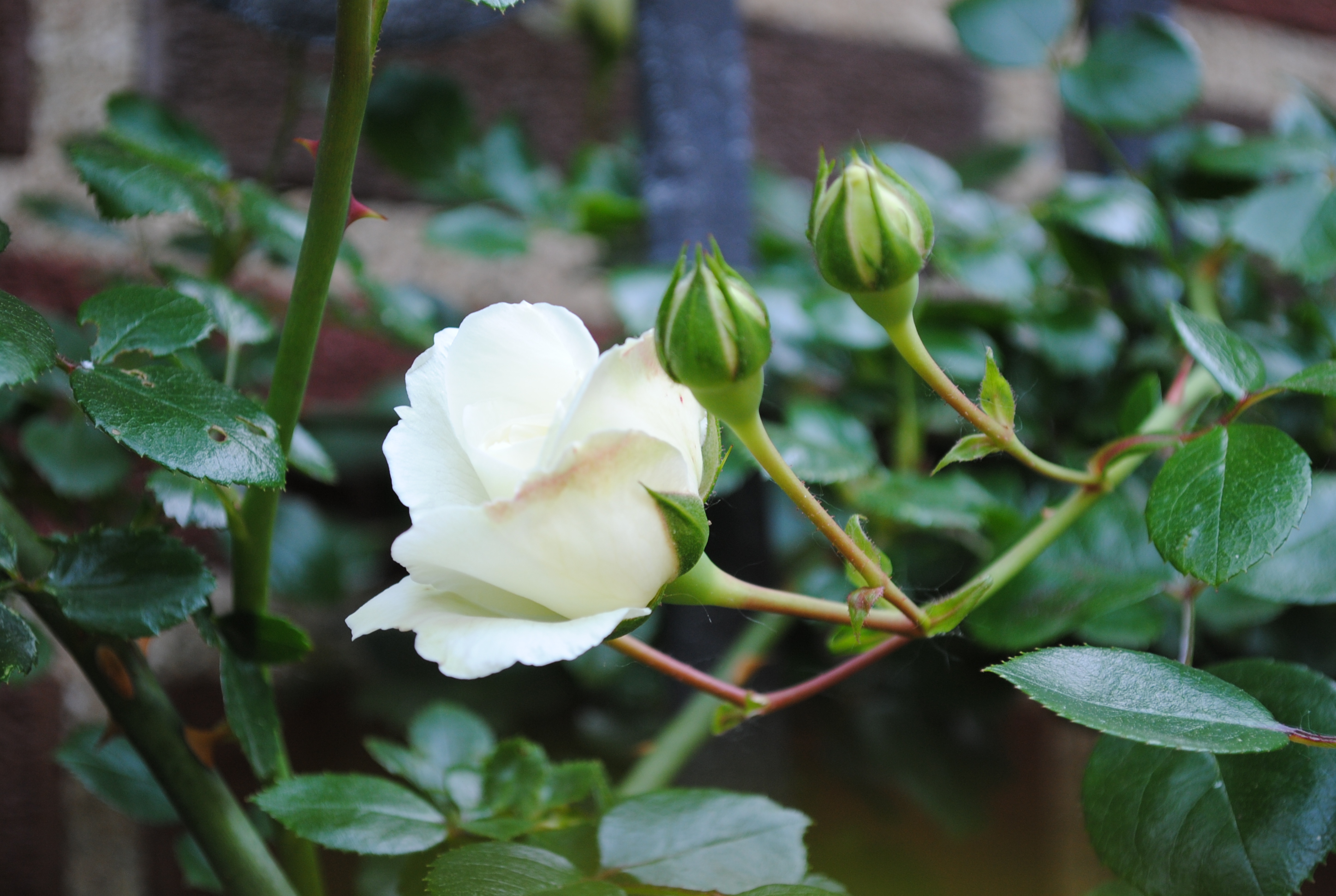 The White Dawn climbing rose has started to bloom. I love the little tinge of pink that lingers after the rose opens. The buds are quite pink initially. But that fades into a creamy white. But just a little bit of pink lingers underneath at least one petal.