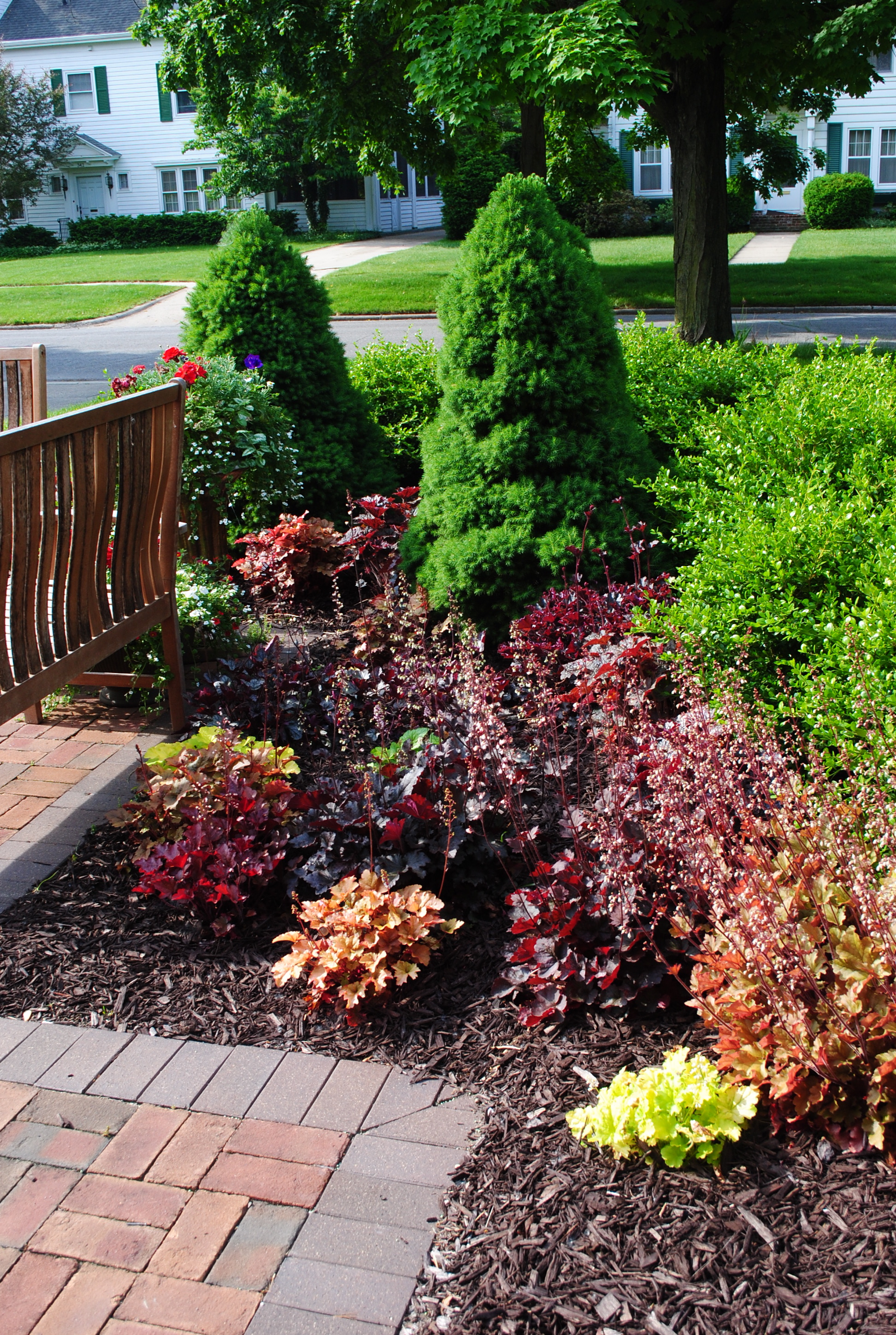 Don’t the Dwarf Alberta Spruce look good. They were planted that first summer and even though the rickety benches blow over against them sometimes when the wind picks up, they stand unbowed. Or would that be “un-bough-ed.”