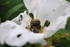 They are doing it right there in the middle of Wild Spice. In broad daylight. And, you can tell they’ve been snacking between, um, sessions. It’s too breezy to spray, and I haven’t noticed that spraying does much good. And, spraying can kill bees. I’ve tried picking these things off and stomping on them, but they take flight before I can commit beetle-cide. Anybody have any suggestions on how to minimize Japanese Beetle visitations? I’ve read that traps only seem to attract more beetles.
