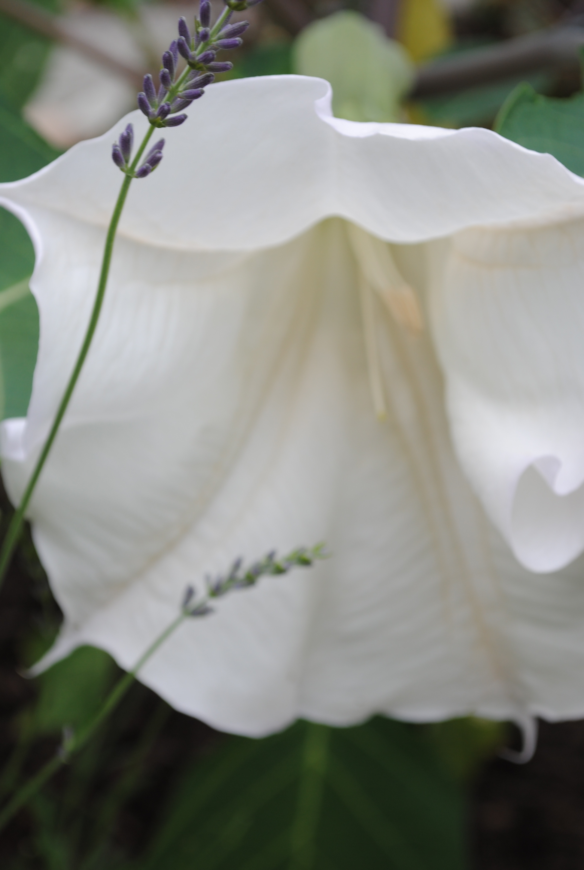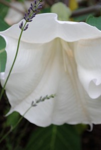 The Moonflowers (Datura) are blooming every night now. This one was completely open last night. My niece and I craned our necks to get a glimpse of the city fireworks display, but the Moonflowers were really far more impressive.