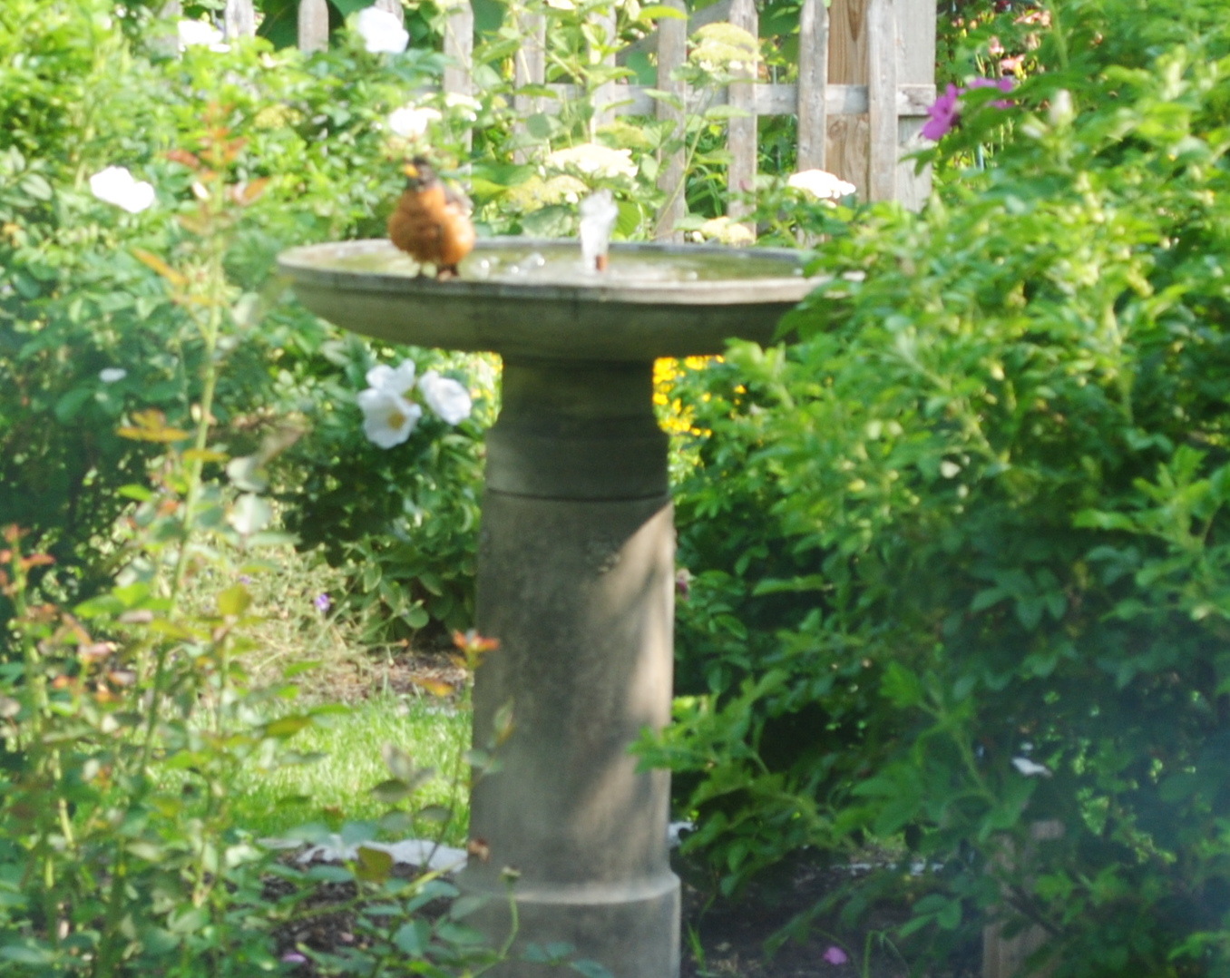 I do love watching the birds come to the fountain, even when they are only common house sparrows. The robins, though, love the fountain. I’ve seen as many as four standing in the water, ducking under and ruffling their feathers. It’s spa time for robins, perhaps. Other birds politely sip. Robins bathe.