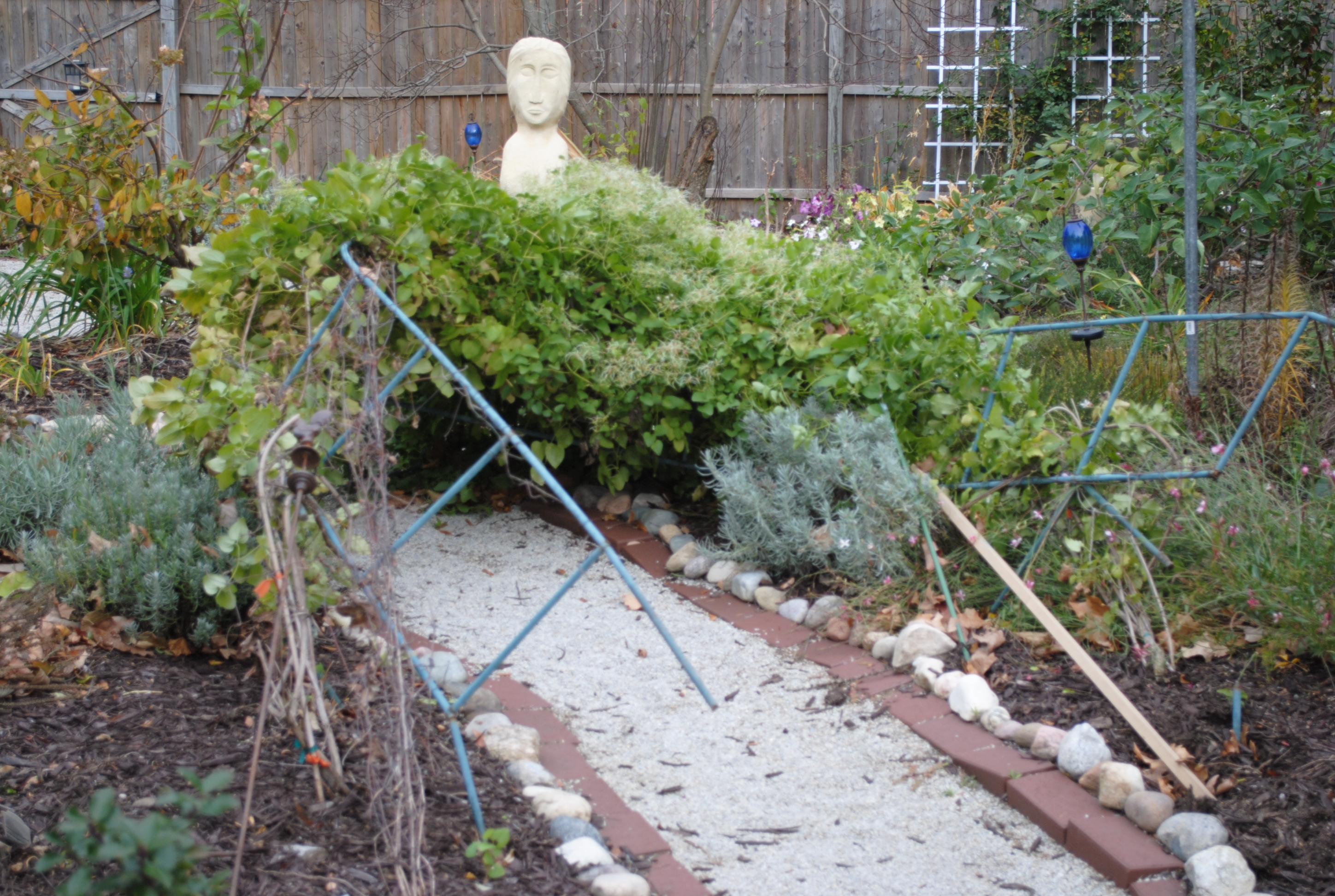 But the big news is that the hurricane force winds we experienced last week blew over the two aluminum arches that form the entrance to the Secret Garden. The winds snapped one of the “legs” of the first arch, though, it was bent and weak already. The two different kinds of clematis that arches supported are fine. But, the weight of the clematis makes the arches too heavy for my to set upright. I’ve asked a friend to help me, but I don’t know when he will have time. And, it’s COLD.