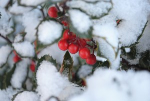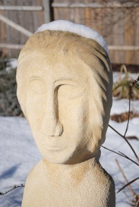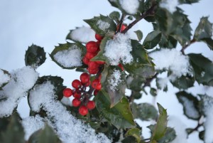 The Hansa rose hips add a nice touch of color this time of year. I wondered if the squirrels would nibble at these, but so far they’ve not shown much interest. Perhaps the cracked corn that I set out for them and the birds is more tempting. Or perhaps it is merely more convenient. I can also just see the bright red holly berries over by the garage. I couldn’t resist taking a picture of the Garden Lady wearing her Juliet cap of snow.