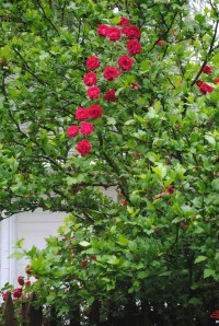 The deep crimson is the old climbing rose that has grown tall and sturdy through the branches of the rose of sharon. What a pleasant and unexpected surprise.