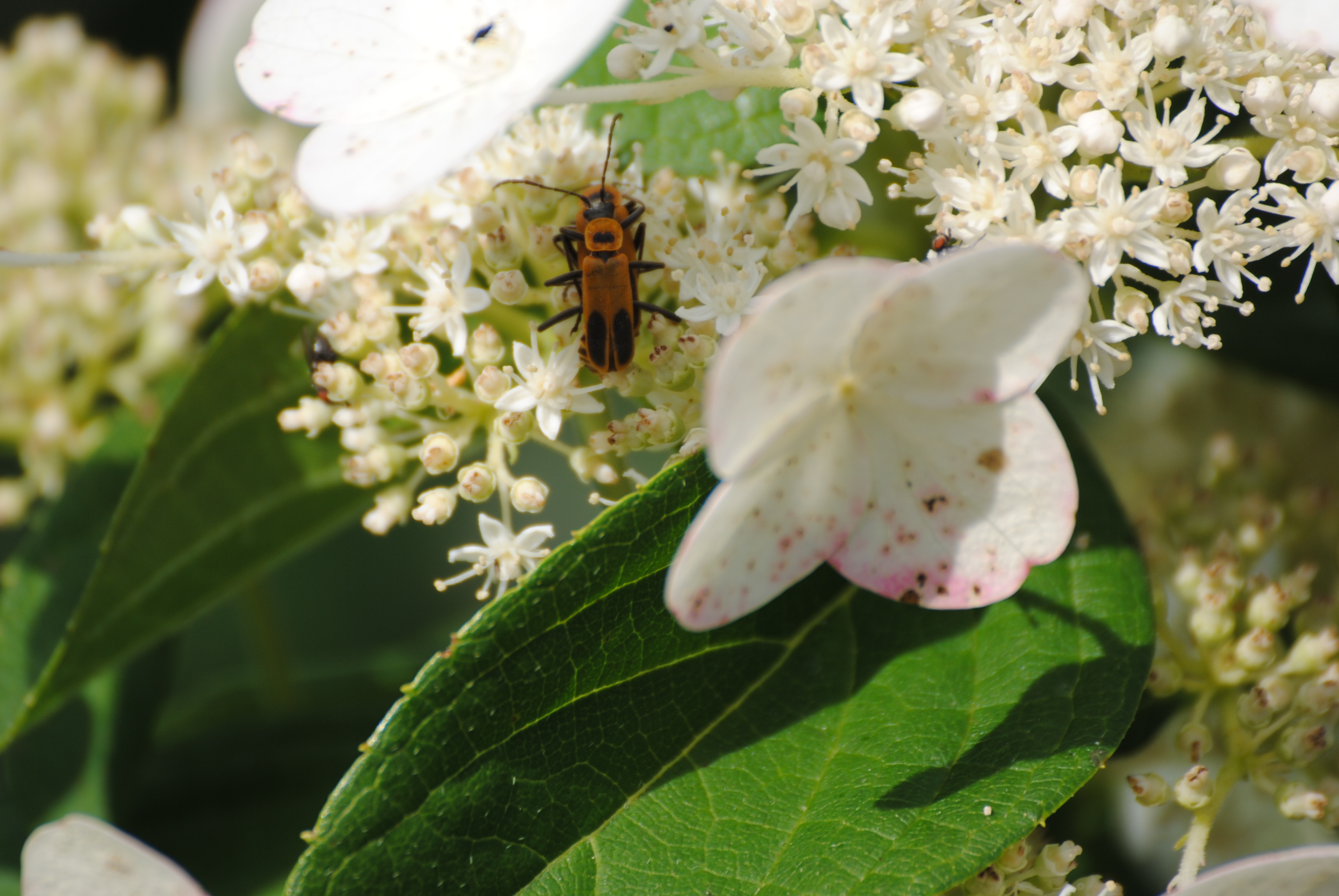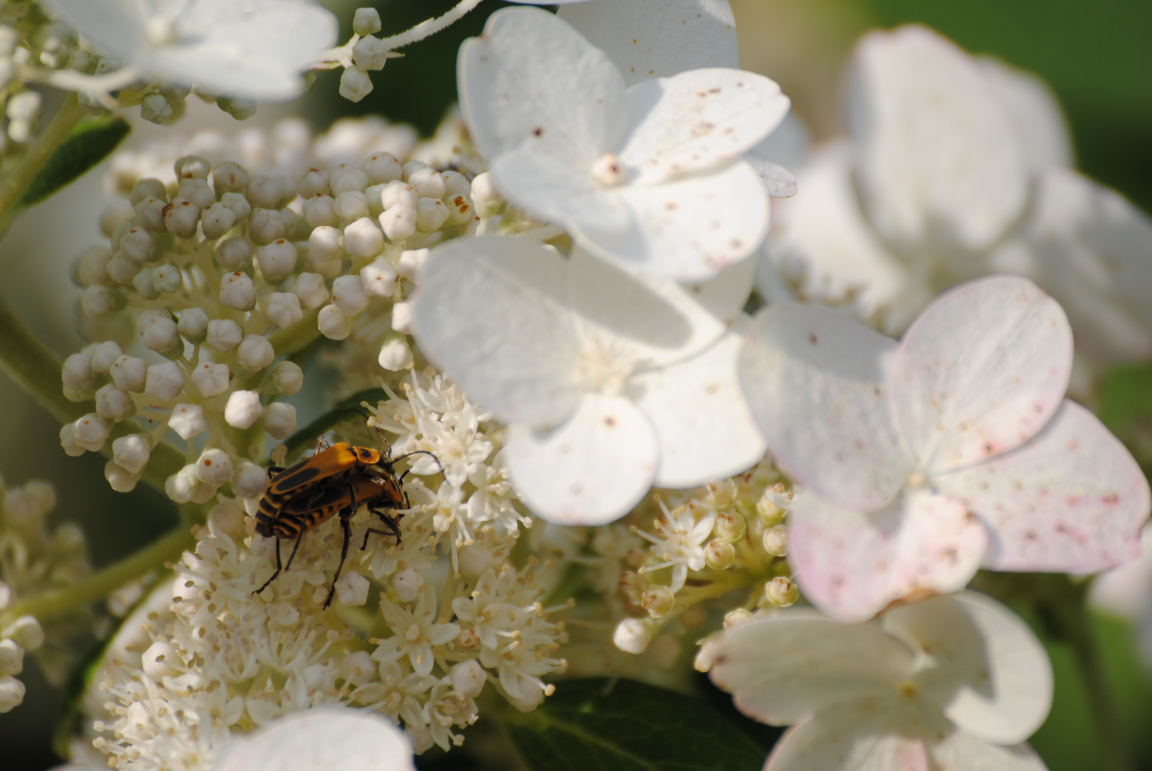 I’m always a little alarmed when I see a lot of the same bug on a plant. Sawfly larvae, japanese beetles. It’s like a marauding gang has landed. So, when I saw dozens of mustard colored beetles on the Tardiva hydrangea, I had a sinking feeling that I once again had uninvited guests.