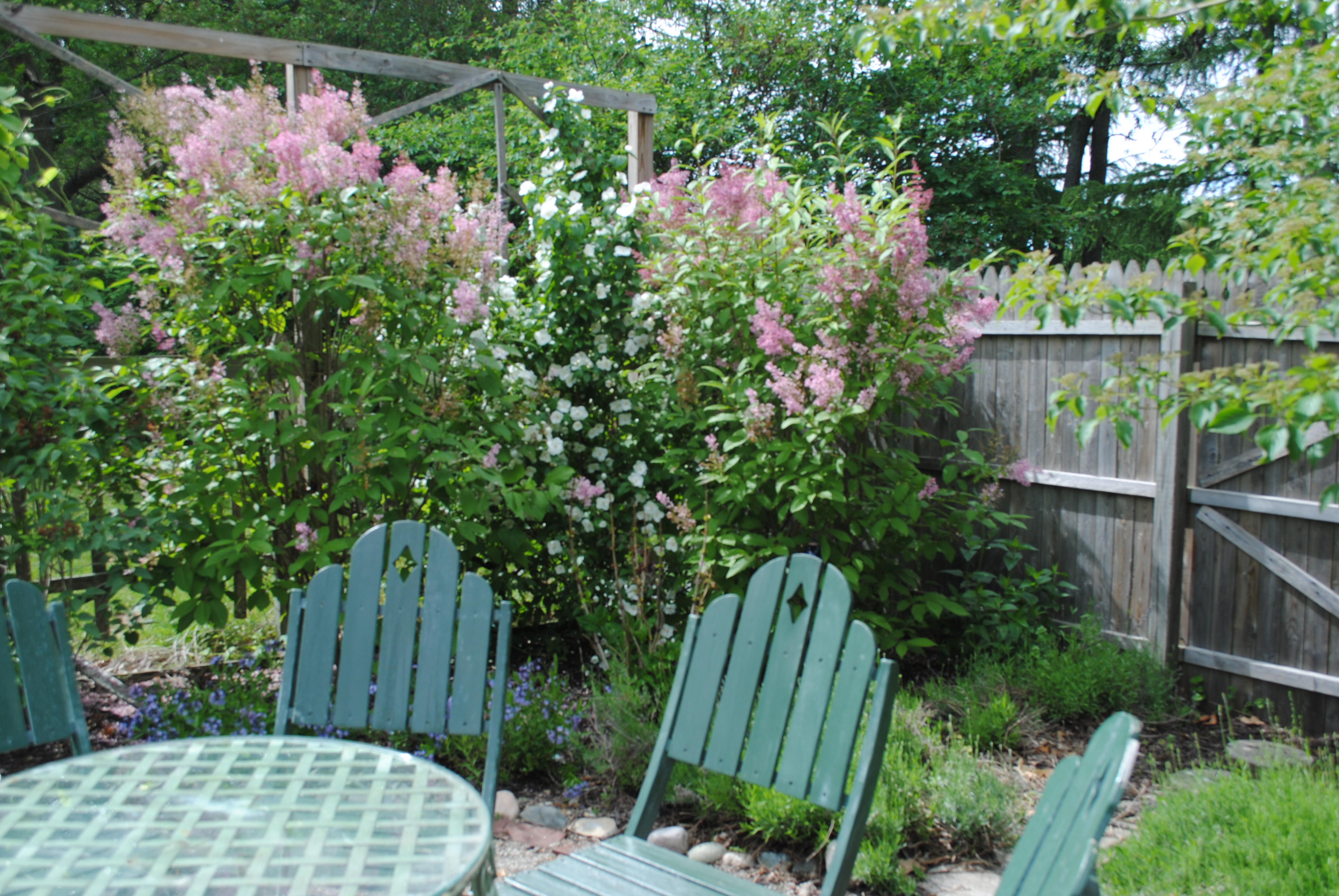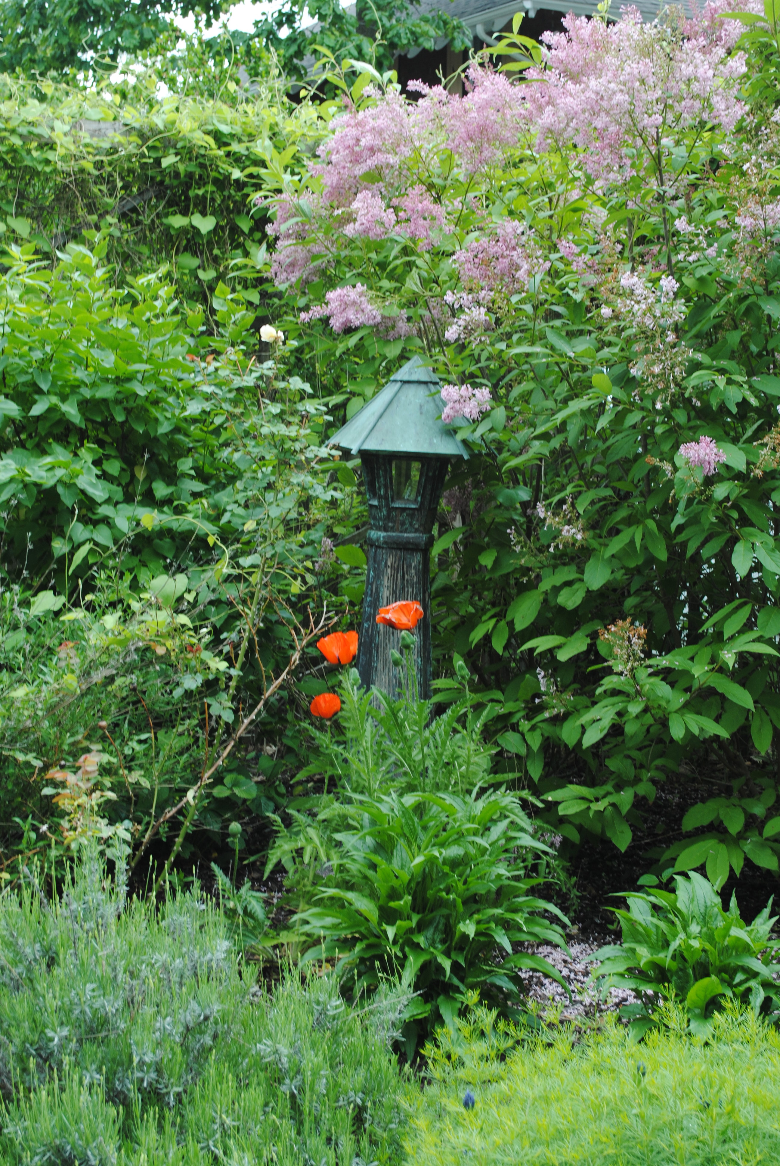 It is poppy time! Last year I didn’t get much in the way of blooms. But this year, the plants are far more established and are giving me that deep sexy red poppy color. And, the James McFarlan lilacs are really kicking out the blooms this spring. So is the mock orange. Together they make a charming little corner in the Secret Garden.