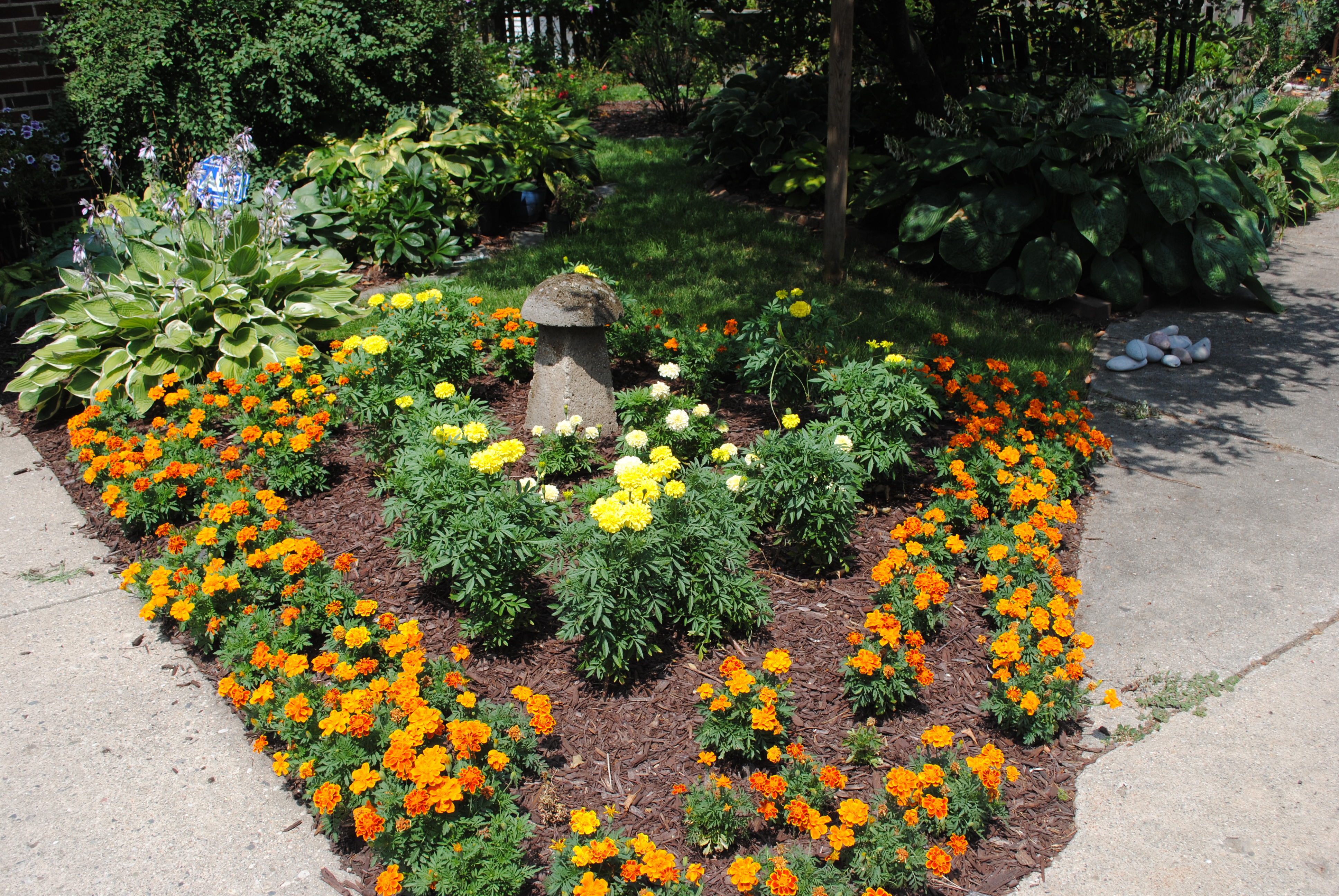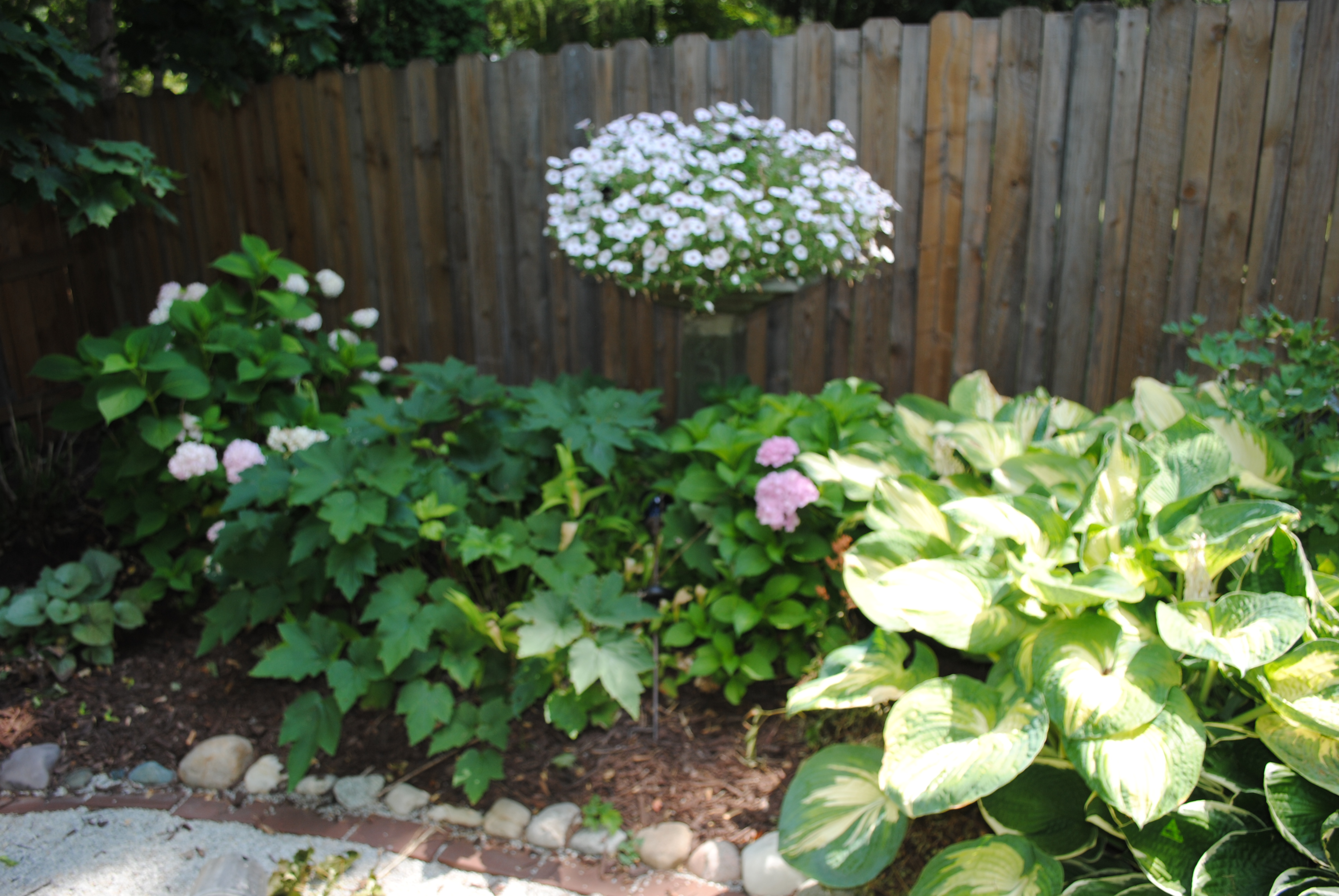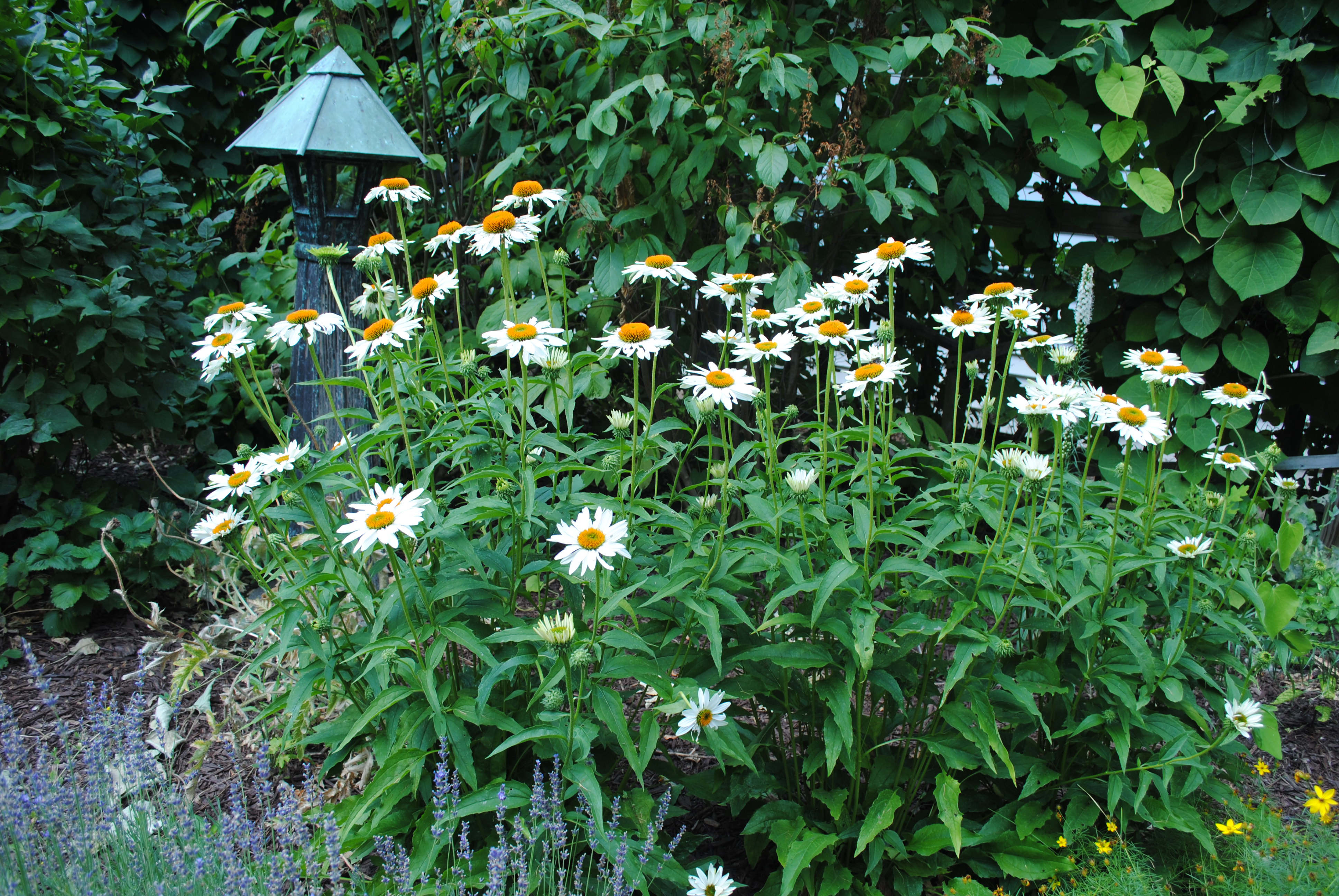 Crocosmia, a nameless pale yellow day lily, and to the far right rear Barbara Mitchell day lily. All of these are weeks early. Man of the day lilies now have budless scapes that need to be removed.A few Endless Summer hydrangeas are blooming, but the heat is really getting to them. Behind them is a pot of petunias. To the right is one of several Great Expectations hostas.NosferatuAt least the annuals will still be blooming in August…Fragrant Angel Cone Flower