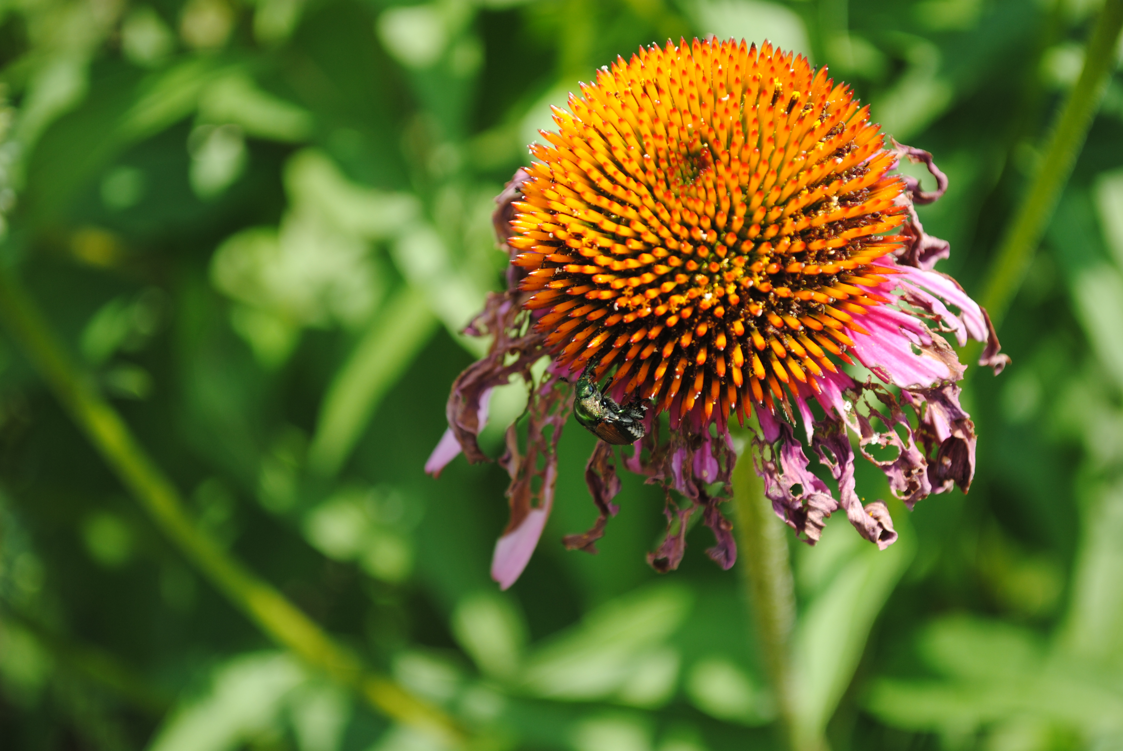 Veronica Spicata, Sunny Border Blue…the Great Black Wasps are loving this!This tattered Purple Cone Flower has been a feast for Japanese Beetles.