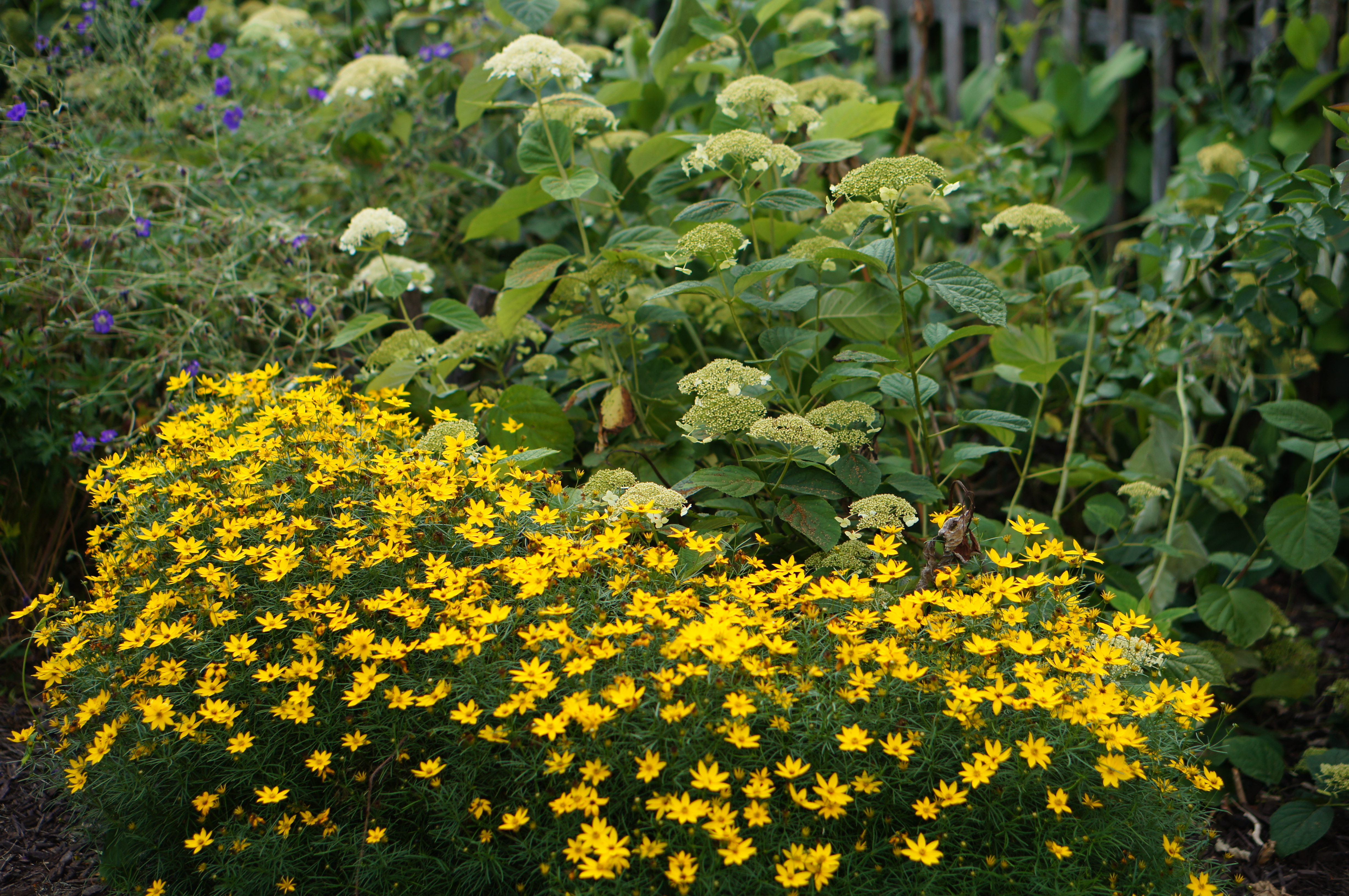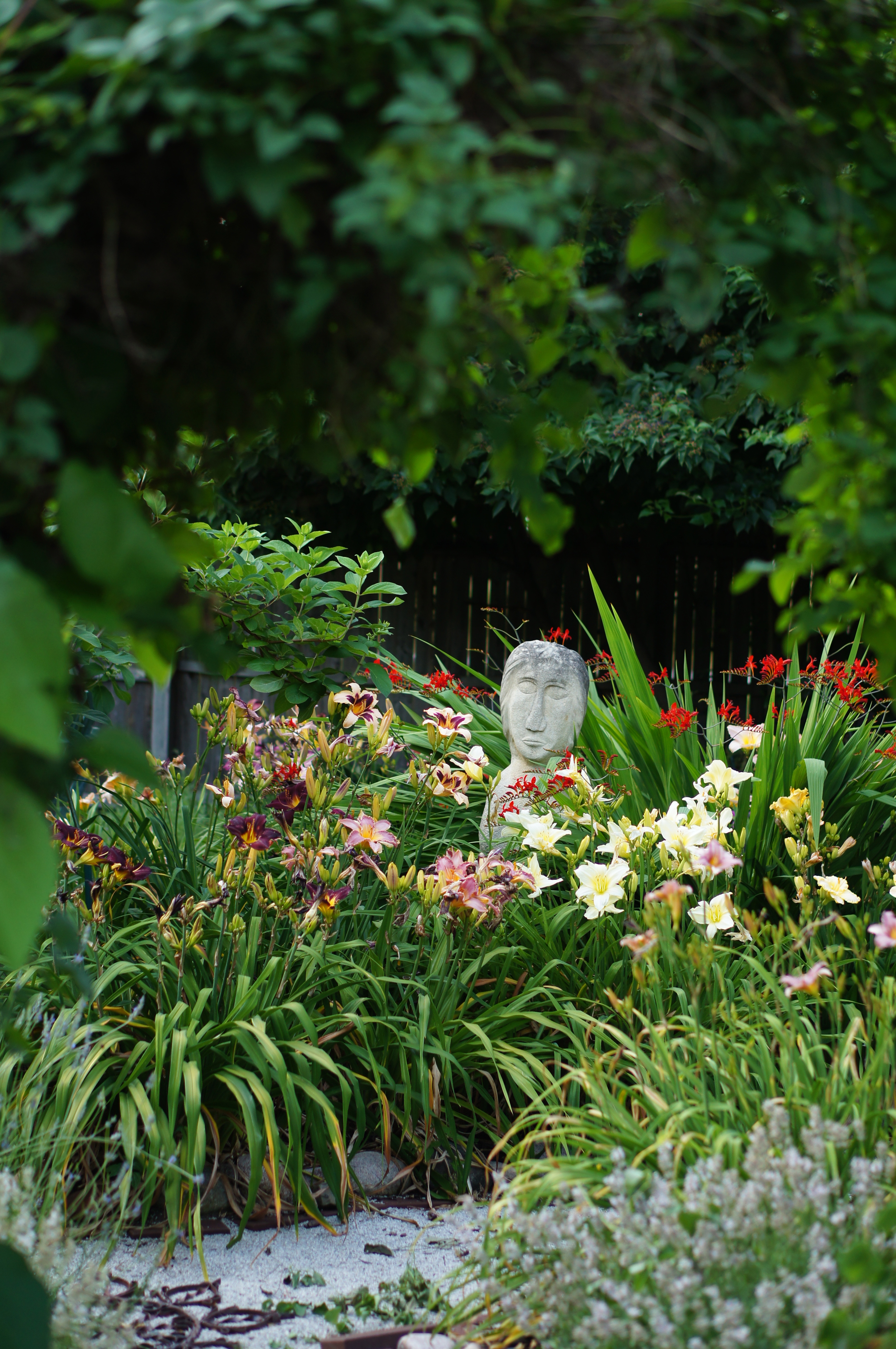 First Knight day lily, one of my favorites.Zagreb Coreopsis and rose campion that a neighbor gave me years ago.A few white clematis keep blooming. I didn’t get much of a show this year, but will take whatever I can get from this lovely vine.The Garden Lady is framed in day lilies and crocosmia. The is the view from the entrance of the Secret Garden.Annabelle Hydrangea putting on a great show. Last year Annabelle did not do much because of the heat.White Dome hydrangeas and Zagreb coreopsis in the lower garden.This is about as blue as this variegated lace cape hydrangea gets. Each year I ammend the soil with acid and it never seems to be enough.The Francis Williams hostas in the front garden are starting to bud. Behind them are the White Dome hydrangeas that are in full lacy bloom.I removed a lot of the Strawberry Candy day lilies in the front when I took out the Pana Rhododendrons. This is one of the only clumps left.Newly planted just a month ago, the Walker’s Low catmint is doing very well in the entrance garden.Red Knockout rose in the rose medallion seems to not only avoid disease, but Japanese beetles. Yes, they’ve arrived for their yearly feast.Limelight Hydrangea is just starting to bloom.Nameless dark lily doesn’t seem to be quite so dark this year.Looking west from the eastern part of the Secret Garden. The Japanese Maple and various hostas seem happy.Stitch in Time Hosta is starting to bloom.Francee, Stained Glass, June, Great Expectations, and various heuchera.Barbara Mitchell day lily in the Secret Garden.Day lilies and crocosmia in a riot of bloom.My Sweet Rose day lily.Lavender Doll day lily, Cool Cat Nepetha, Jean Davis Lavender, purple cone flower from a friend, White Dome hydrangea.Purple cone flower just starting to bloom.Fragrant Angel echanacea with a friendly bumblebee.Zagreb coreopsis and a purple coneflower that isn’t sure what she is supposed to look like. But she’s blooming in her own unique way.Purple coneflower from a friend and Fragrant Angel echinacea.Marigolds and purple petunias greet me at the back door.
