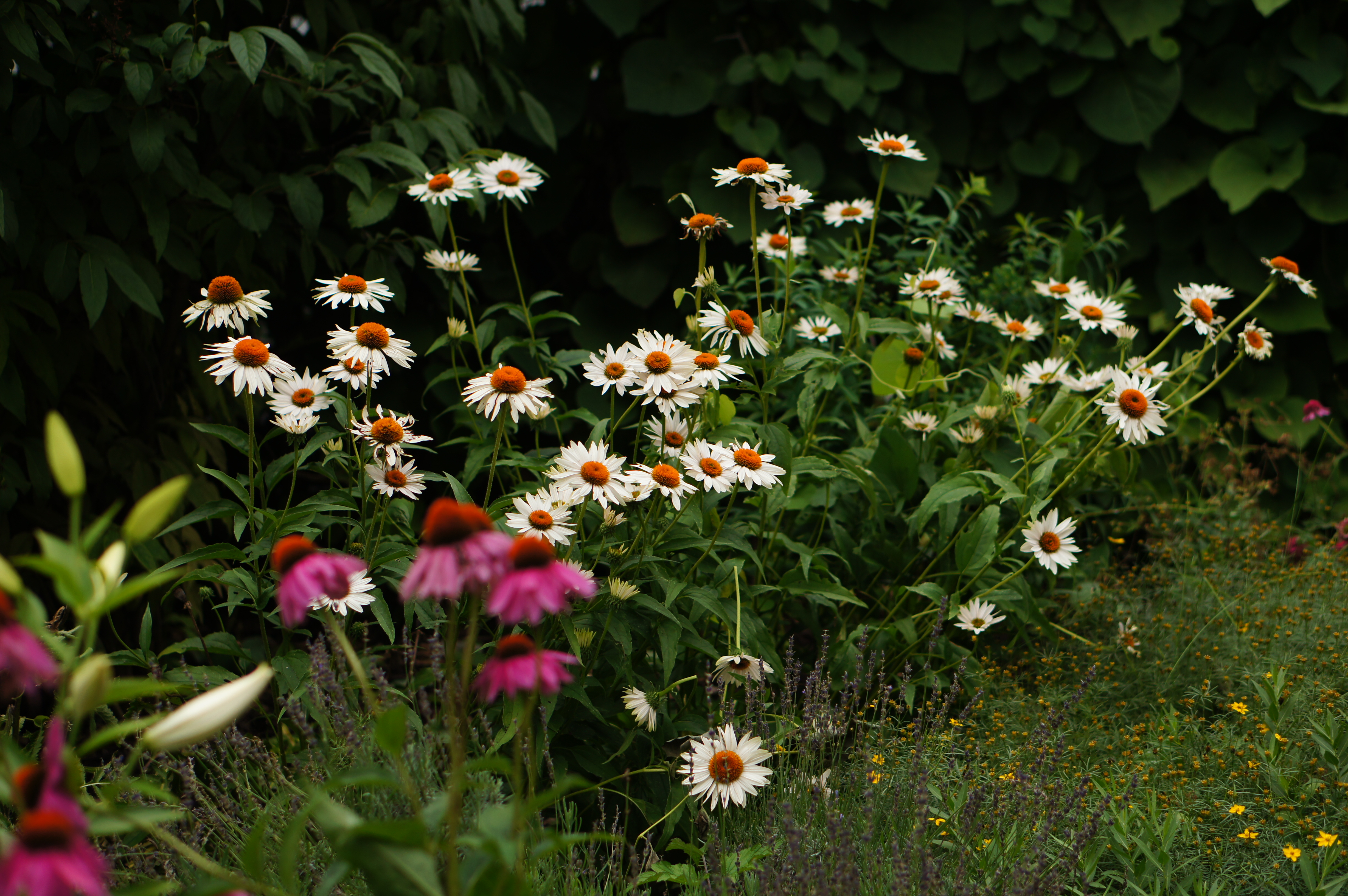 Though the temps are only in the high 50’s, it is still summer in the garden and today’s rain was welcomed. I’ve taken advantage of the cooler temps and moved a few things. I wilt less in cooler weather. And, of course, the plants don’t mind a cool move and a nice rain. The Ruby Stellas under the Rose of Sharon have never done well and so I pulled one clump out. I’ll probably remove the other two clumps, too. And, since the Francis Williams hostas under the kitchen window were looking really bedraggled, I moved them to a spot under the Rose of Sharon. They might like the shade there better.