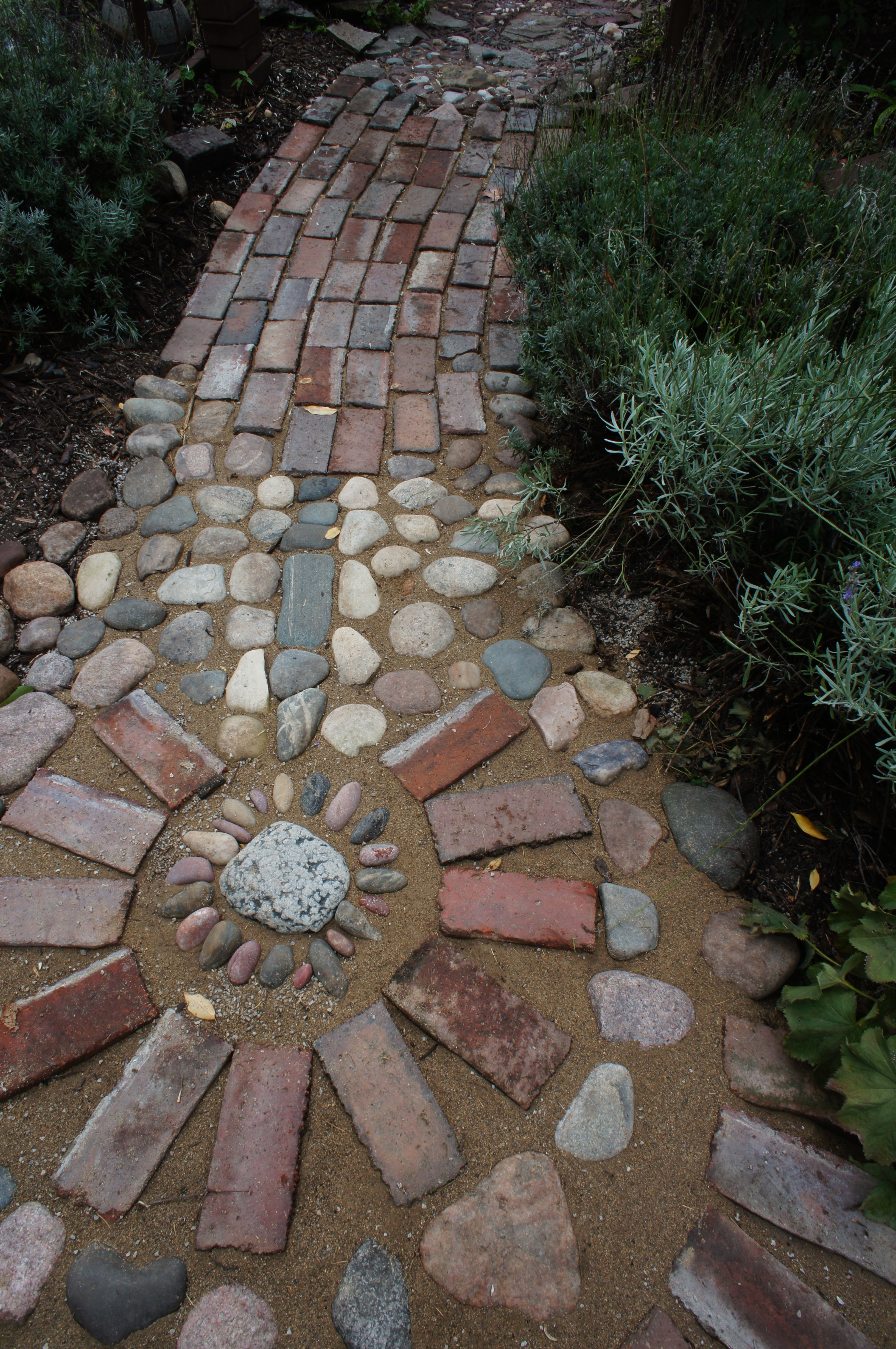 Because I have always been in love with rocks, my friend from Maine, who has been given free creative license, decided to use both stones and bricks. I saw some stone mosaics online that she found particularly inspiring and so the project began. We are learning as we go, about design and materials. For example, we now know that we should not use very small stones. The design gets too busy. So, the early work that my friend did will probably have to be redone. Plus, I now know what polymeric sand is and that mortar works far better than cement for stone mosaics. I’ve learned I can carry four bricks at a time and that it takes a lot of trips to move 1400 bricks. I’ve learned that sand weighs a lot and I’m not as young as I used to be. But the walkways are beautiful and all the more special because my friend from Maine laid each brick and rock.