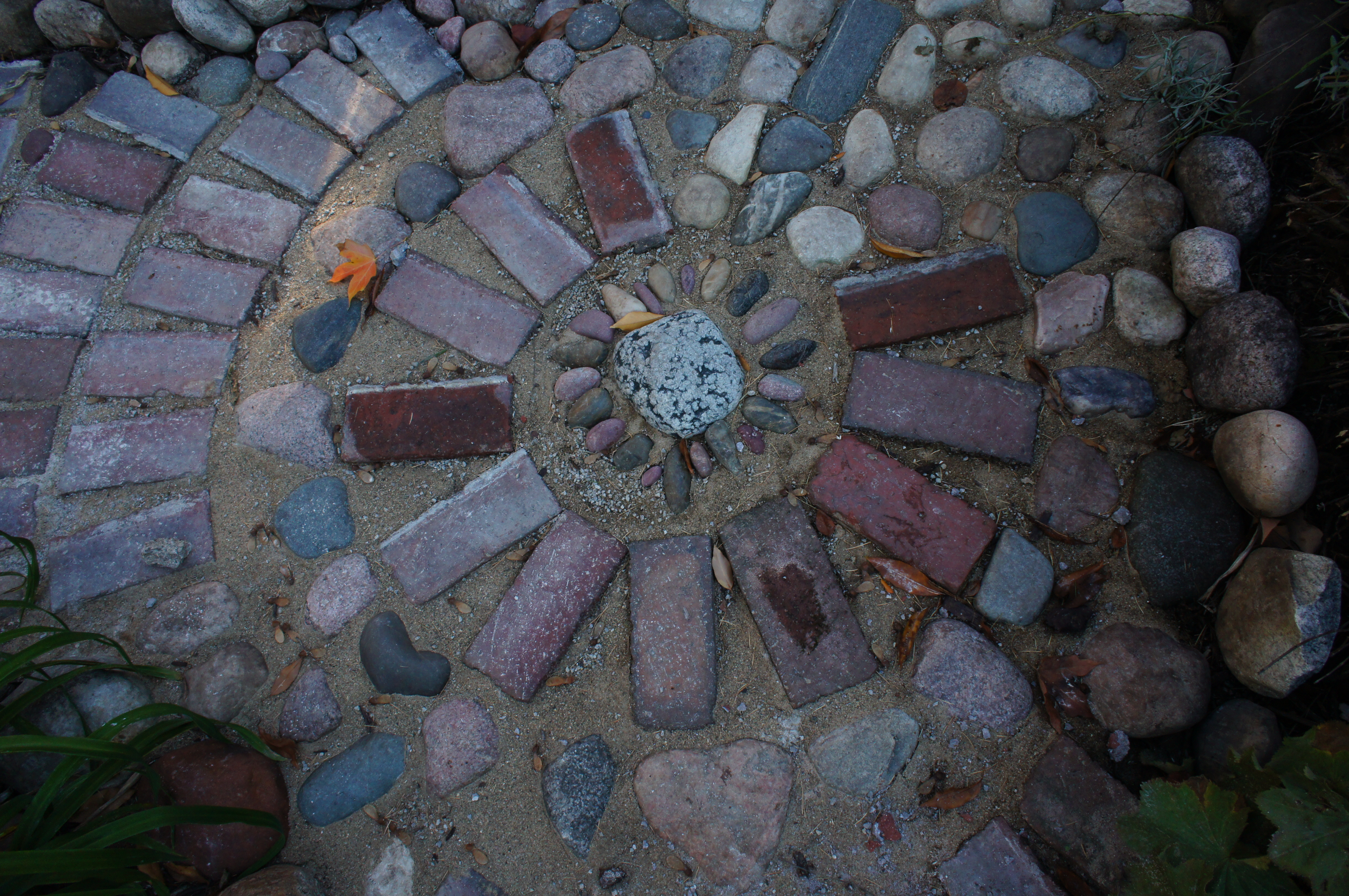 And the middle of the month is upon us. The garden is winding down but I’m celebrating my new brick pathways. I’m gradually replacing the rocks that used to line the crushed limestone paths, but were used in some of the stone mosaics in the pathways.