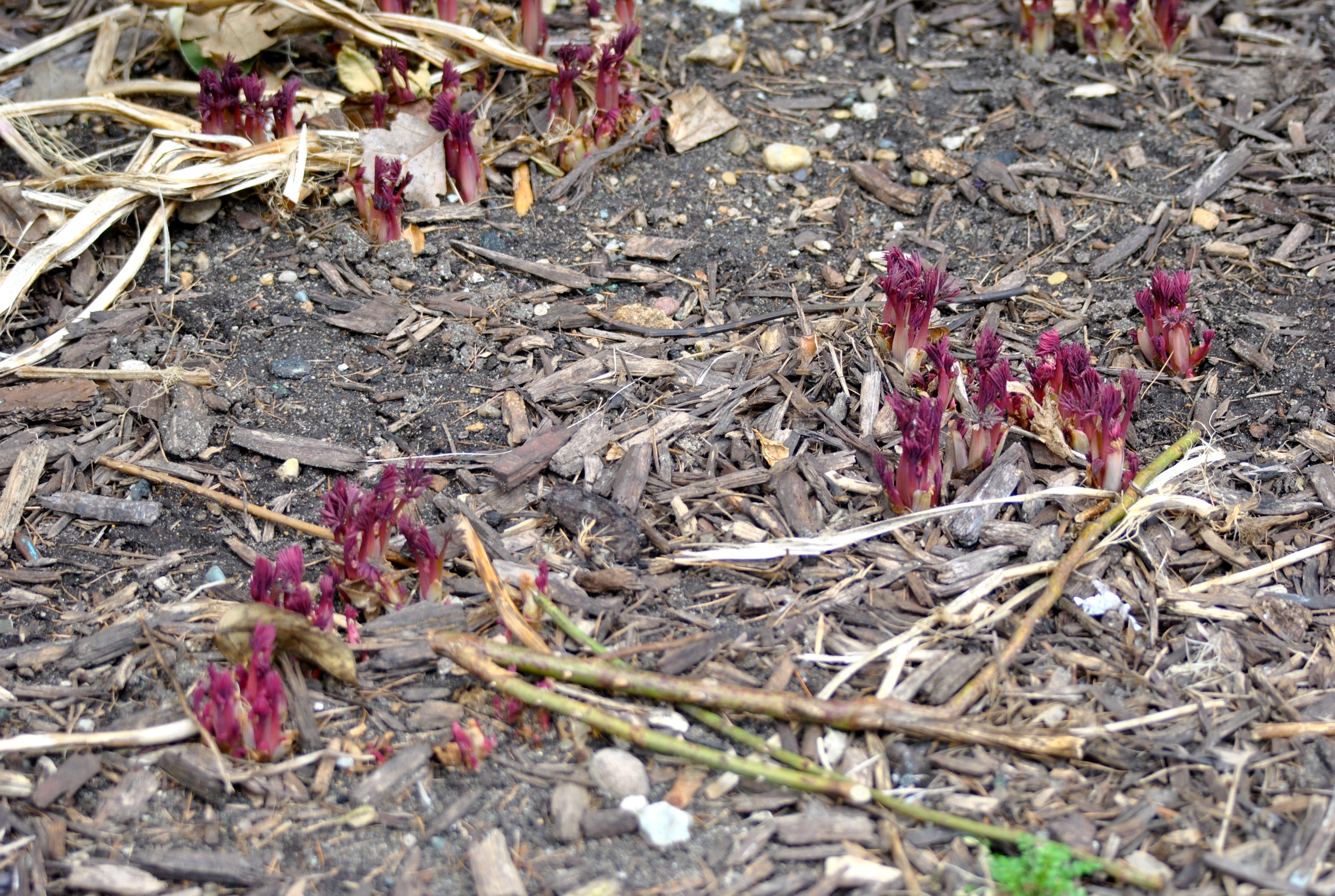 Also coming up are the dicentras. In a few weeks those lovely branches full of pink hearts will arch gracefully.