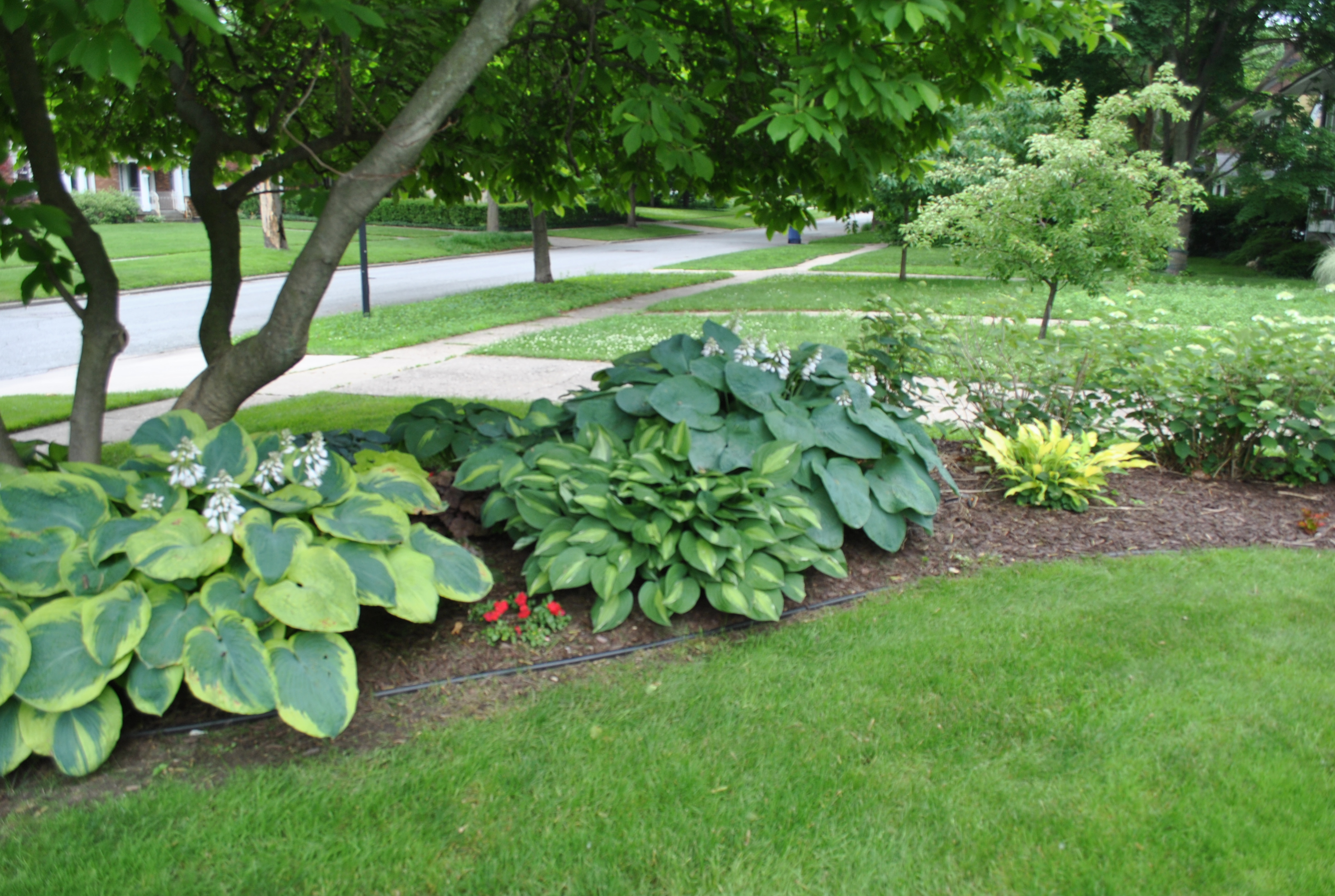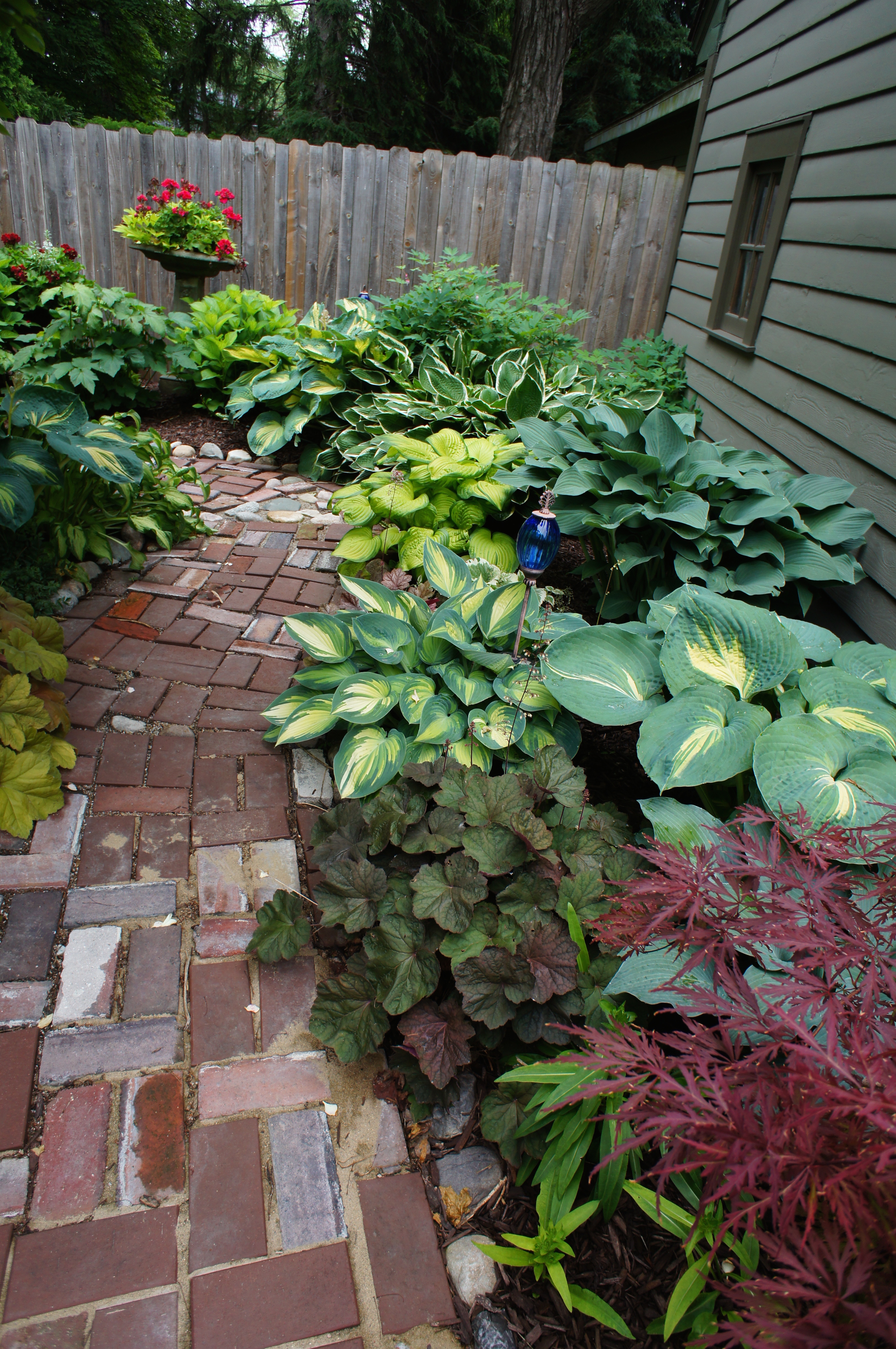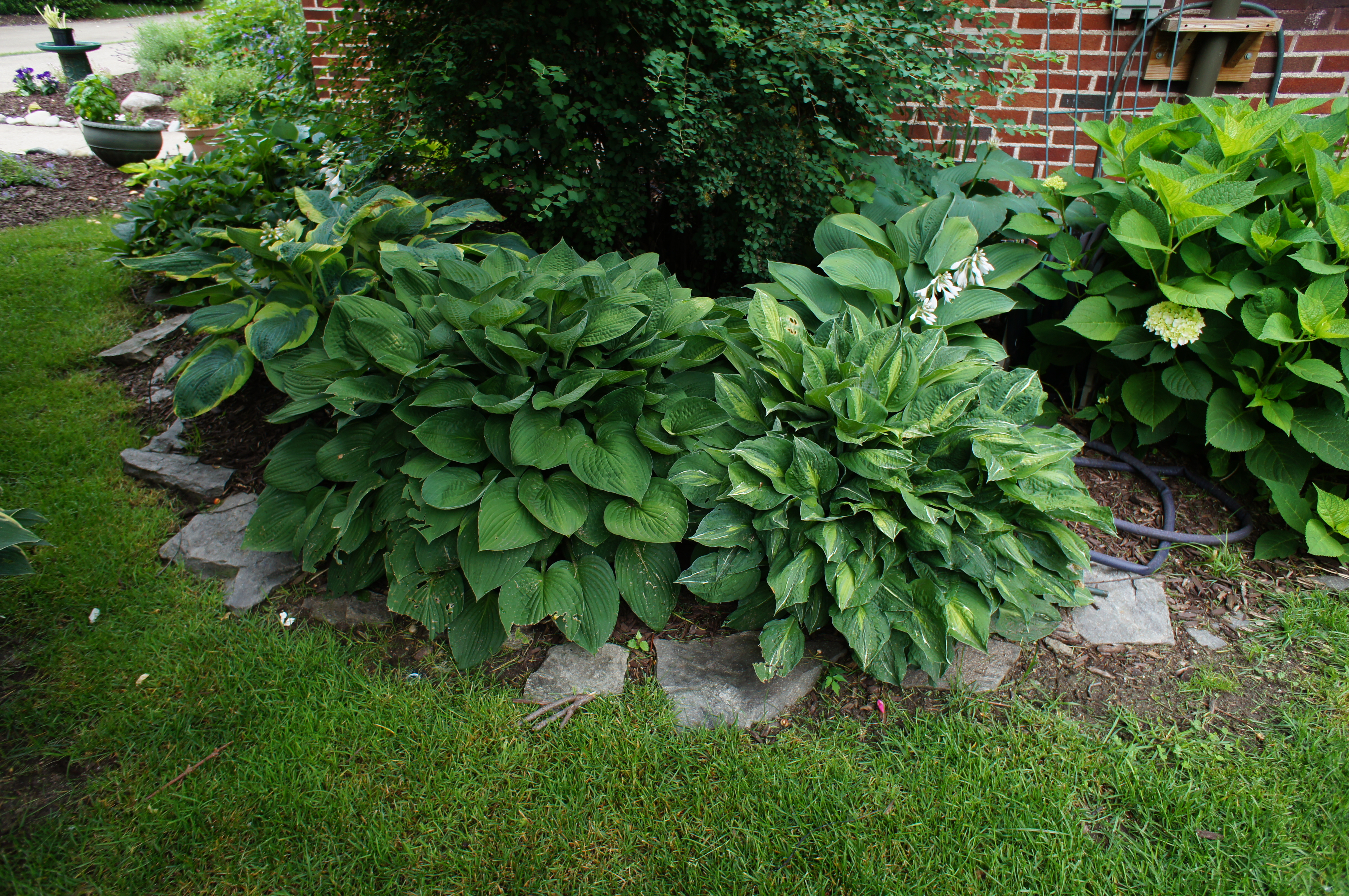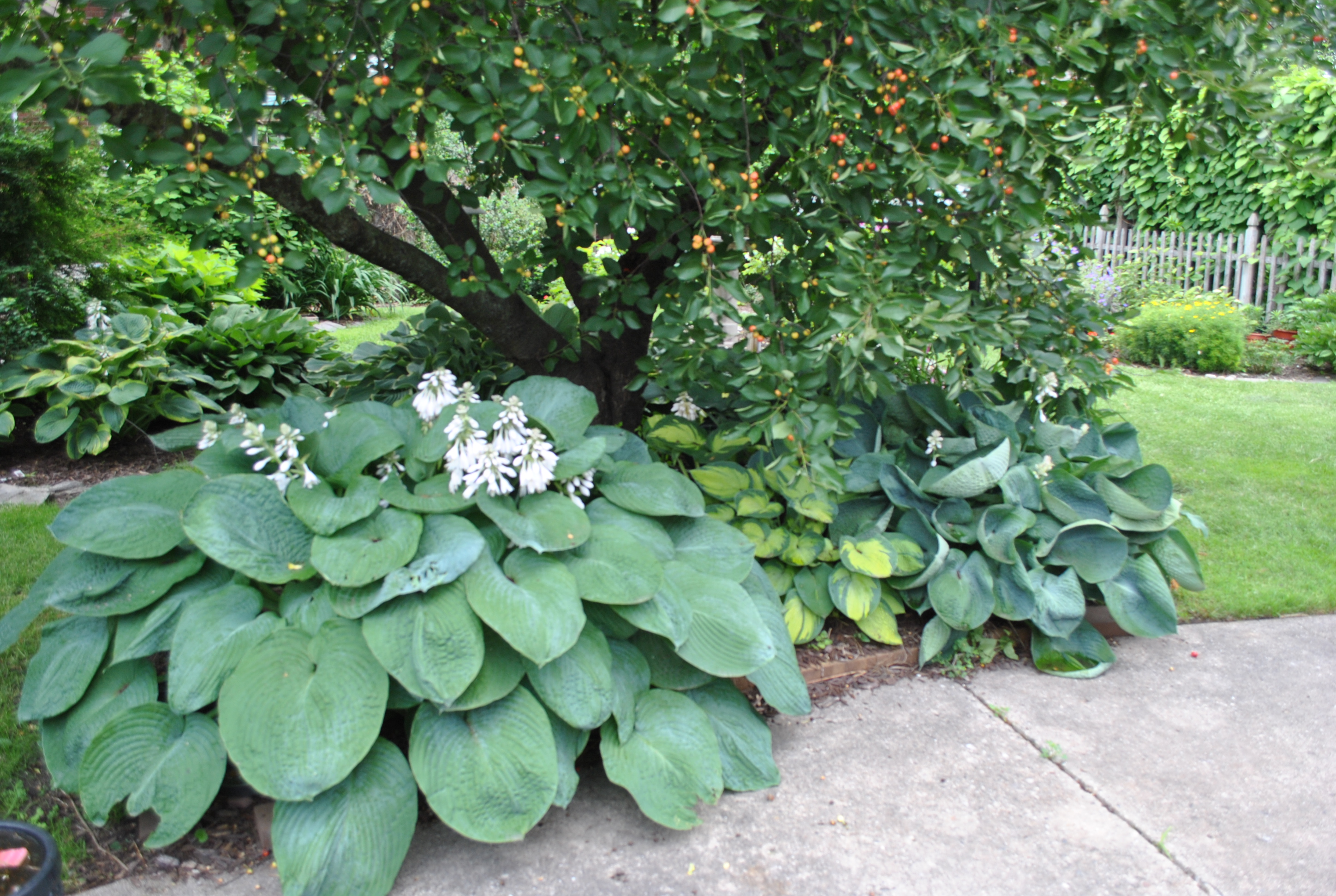 In the Secret Garden: Far right is Dream Weaver. In front of it is June, then Stained Glass, Krossa Royal (next to the garage), then Francee, and Great Expectations sits to the back of this photo. There are, of course, astilbe and heuchera mixed in, not to mention hydrangeas and a big old bleeding heart.The large hosta in the rear is a division of Elegans. In front of it to the left is Francis Williams. Left of Francis is another Elegans (I keep dividing this monster!). The left front hosta is Orange Marmalade. Center front is Lakeside Beach Captain. On the far right is Wheaton Blue.Lower Garden: Another shot of Elegans. To the right of it is Stained Glass. And on the far right is Abiqua Drinking Gourd. Peeking out behind Stained Glass is another Dream Weaver.Lower Garden: On the far right, just in view, is Elegans. To the left is Hanky Panky. The bright green hosta next to it is a mystery to me, but might be Maui Buttercup. (sorry for the blurriness!)Lower Garden: Strip Tease and a mystery hosta that a friend gave me. That’s a Francis Williams to the left of the mystery hosta. I think the hosta behind Strip Tease is Ryan’s Big One.Secret Garden: MoerheimSecret Garden: Deep Blue Sea, Orange CrushLower Garden: Halcyon in foreground, Elegans on the right under the cherry tree, Hanky Panky (though it’s hard to see in this shot), and Regal Splendor to the left of the cherry tree.Front Garden: On the left is Francis Williams. Next to it is Lakeside Beach Captain. On its right is Elegans. And tucked away next to Elegans is Pineapple Upsidedown Cake.Secret Garden: Allegan Fog, Silver Threads and Golden Needles, Stitich in Time, Ghost Spirit. Behind these is Dream Weaver.Lower Garden: Lucy Vitols in the center. That’s Rhino Hide in the pot to the left. I’ve almost lost it twice, but it comes coming back from the brink. There is a Kaleidechrome almost hidden by the pot of argula. There’s a bit of Thai basil peeking out of the pot on the right.