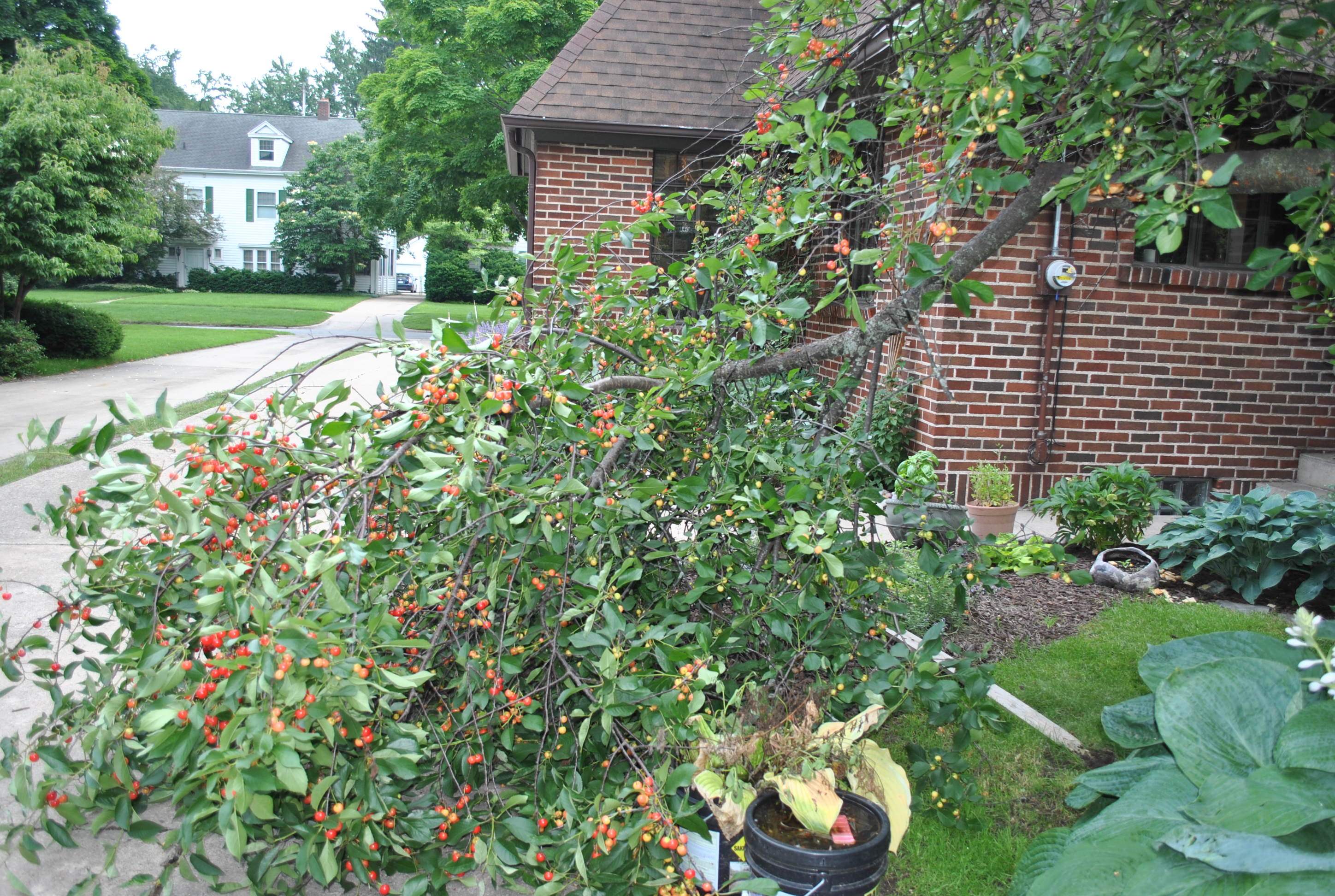 I couldn’t decide whether I should write about the fallen cherry tree limb and the fact that the lilacs are getting a really hard prune, or whether I should gush over the deep textures of some of my favorite hostas. So, I’ve decided to write about both. First the hard prune. I knew that sooner or later a long limb on the cherry tree would break under the weight of the cherries, and a week ago it finally came down. I’m glad it happened after I had about 50 people at the house. There was a storm that night and that’s when the limb came down. But it didn’t break clean, so the fruit has continued to ripen. That’s going to make for easy pickin’s in about three or four more days.
