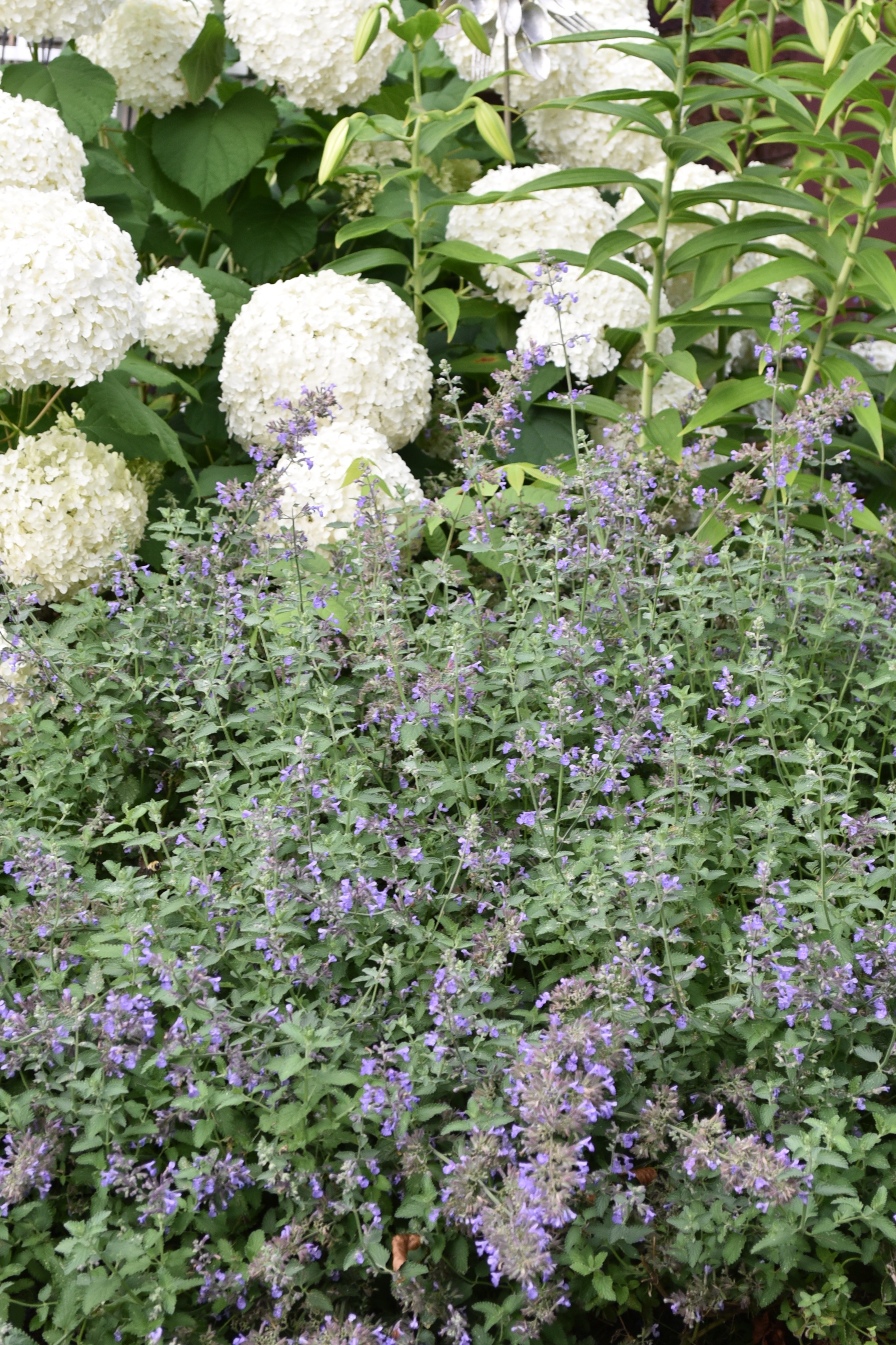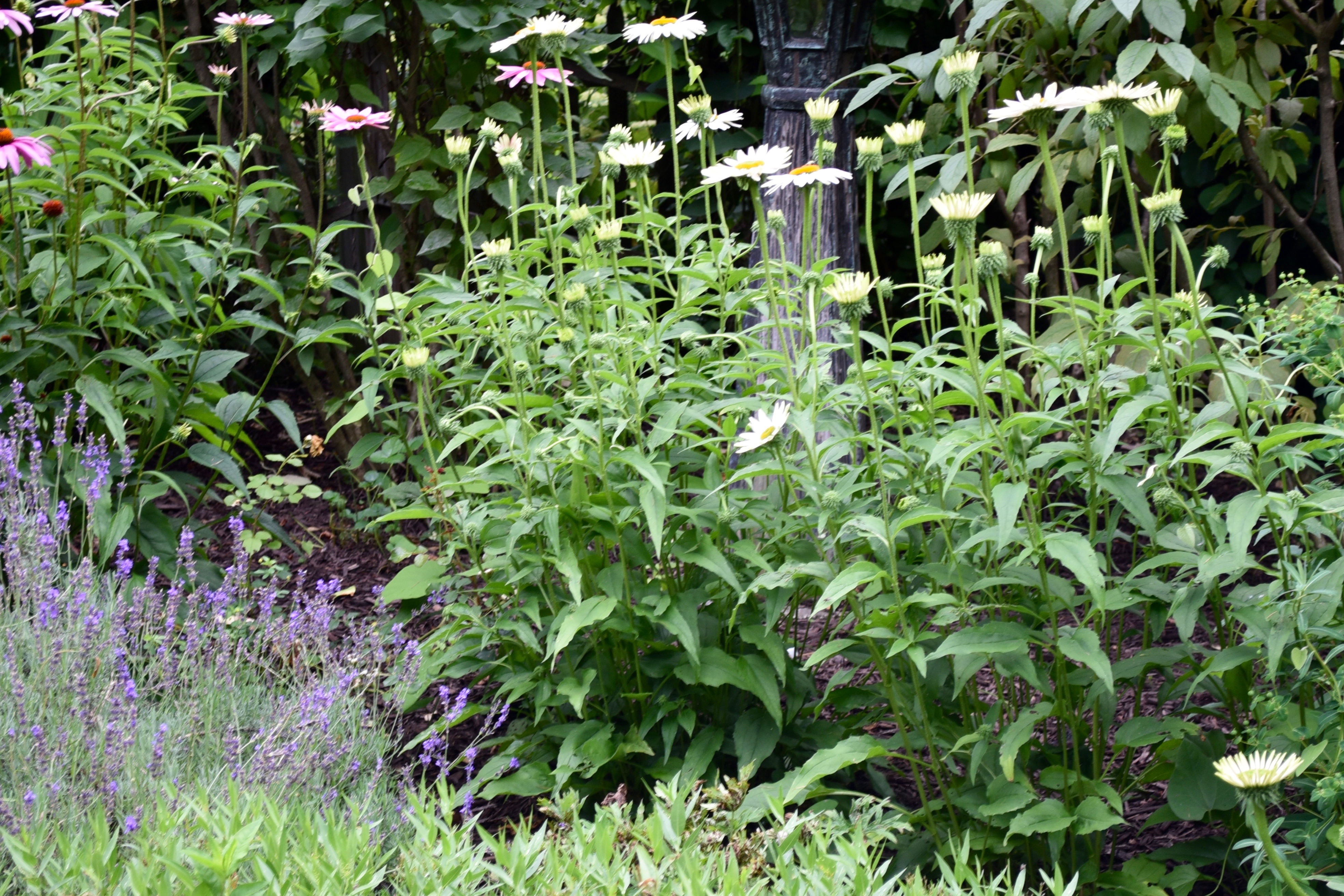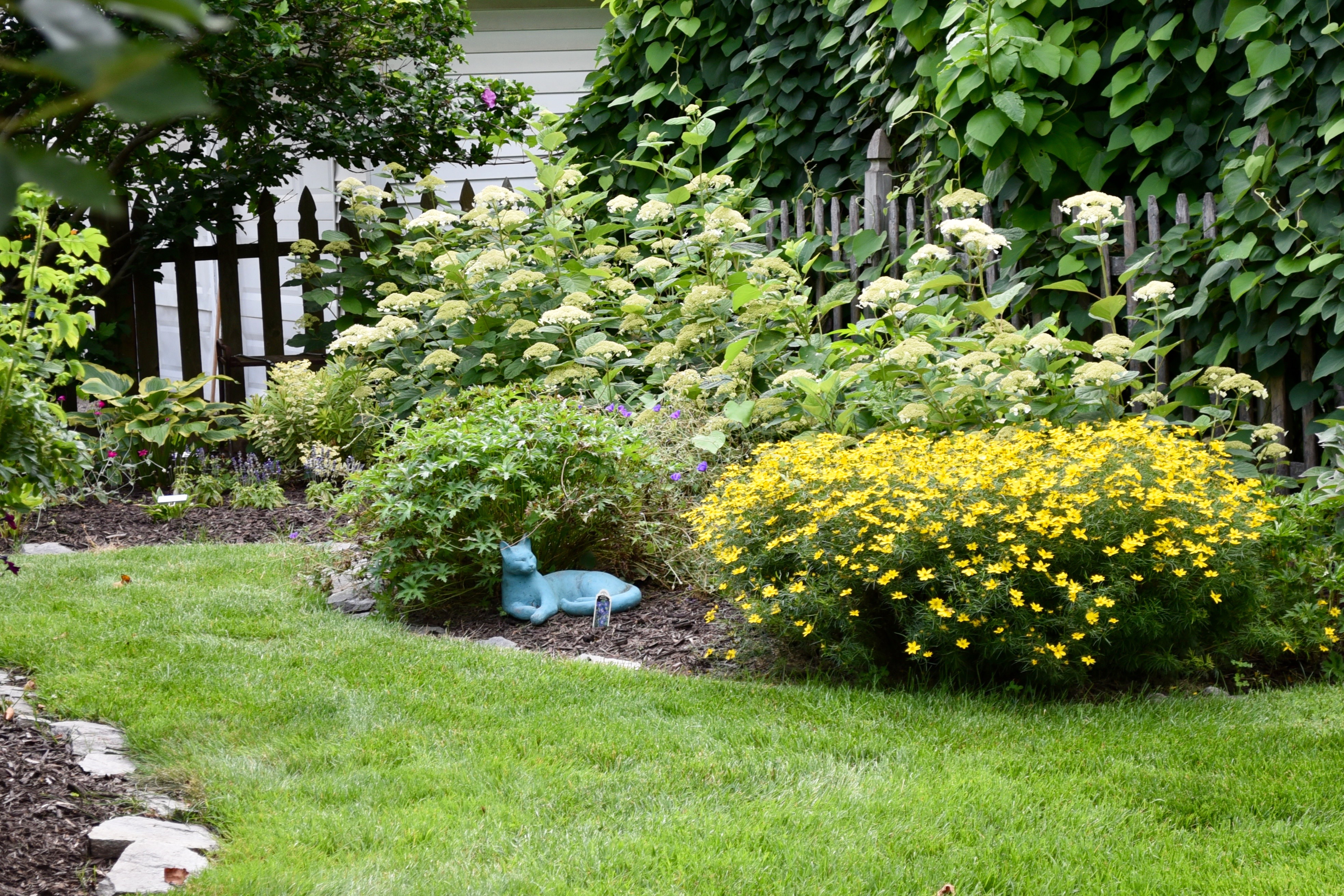 What more could you want: A cat statue, Rudbekia, and Walker’s Low Catmint in the entrance garden.Halcyon in the back door garden. That is Rhino Hide in the little pot to its right. This is it’s third year in that pot and it’s doing better and better. Rhino Hide gets much bigger so I will need to move it to a better spot when it decides to grow up.