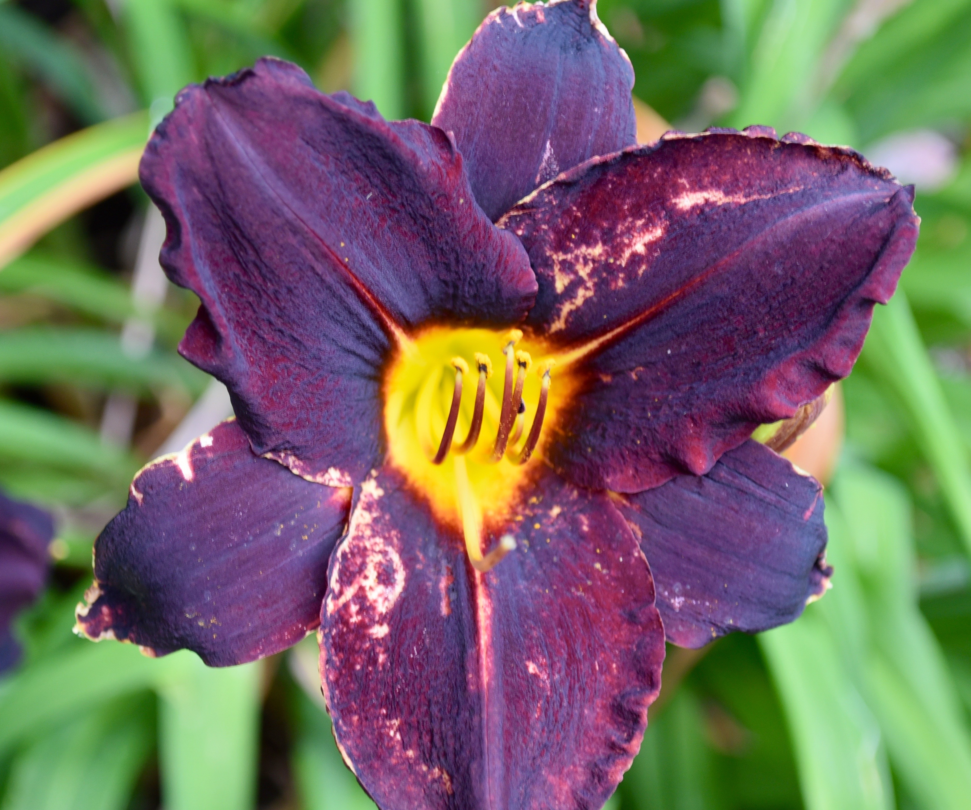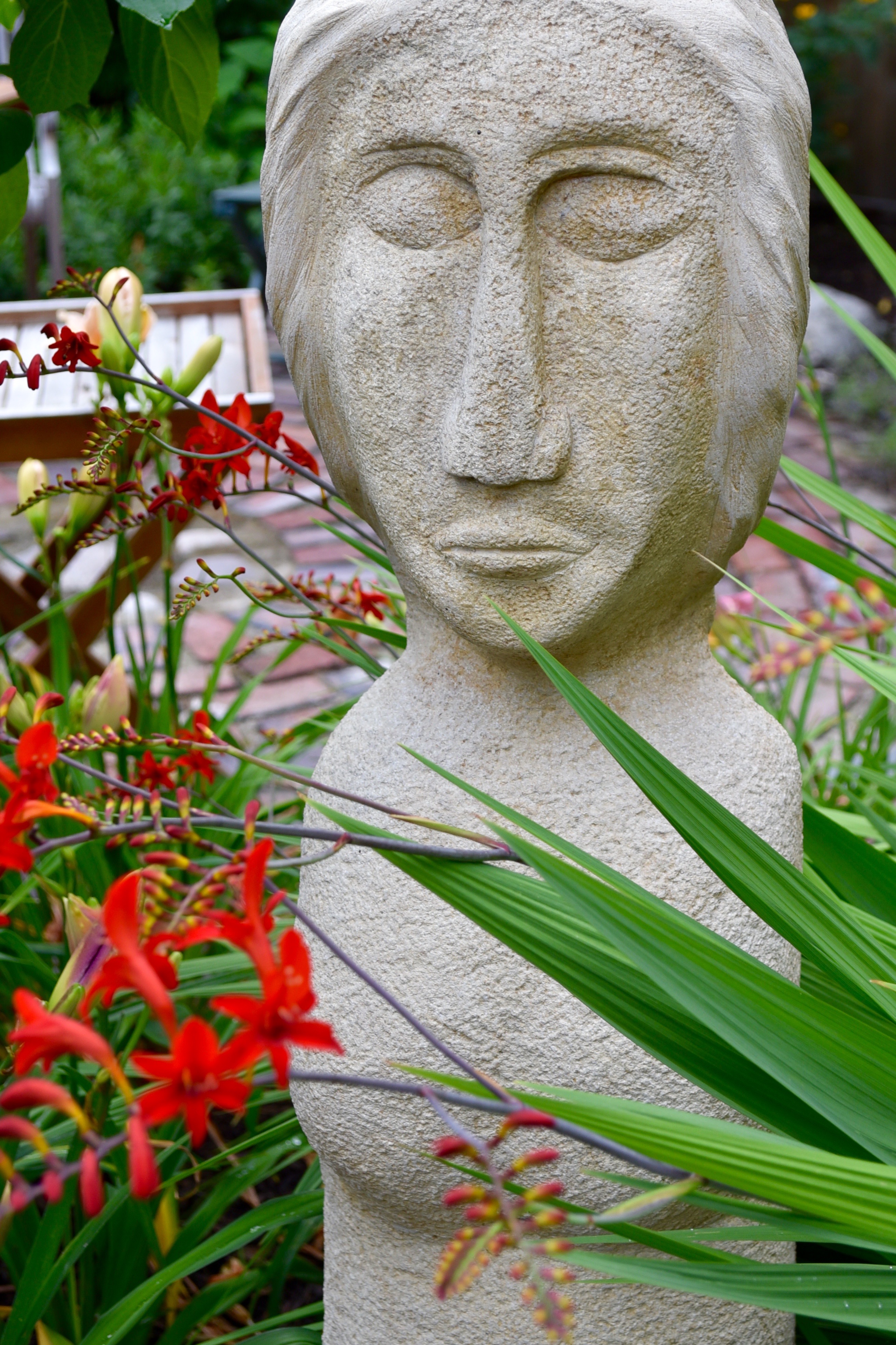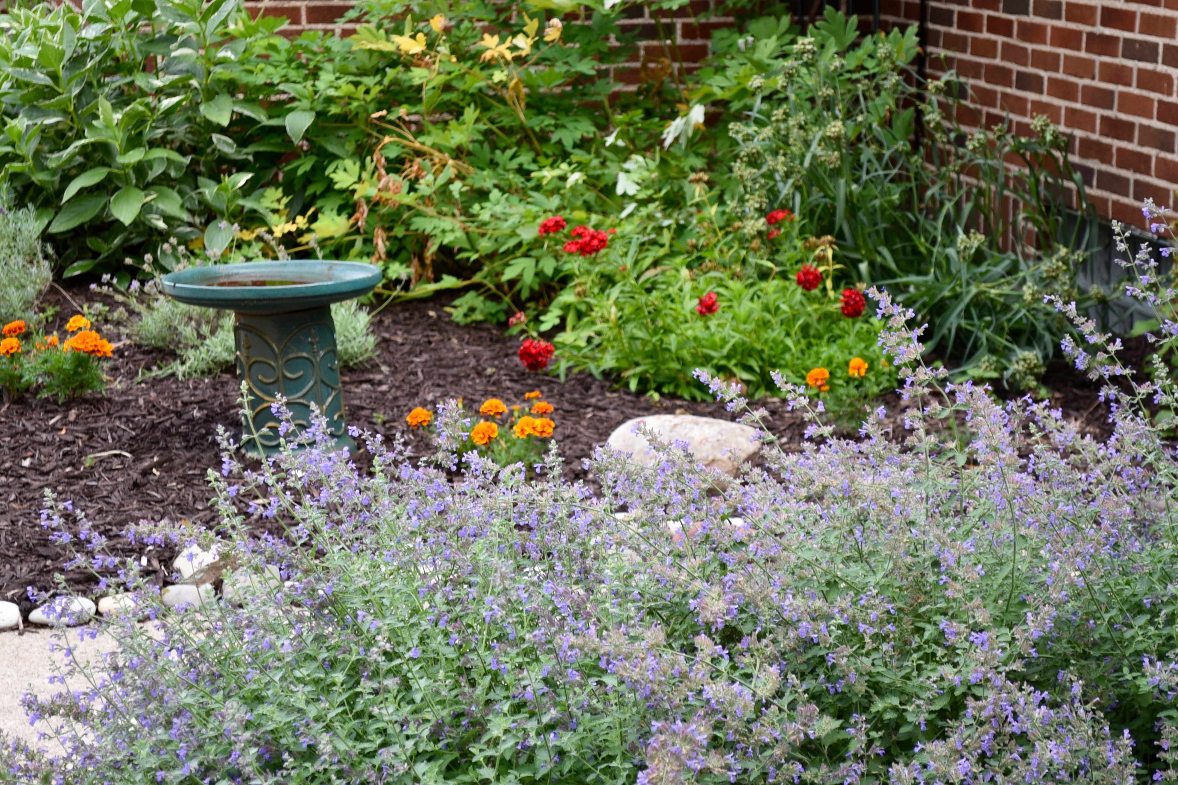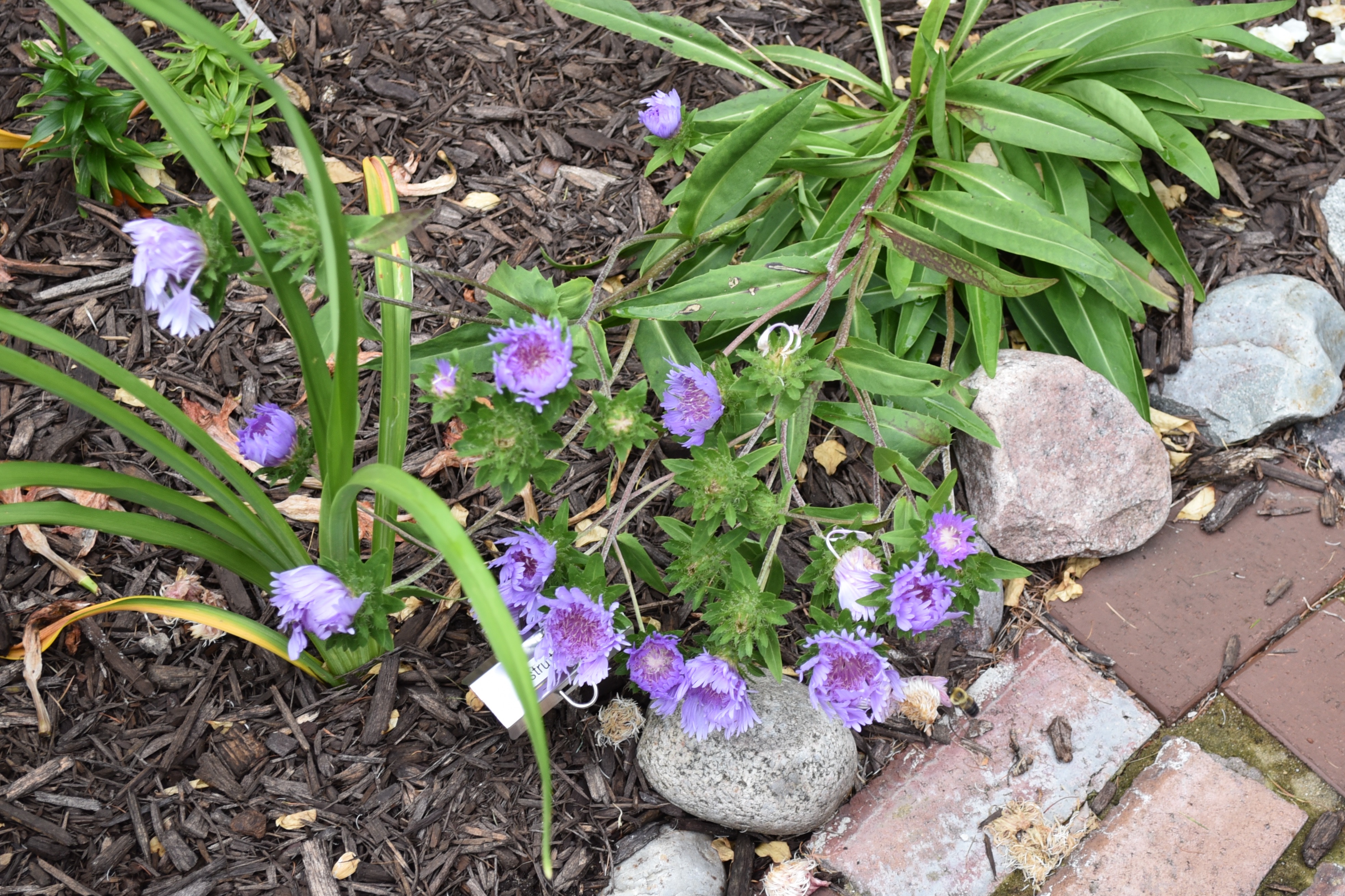 What more could you want: A cat statue, Rudbekia, and Walker’s Low Catmint in the entrance garden.Halcyon in the back door garden. That is Rhino Hide in the little pot to its right. This is it’s third year in that pot and it’s doing better and better. Rhino Hide gets much bigger so I will need to move it to a better spot when it decides to grow up.