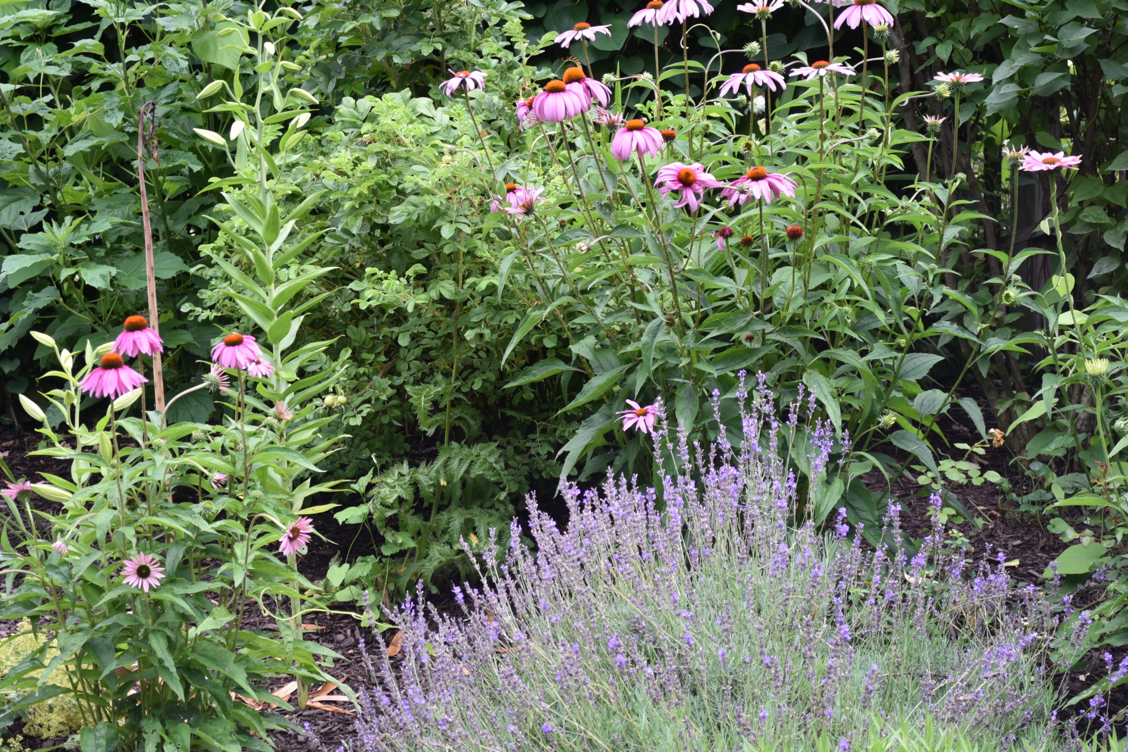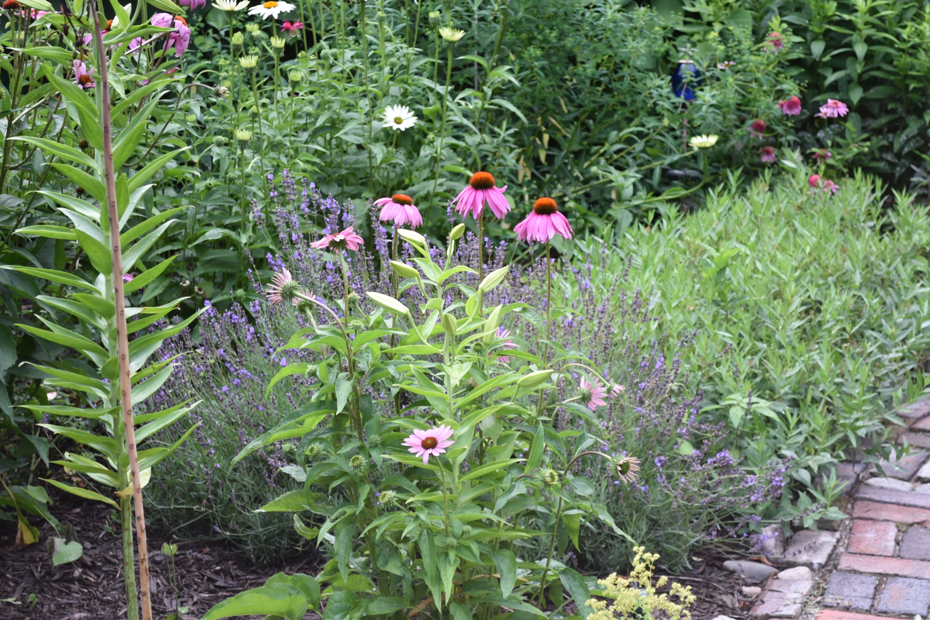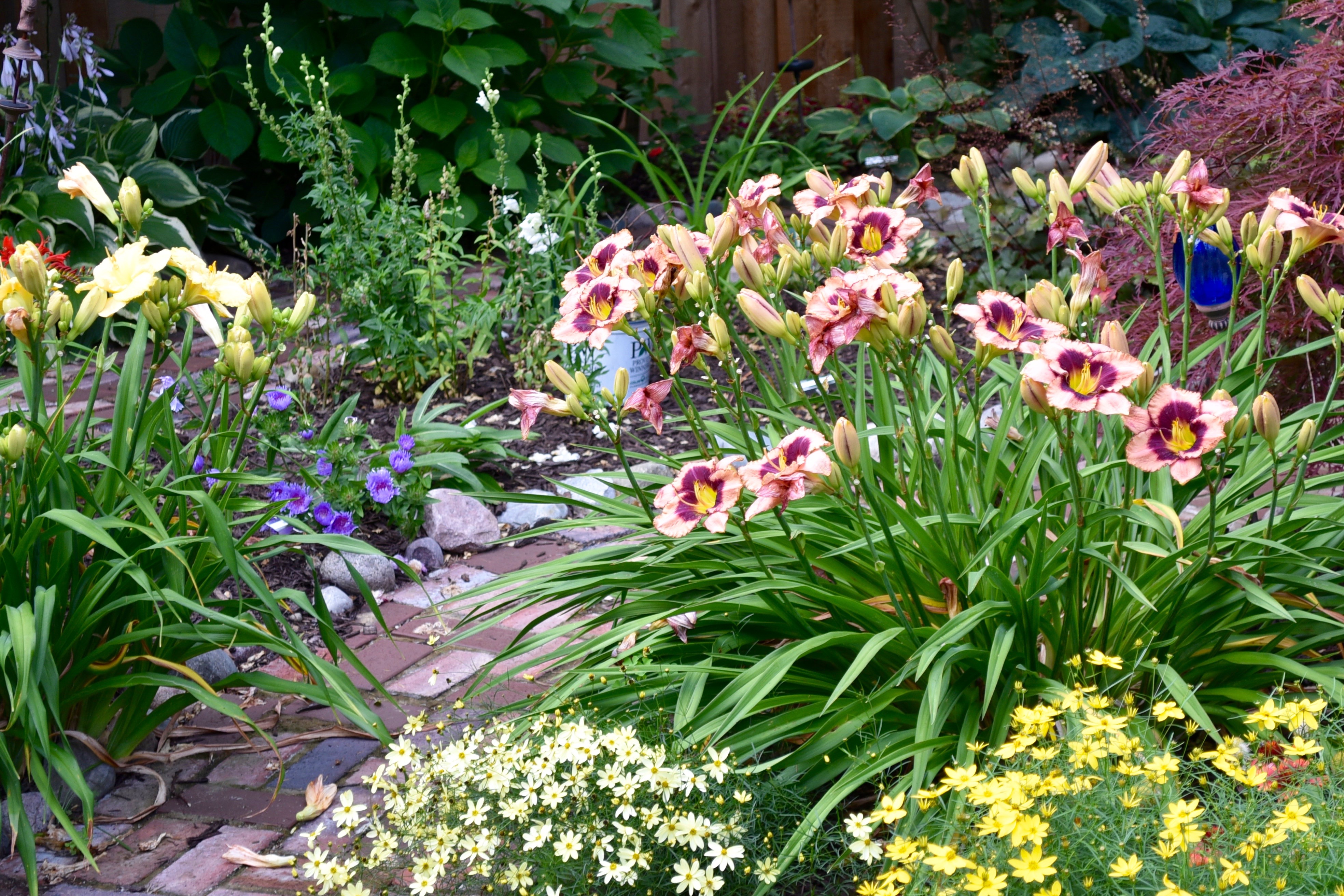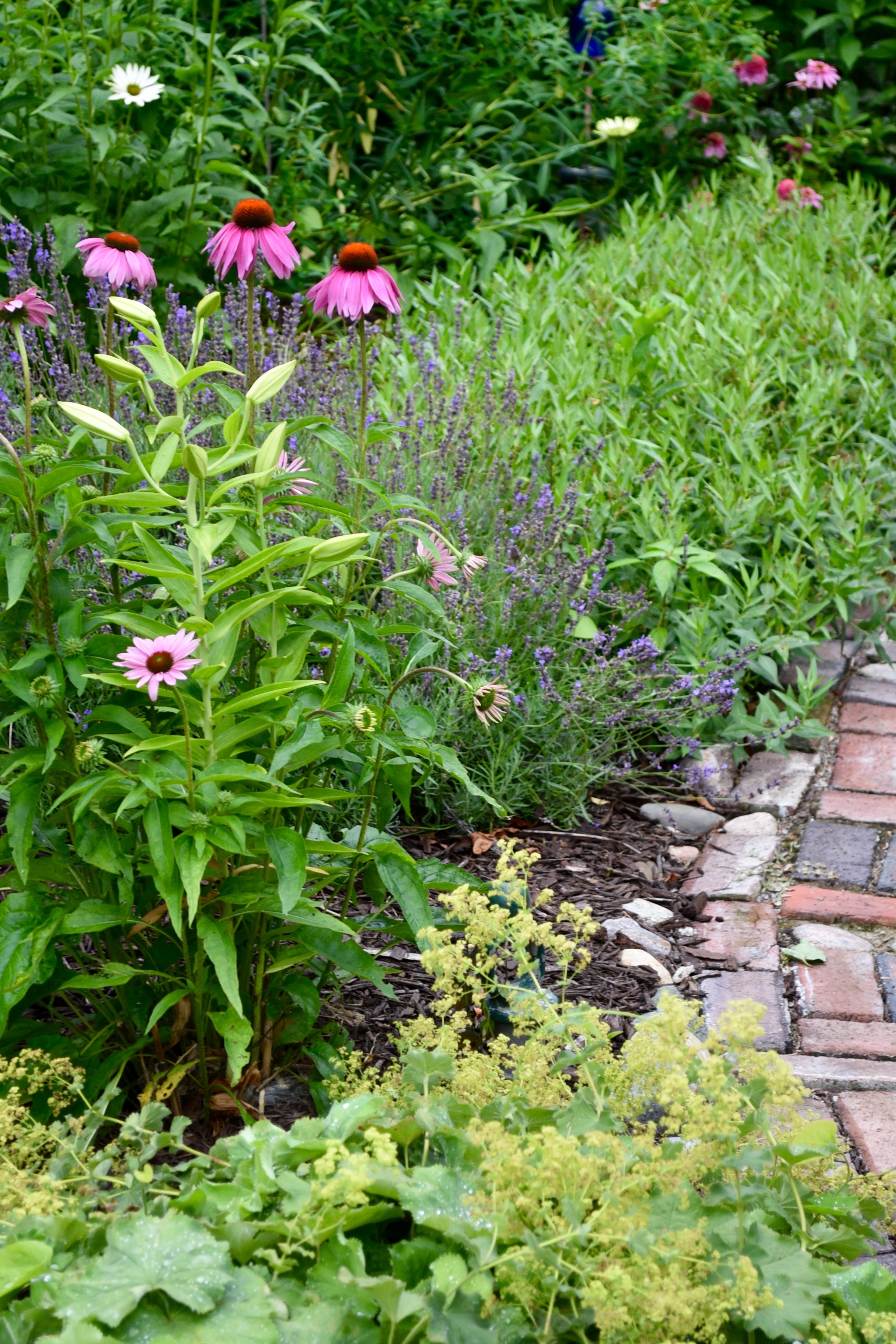 Sweet William, marigolds, and Walker’s Low Catmint in the little nook between the sun room and dining room.White Dome Hydrangea, hardy geranium, and Zagreb Coreopsis in the lower garden. I almost yanked the coreopsis early this spring but am so glad I didn’t.This is my new “lewd” hosta bed. At the moment the euphorbia and rose campion can stay, but as soon as the new hostas mature those two plants are going to need a new spot in the garden. What do I mean by “lewd?” This bed includes Seducer, Obscene Gesture, Naked Lady, Stiletto, Midnight at the Oasis, Boys Toy, She’s Got the Moves…You get the ideaThis Wild Spice Hansa rose is on its second bloom cycle. This shrub rose give off such a wonderful fragrance.Limelight hydrangea and Rosie Returns day lily in the lower garden.Knock Out rose in the rose medallion.I clumped a bunch of pots together so that the in-ground sprinkling system could water them while I was at a conference. I haven’t moved them back to their original spots and kind of like all the riot of color they bring to the rose medallion. That is Endless Summer hydrangea in the background.Walker’s Low Catmint with Annabelle Hydrangea at the entrance to the Secret Garden.Just inside the Secret Garden is Kim’s Knee High Echinacea next to Annabelle.It’s day lily season!! Rosie Returns is putting on quite a show, but it’s not the only one. Next to Rosie Returns is Moonlight Coreopsis and Zagreb.First Knight, the yellow day lily to the right, is one of my favorites. To the left is Sea Urchin. And, the crocosmia is doing its wonderful scarlet thing.I keep thinking that I have gotten all of Pandora’s Box day lilies out of the Secret Garden, but I am continually wrong. Next to Pandora’s Box is my nameless dark, dark red day lily.Echinacea from a garden buddy with Fragrant Angel Echinacea.Sea Urchin day lily in the Secret GardenThe Garden Lady is surrounded by crocosmia and day lilies.First KnightRosie ReturnsStokesiaThis is one of my favorite spots in the garden. Great Expectations has finished blooming, but Stained Glass has new scapes and will bloom in a week or so. To the left are Cherry Berry and Allegan Fog.That’s Deep Blue Sea on the left with Creamscicle just to its right. Little Aurora is in the foreground.Crocosmia.Fragrant Angel EchinaceaGrosso lavender and pink echinacea. I’m looking forward to seeing and smelling the asiatic lilies that are in bud.I have an ever-growing love of native pollinators like bumble bees and am so pleased that so many native bee species visit my gardens.A pretty little bend in the path in the Secret Garden.New this season is White Pow Wow echinacea.