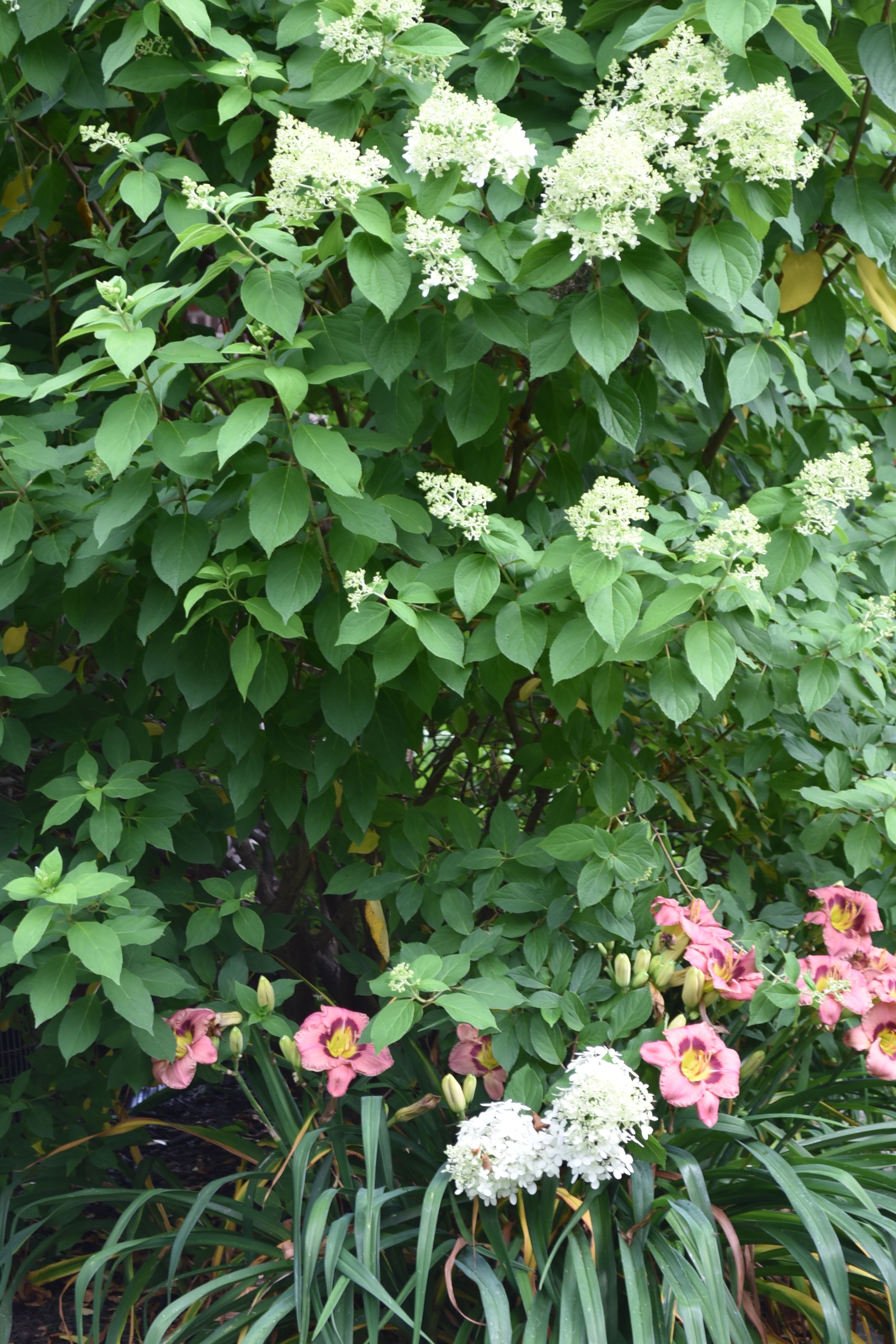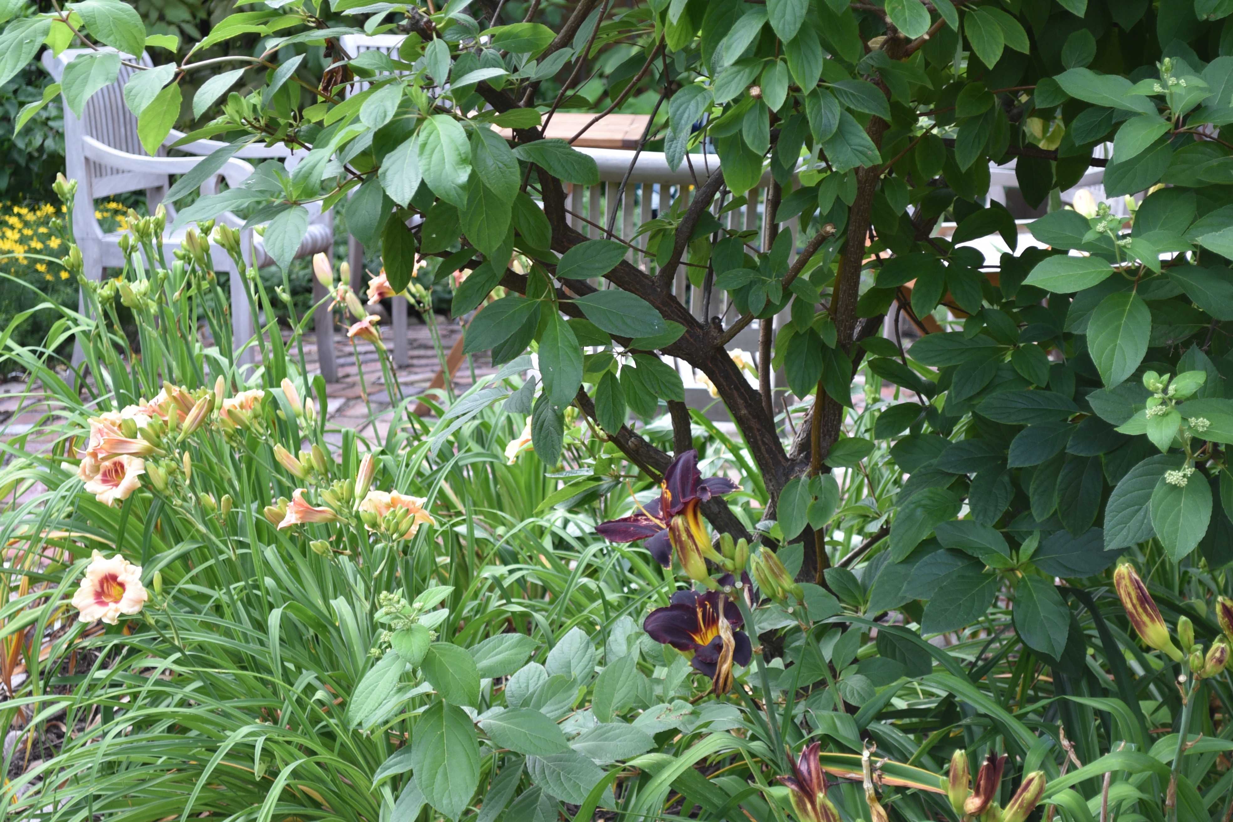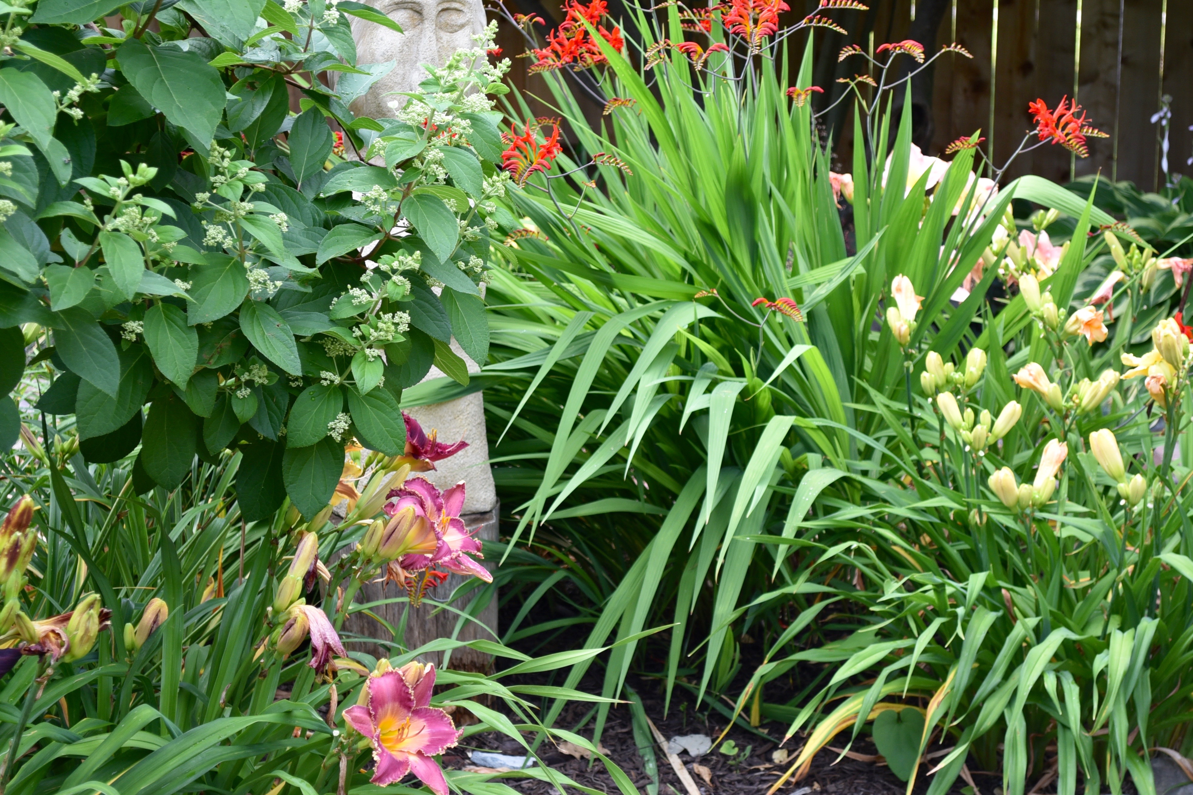 Sweet William, marigolds, and Walker’s Low Catmint in the little nook between the sun room and dining room.White Dome Hydrangea, hardy geranium, and Zagreb Coreopsis in the lower garden. I almost yanked the coreopsis early this spring but am so glad I didn’t.This is my new “lewd” hosta bed. At the moment the euphorbia and rose campion can stay, but as soon as the new hostas mature those two plants are going to need a new spot in the garden. What do I mean by “lewd?” This bed includes Seducer, Obscene Gesture, Naked Lady, Stiletto, Midnight at the Oasis, Boys Toy, She’s Got the Moves…You get the ideaThis Wild Spice Hansa rose is on its second bloom cycle. This shrub rose give off such a wonderful fragrance.Limelight hydrangea and Rosie Returns day lily in the lower garden.Knock Out rose in the rose medallion.I clumped a bunch of pots together so that the in-ground sprinkling system could water them while I was at a conference. I haven’t moved them back to their original spots and kind of like all the riot of color they bring to the rose medallion. That is Endless Summer hydrangea in the background.Walker’s Low Catmint with Annabelle Hydrangea at the entrance to the Secret Garden.Just inside the Secret Garden is Kim’s Knee High Echinacea next to Annabelle.It’s day lily season!! Rosie Returns is putting on quite a show, but it’s not the only one. Next to Rosie Returns is Moonlight Coreopsis and Zagreb.First Knight, the yellow day lily to the right, is one of my favorites. To the left is Sea Urchin. And, the crocosmia is doing its wonderful scarlet thing.I keep thinking that I have gotten all of Pandora’s Box day lilies out of the Secret Garden, but I am continually wrong. Next to Pandora’s Box is my nameless dark, dark red day lily.Echinacea from a garden buddy with Fragrant Angel Echinacea.Sea Urchin day lily in the Secret GardenThe Garden Lady is surrounded by crocosmia and day lilies.First KnightRosie ReturnsStokesiaThis is one of my favorite spots in the garden. Great Expectations has finished blooming, but Stained Glass has new scapes and will bloom in a week or so. To the left are Cherry Berry and Allegan Fog.That’s Deep Blue Sea on the left with Creamscicle just to its right. Little Aurora is in the foreground.Crocosmia.Fragrant Angel EchinaceaGrosso lavender and pink echinacea. I’m looking forward to seeing and smelling the asiatic lilies that are in bud.I have an ever-growing love of native pollinators like bumble bees and am so pleased that so many native bee species visit my gardens.A pretty little bend in the path in the Secret Garden.New this season is White Pow Wow echinacea.