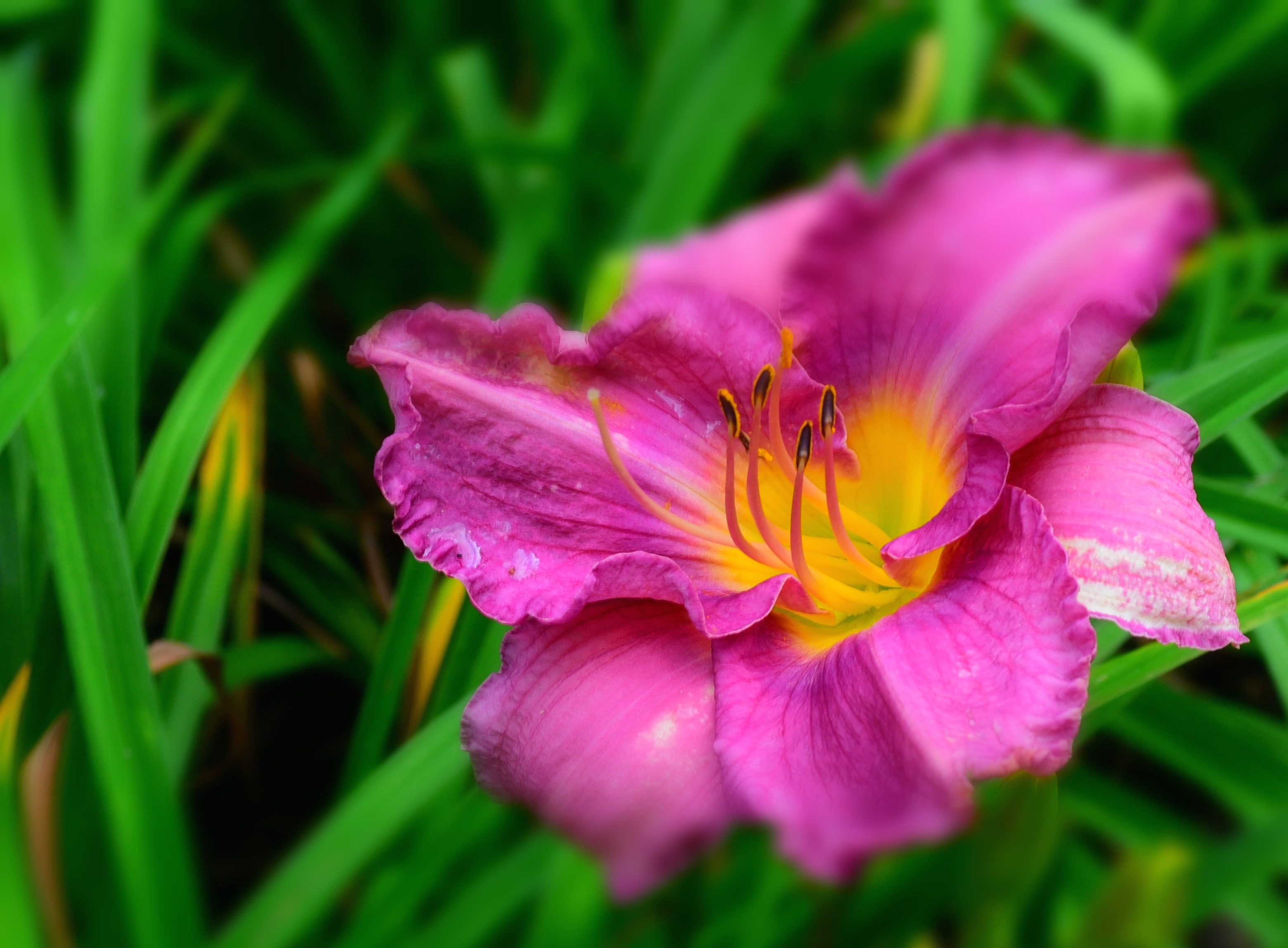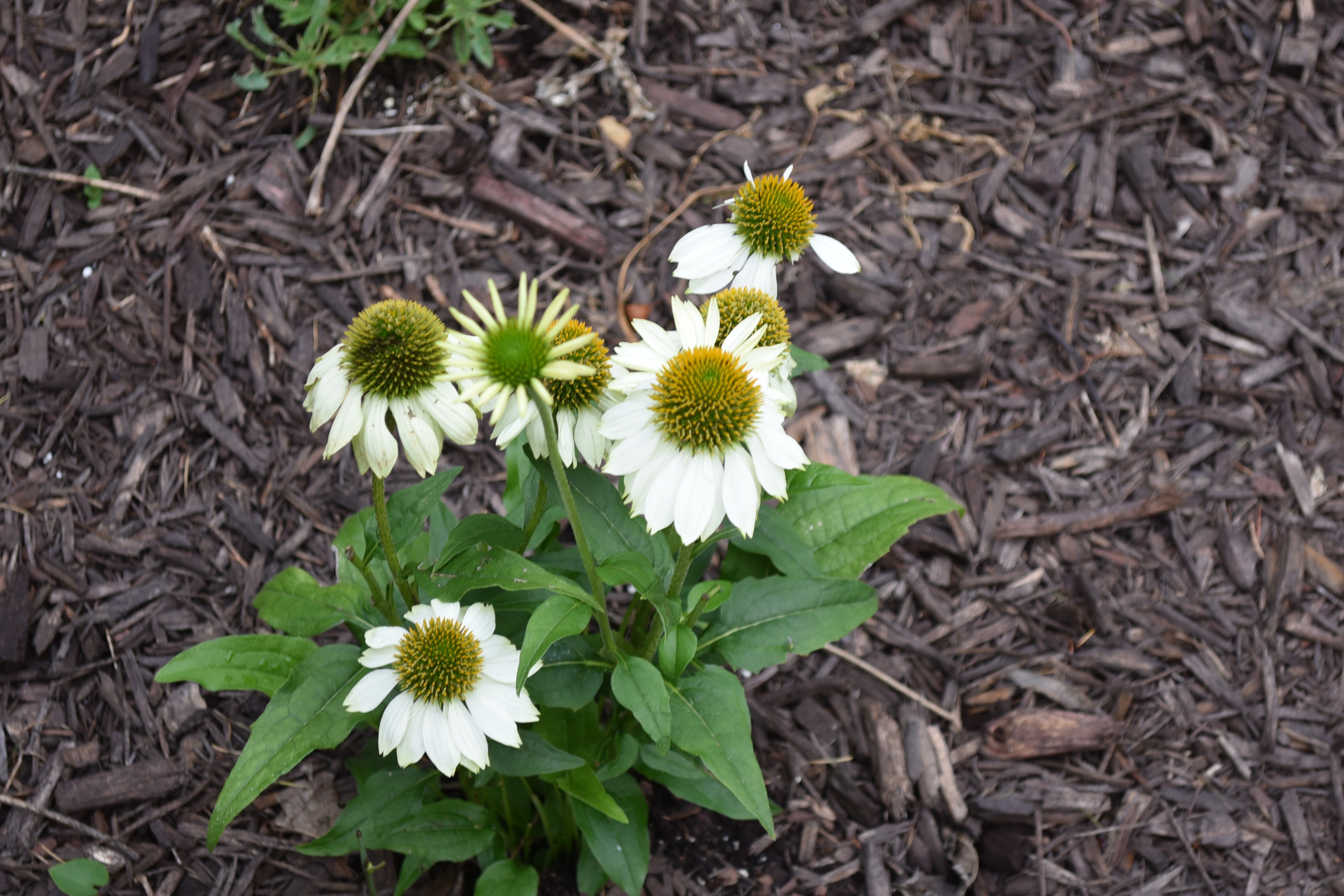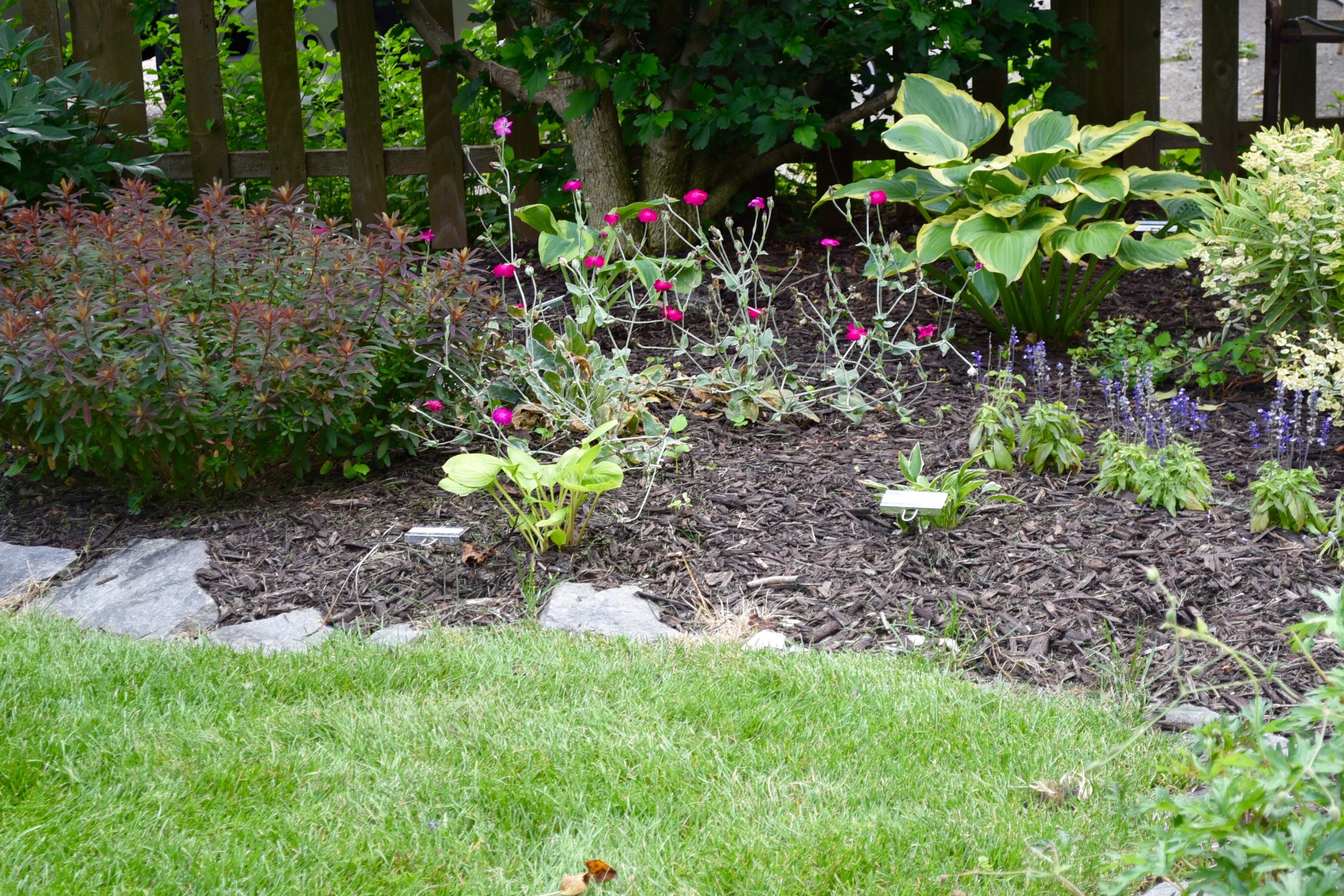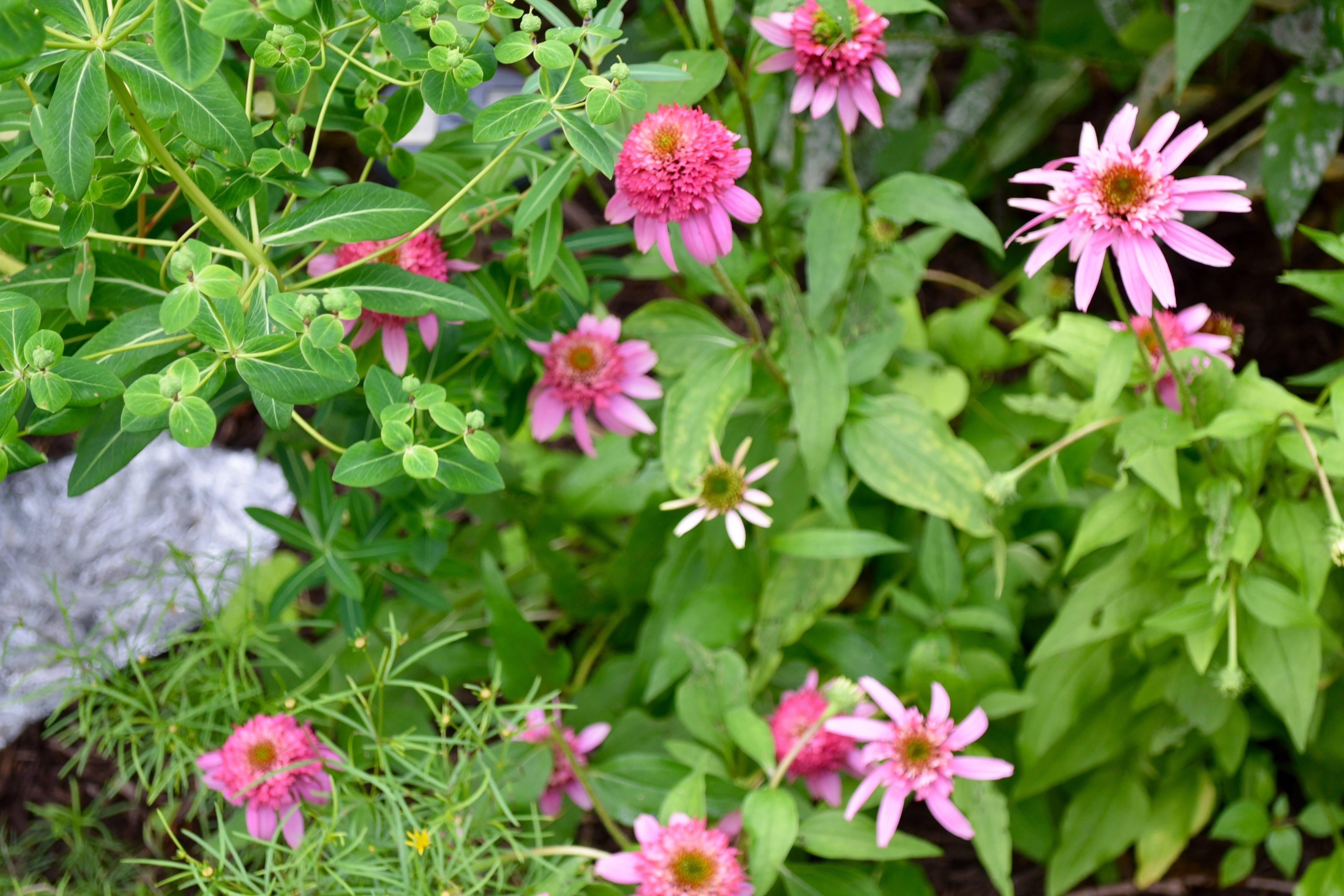 Sweet William, marigolds, and Walker’s Low Catmint in the little nook between the sun room and dining room.White Dome Hydrangea, hardy geranium, and Zagreb Coreopsis in the lower garden. I almost yanked the coreopsis early this spring but am so glad I didn’t.This is my new “lewd” hosta bed. At the moment the euphorbia and rose campion can stay, but as soon as the new hostas mature those two plants are going to need a new spot in the garden. What do I mean by “lewd?” This bed includes Seducer, Obscene Gesture, Naked Lady, Stiletto, Midnight at the Oasis, Boys Toy, She’s Got the Moves…You get the ideaThis Wild Spice Hansa rose is on its second bloom cycle. This shrub rose give off such a wonderful fragrance.Limelight hydrangea and Rosie Returns day lily in the lower garden.Knock Out rose in the rose medallion.I clumped a bunch of pots together so that the in-ground sprinkling system could water them while I was at a conference. I haven’t moved them back to their original spots and kind of like all the riot of color they bring to the rose medallion. That is Endless Summer hydrangea in the background.Walker’s Low Catmint with Annabelle Hydrangea at the entrance to the Secret Garden.Just inside the Secret Garden is Kim’s Knee High Echinacea next to Annabelle.It’s day lily season!! Rosie Returns is putting on quite a show, but it’s not the only one. Next to Rosie Returns is Moonlight Coreopsis and Zagreb.First Knight, the yellow day lily to the right, is one of my favorites. To the left is Sea Urchin. And, the crocosmia is doing its wonderful scarlet thing.I keep thinking that I have gotten all of Pandora’s Box day lilies out of the Secret Garden, but I am continually wrong. Next to Pandora’s Box is my nameless dark, dark red day lily.Echinacea from a garden buddy with Fragrant Angel Echinacea.Sea Urchin day lily in the Secret GardenThe Garden Lady is surrounded by crocosmia and day lilies.First KnightRosie ReturnsStokesiaThis is one of my favorite spots in the garden. Great Expectations has finished blooming, but Stained Glass has new scapes and will bloom in a week or so. To the left are Cherry Berry and Allegan Fog.That’s Deep Blue Sea on the left with Creamscicle just to its right. Little Aurora is in the foreground.Crocosmia.Fragrant Angel EchinaceaGrosso lavender and pink echinacea. I’m looking forward to seeing and smelling the asiatic lilies that are in bud.I have an ever-growing love of native pollinators like bumble bees and am so pleased that so many native bee species visit my gardens.A pretty little bend in the path in the Secret Garden.New this season is White Pow Wow echinacea.