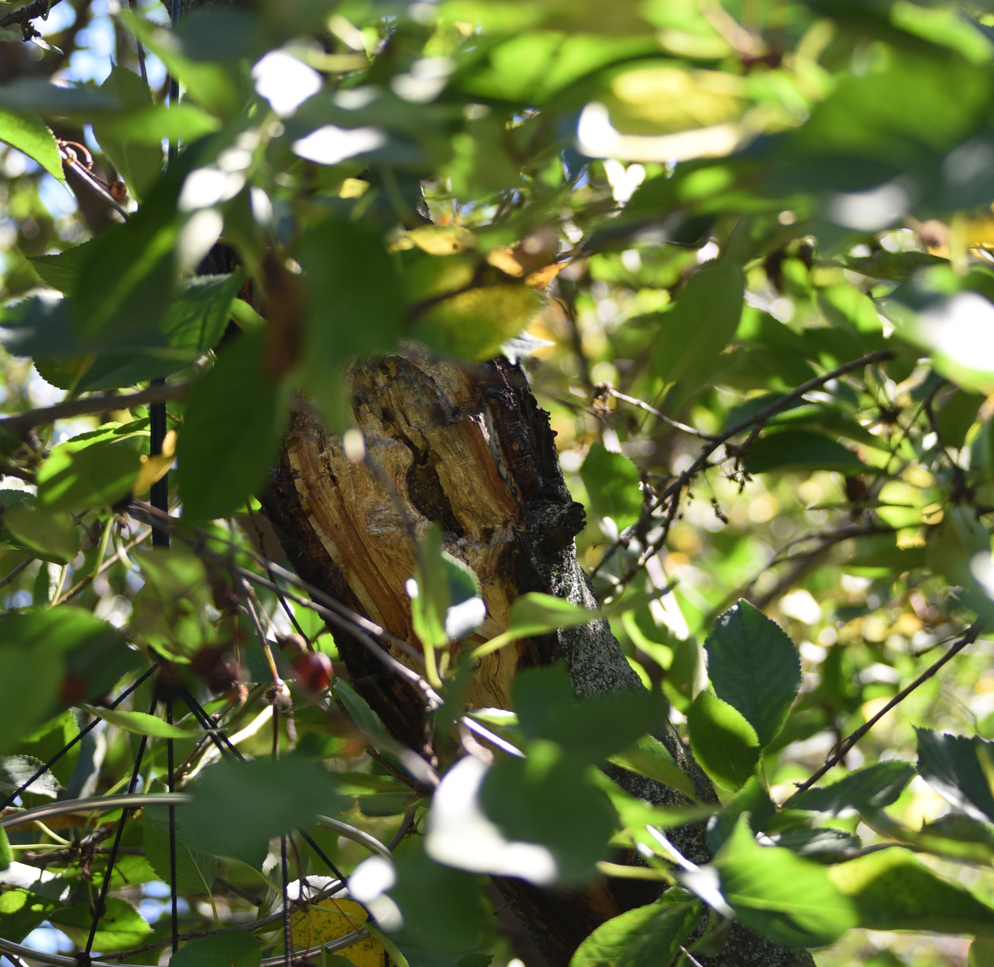 It arrived within a few days and when I was hanging it in the cherry tree, I looked for other places in the tree that might house mason bees and other wild native bees. Sure enough, I saw one going into a round hole in a scar where a large limb had fallen the summer before. Cherry trees limbs sometimes snap under the weight of fruit. No one has set up housekeeping in my solitary bee house, but it went in late, probably after prime egg-laying season. My hope is that next year a few females will find it attractive enough to lay eggs. I have noticed some sweat bees flitting in and out, but I think that is more about curiosity than house hunting.