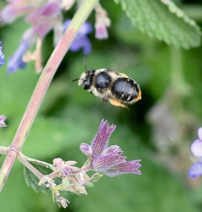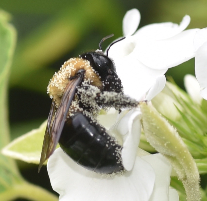 They get their name because they chew off sections of leaves and use them to partition off spaces, much like mason bees do with the mud they create. They, too, carry dry pollen on the hairs of their bellies. Pollination occurs when the pollen from one flower is dropped on another. They are also not aggressive.
