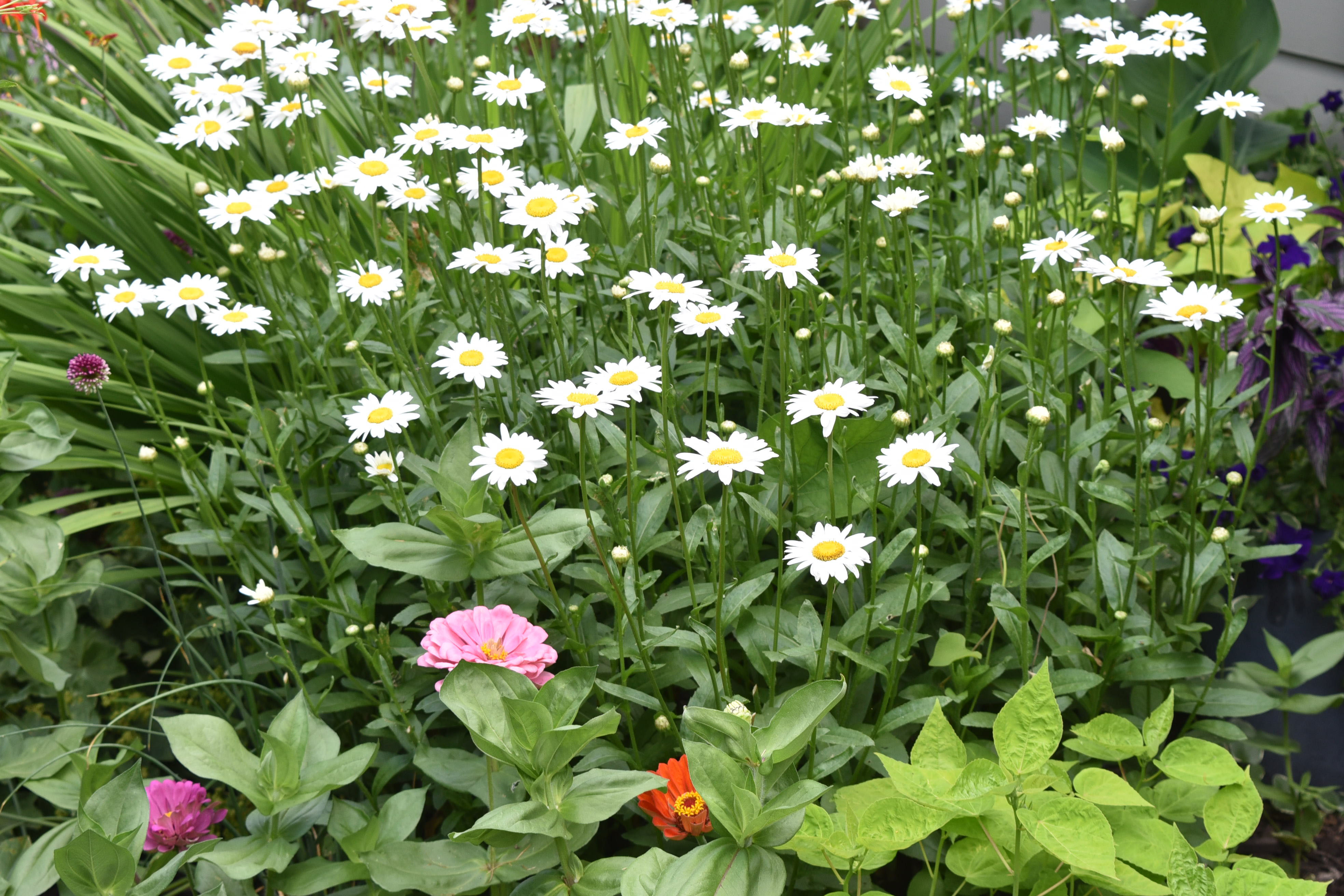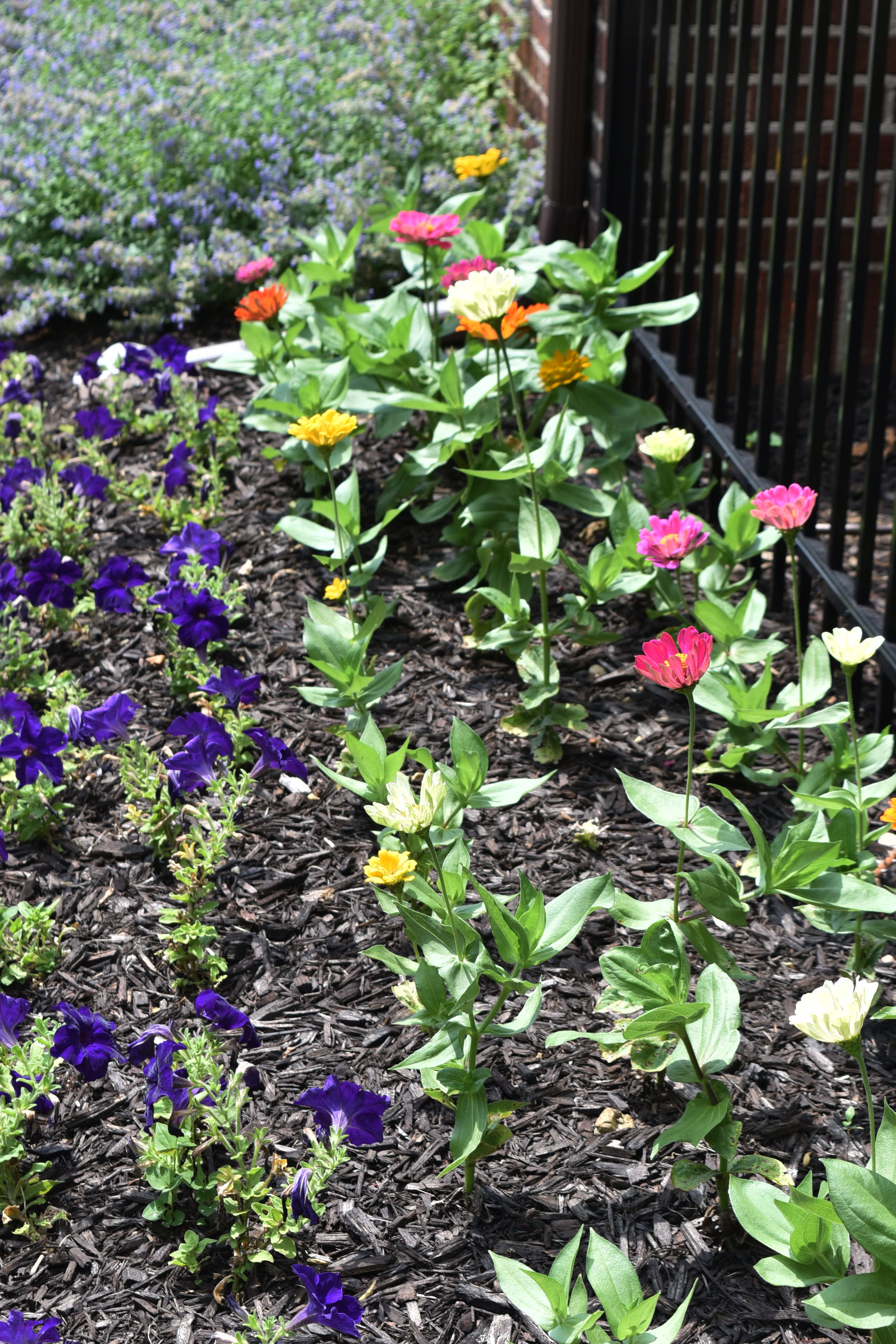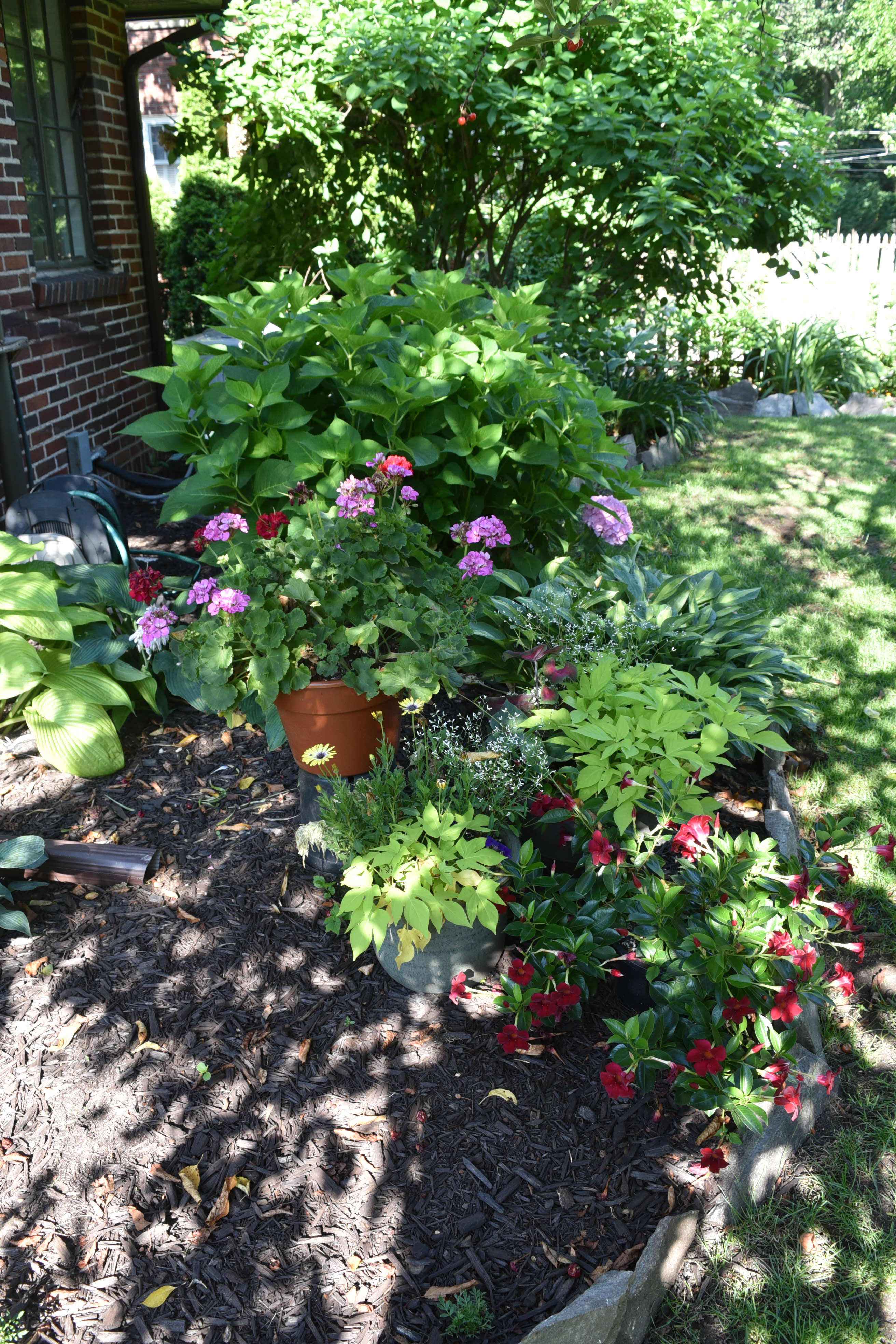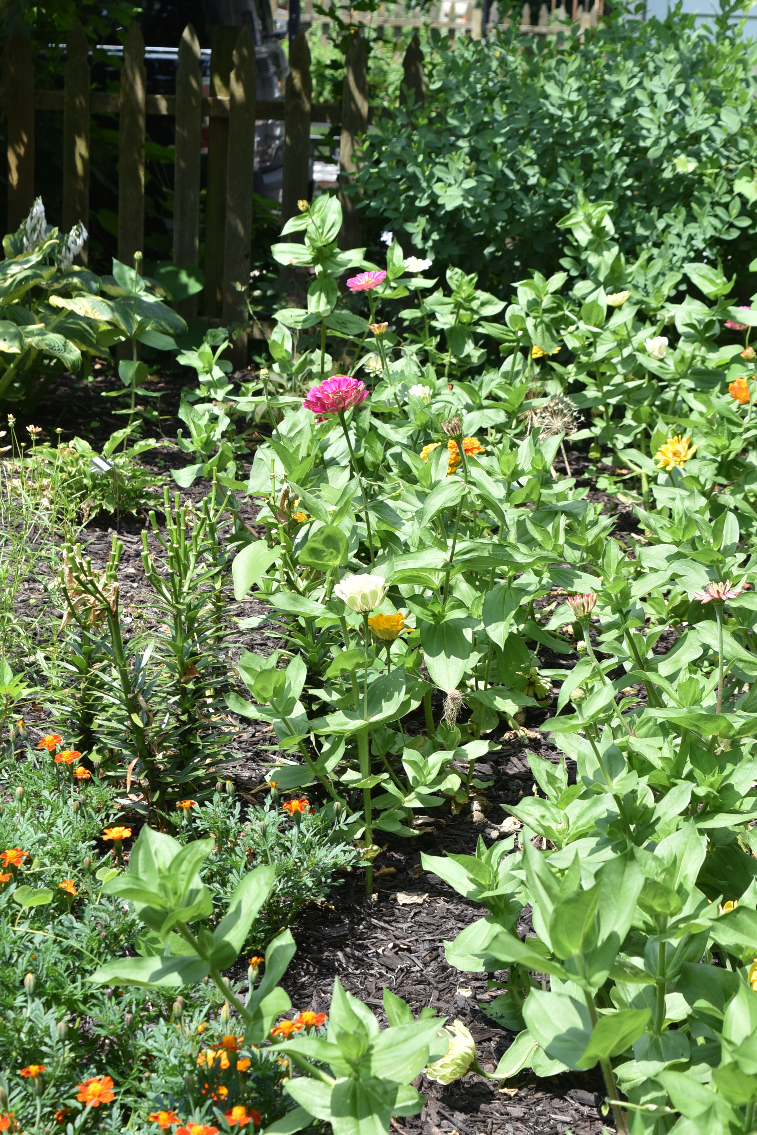 The zinnias and shasta daisies are bloomin’ their little brains out. And the purple petunias are filling in. I always plant purple petunias because of their vanilla fragrance. They are especially fragrant in the evening. My new fence has forced me to re-imagine my in-ground watering system. I have pots searching for water and I keep misjudging where the spray is. I’ve turned the system on a bunch of times for just a minute so I can inspect the spray pattern, but, I’ve still got pots that aren’t getting enough water.