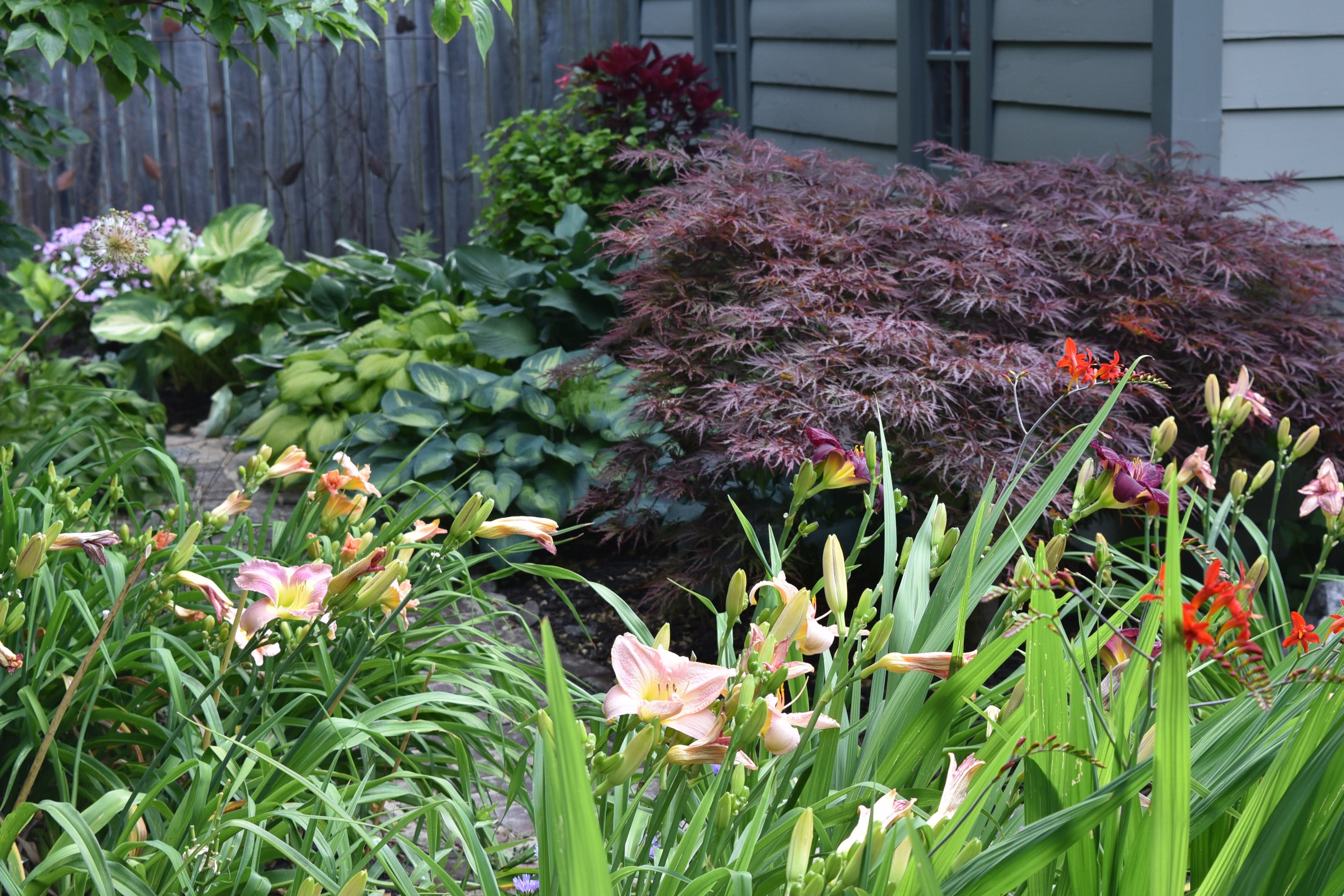 July always means day lilies. And deadheading. I wasn’t sure how the day lilies would take to a young standard poodle on the rampage. She has trampled some of them, but they really need to be moved anyway. The tardiva hydrangea is casting too much shade. Finding a new spot for those will be a fall project. The pictures above show First Knight (yellow), Strutter’s Ball (dark pink), and the ever wonderful scarlet crocosmia in the background. The peach is Kathy Perkins.