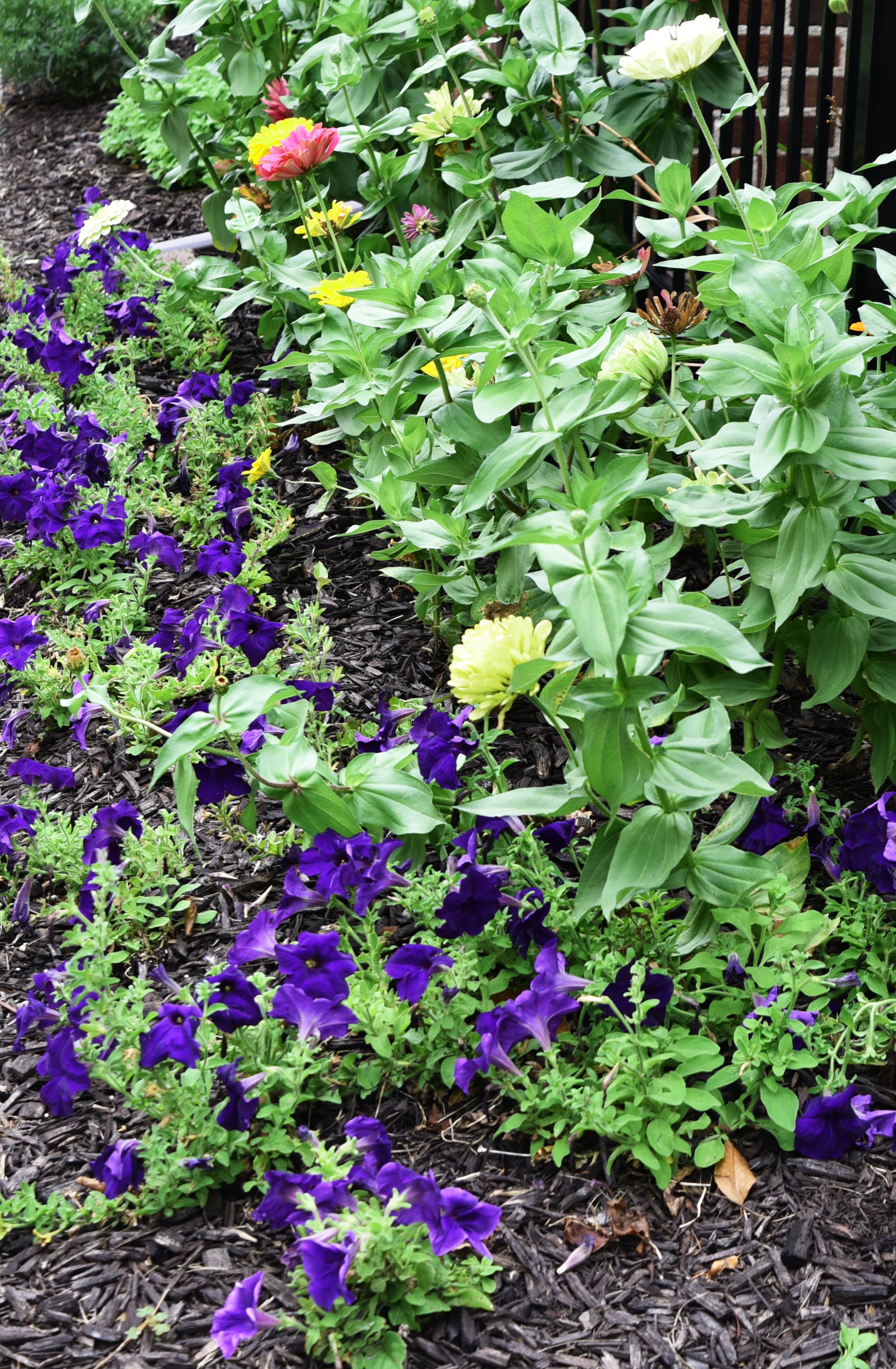 The first set of pictures are of the Lower Garden. Most of the color comes from the annuals, but a the hydrangeas provide food for pollinators and graceful blooms. Or, rather, Limelight provides blooms. The Endless Summer hydrangea gave me one pink bloom. I suspect it was pruned too vigorously this past spring. The Rose of Sharon is turning out its usual lovely blossoms that will turn to seed pods that will turn into a zillion little sprouts that will have to pulled out. Or not pulled out until they form little trees. Oy. The little brush footed butterfly (I think it is a “staff sergeant”) finds some of the zinnias quite appetizing.