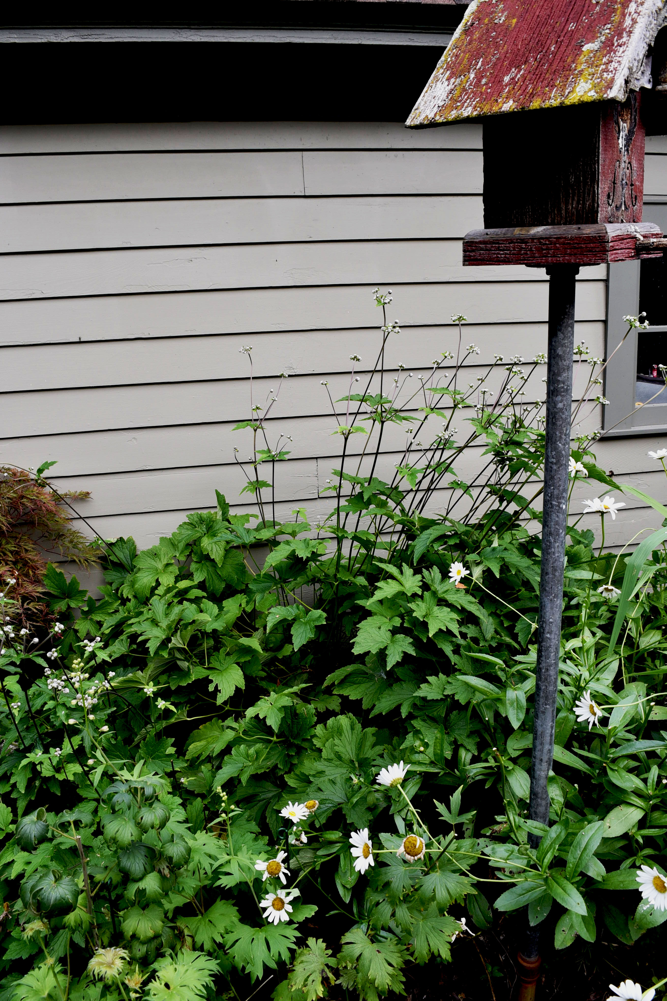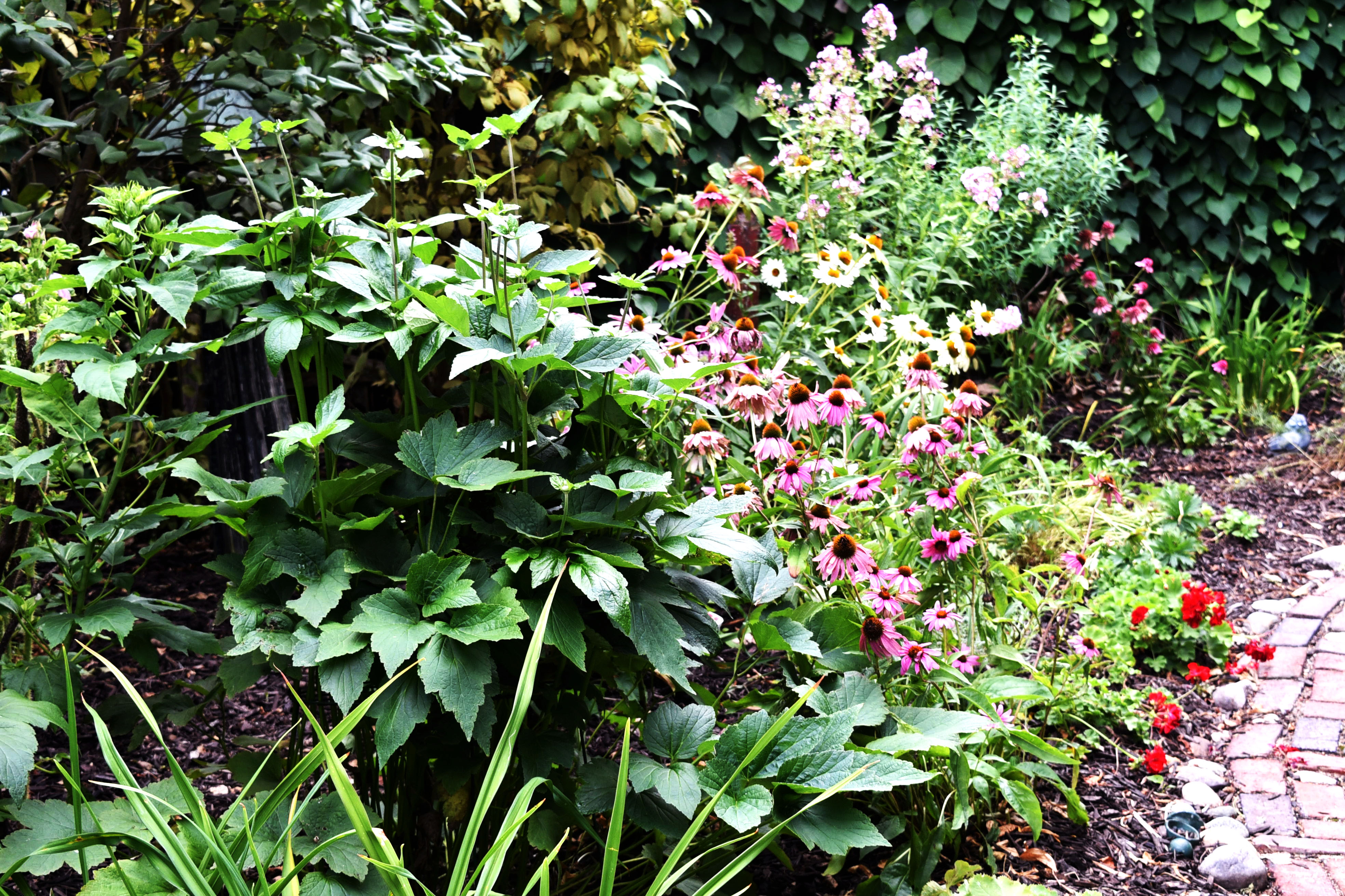 In the Secret Garden the echinacea are in full bloom. I seem to have lost Fragrant Angel to our hard winter, but Pow Wow White is doing well, as are the pink phlox. The daylilies are finished, but the Tardiva hydrangea is providing lots of nectar for the many pollinators that rely on it. Monarchs, swallowtails, bumble and carpenter, mason and leaf cutter bees, as well as several varieties of wasps are regular visitors. In the little bed by the garage a family of house sparrows are busily feeding their latest brood. The daisies are just about finished, but the anemones are getting ready to pop open. And the little hibiscus that I planted a year ago is showing off its saucer sized dark pink flowers. The Rainbow’s End hosta under the Kousa dogwood is blooming. Most hosta blooms are a bit boring, but a few varieties like this one have lovely flowers. The pots of annuals light up some of the more sparse spots in the Secret Garden.