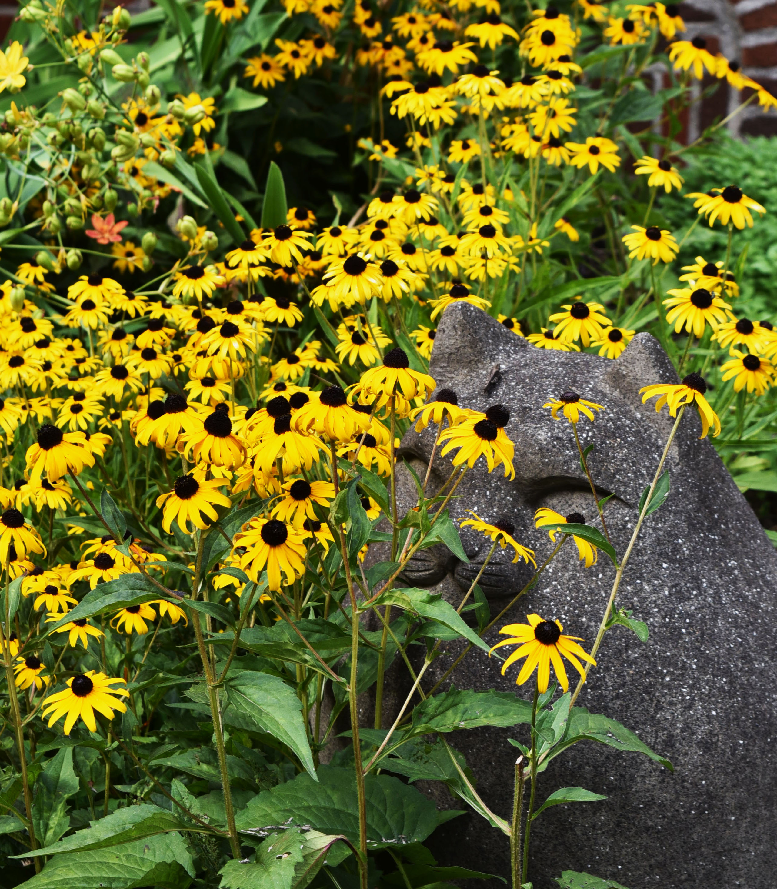 The Entrance Garden greets passersby with an explosion of rudbeckia. The Walkers’ Low catmint was cut way back and is now forming lovely mounds that, I hope, will send out lots of blossoms to feed native bees. In the meantime, they dine on the rudbeckia and the Blackberry Lily. The pots of annuals are starting to show their age.