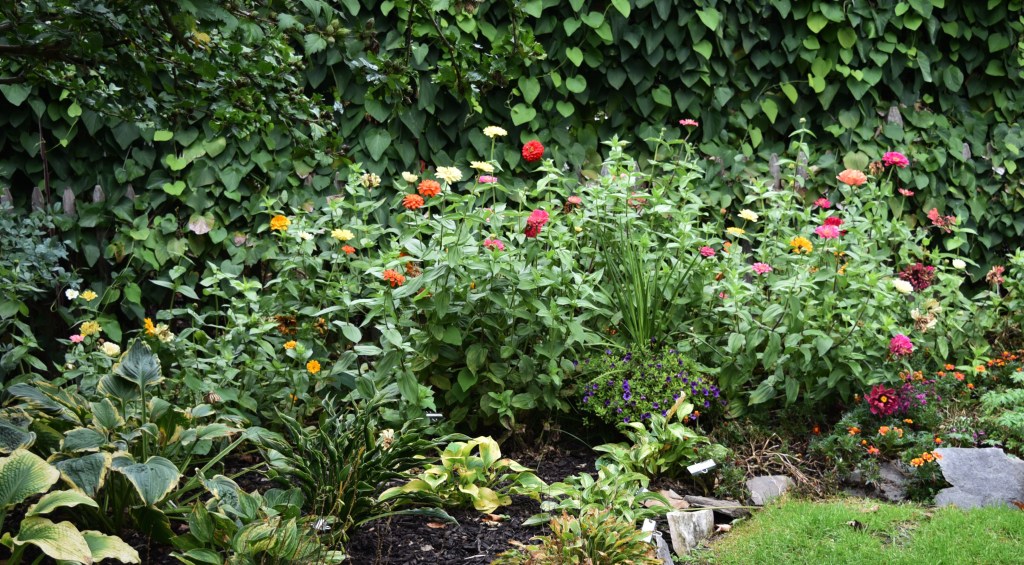 But, as usual, State Fair Zinnias are still kicking out bouquets. I usually plunk a few hosta leaves in the vases with them.