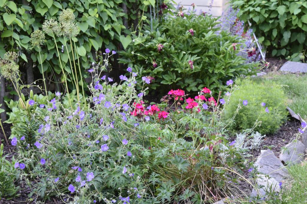 This nicely behaved perennial geranium provides some early color to this spot in the Secret Garden.