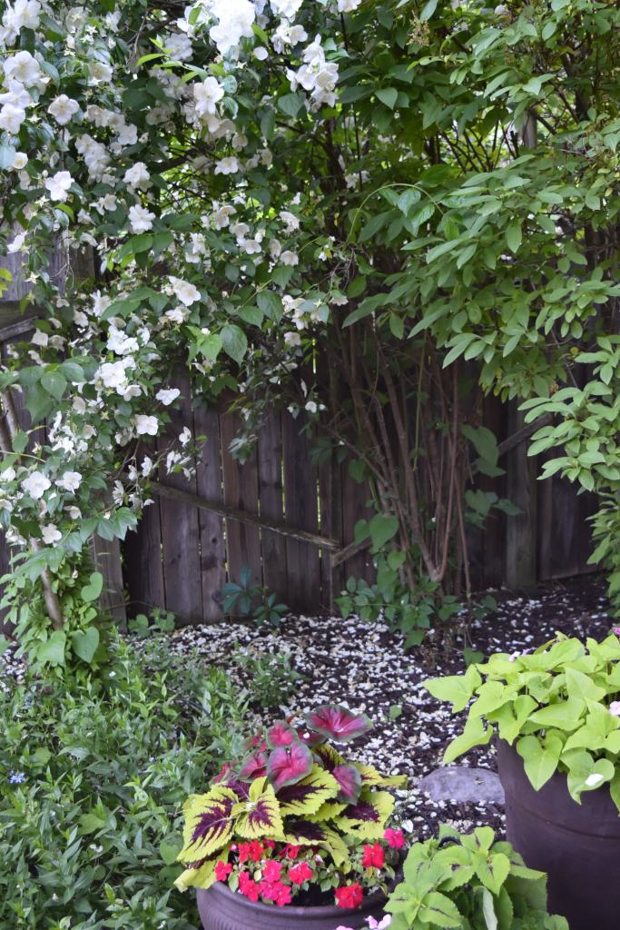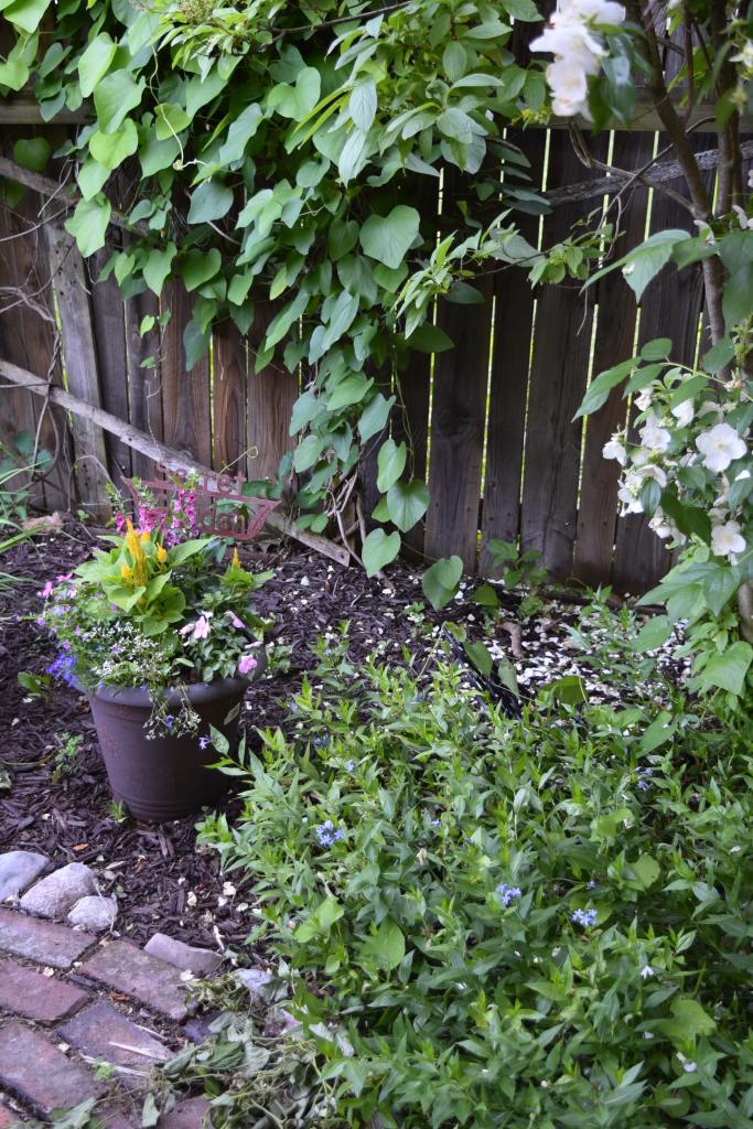 Another pot in the Secret Garden. The Amsonia is just finishing its show. The white “litter” behind it are petals from a mock orange.