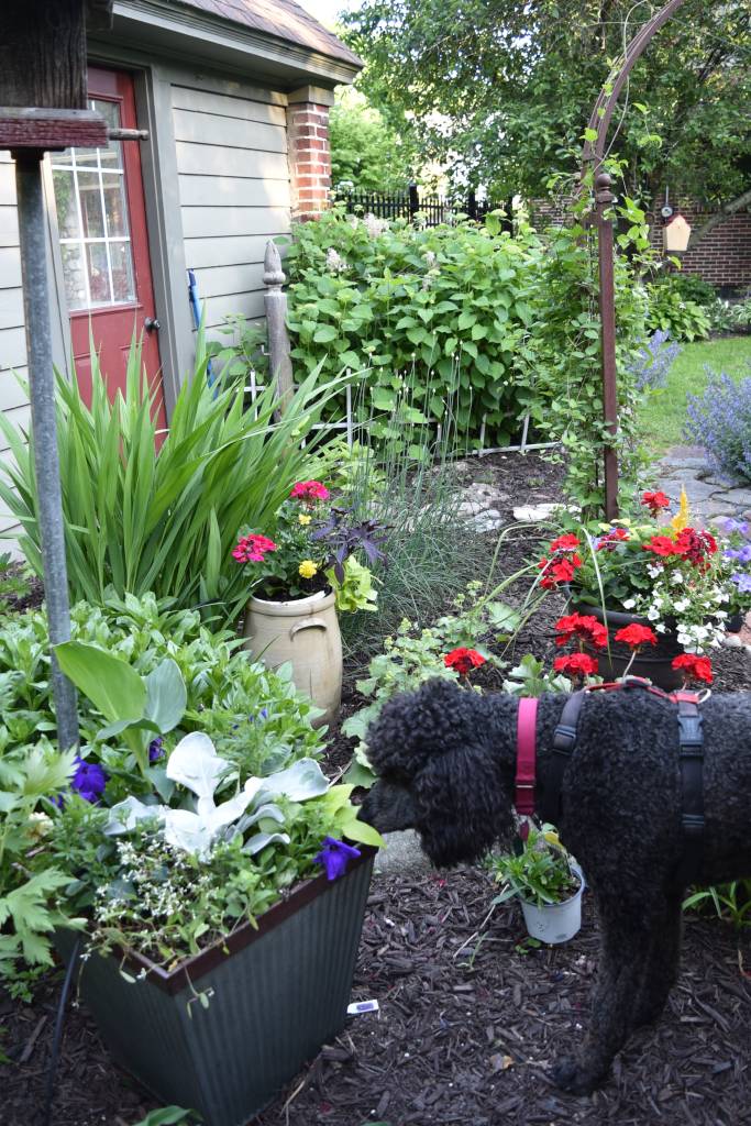 More pots in progress in the Secret Garden. There are two new climbing roses, planted last fall, that survived the winter and are showing off their peachy blooms. Do I know the name of these roses? Of course not. The ability to keep track and label have left me. I blame it on the dogs.
