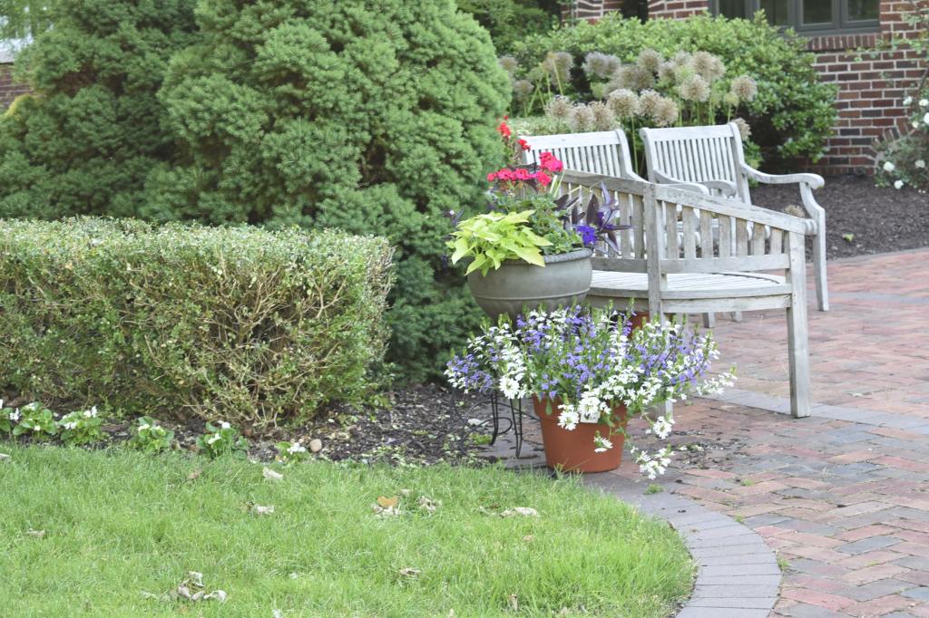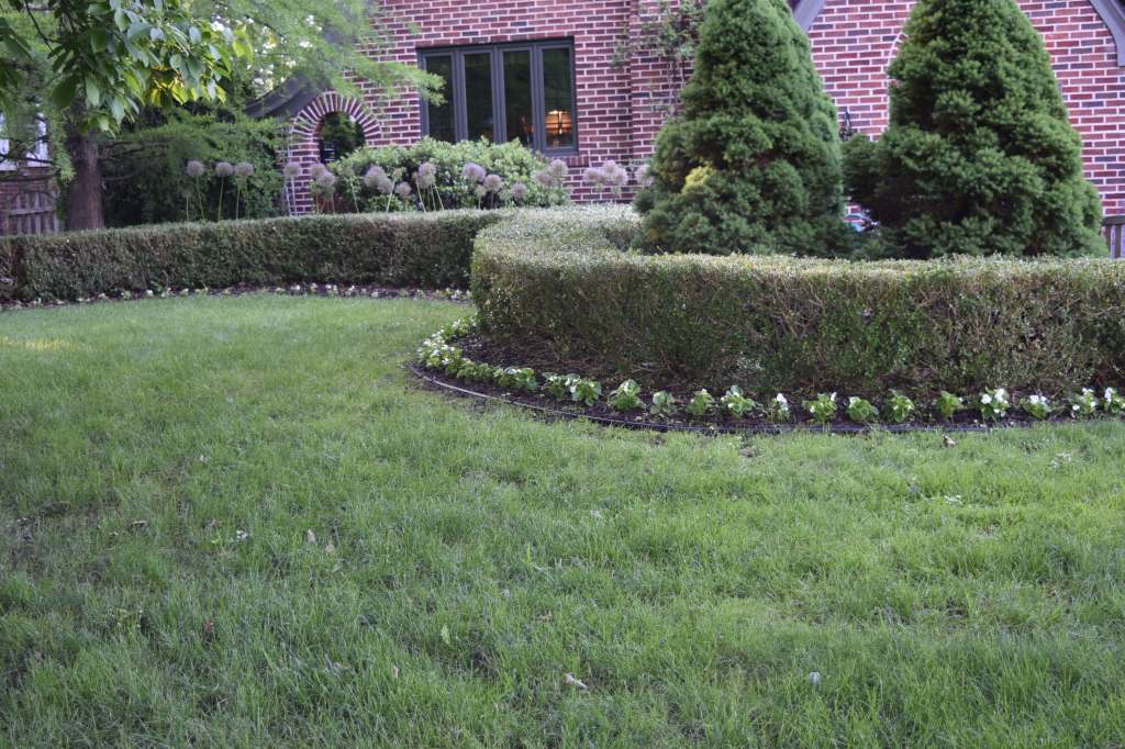 The entrance garden is happy with its containers and the newly trimmed boxwood hedge.